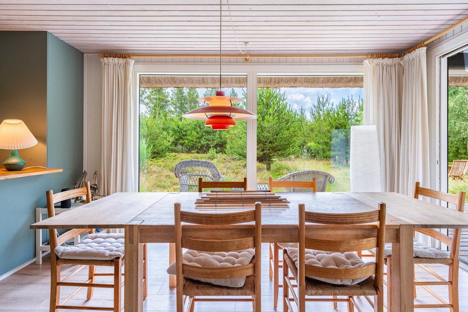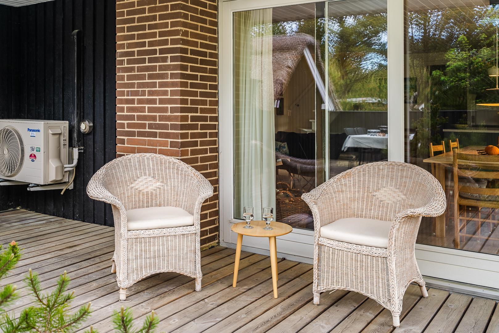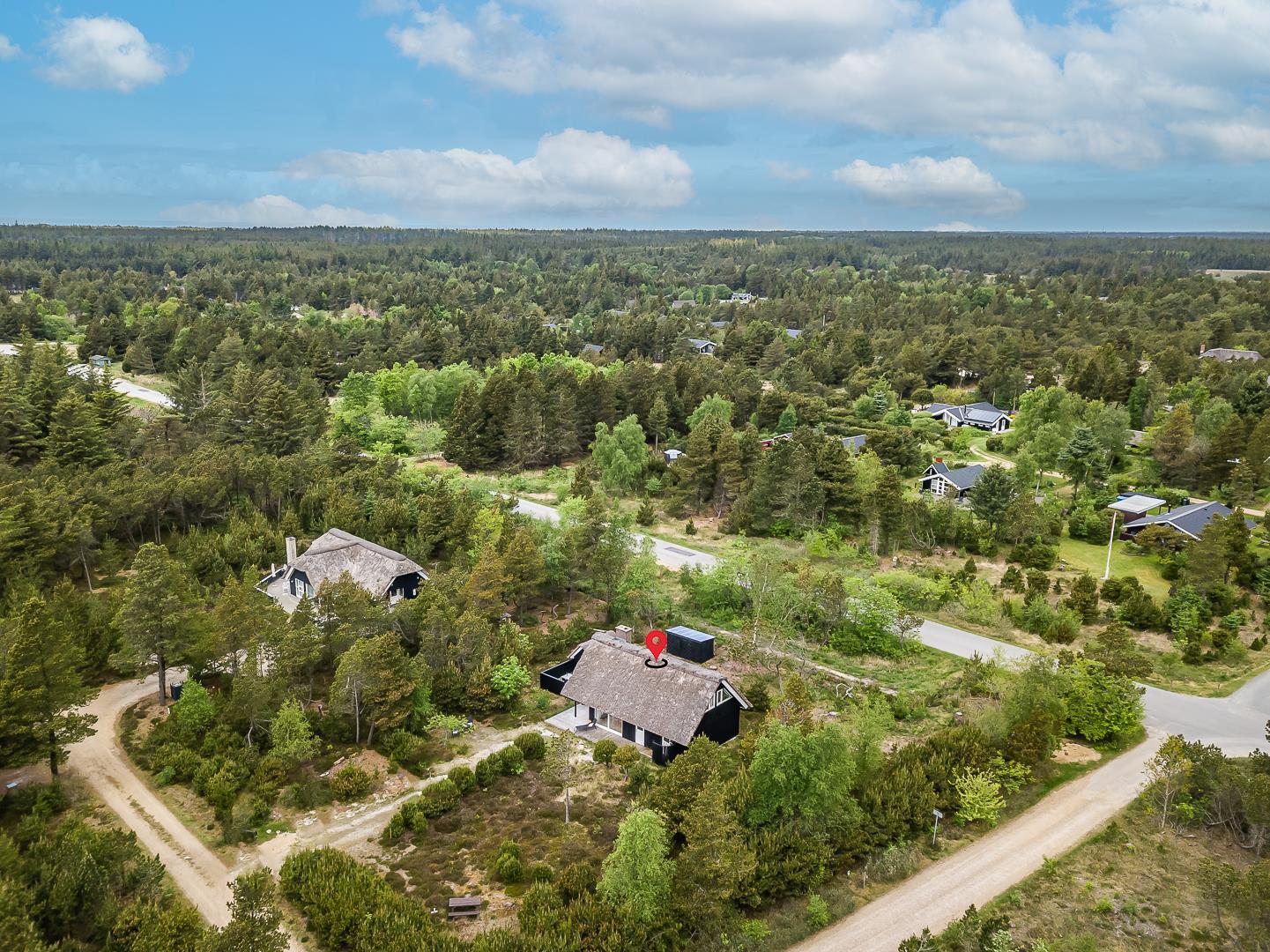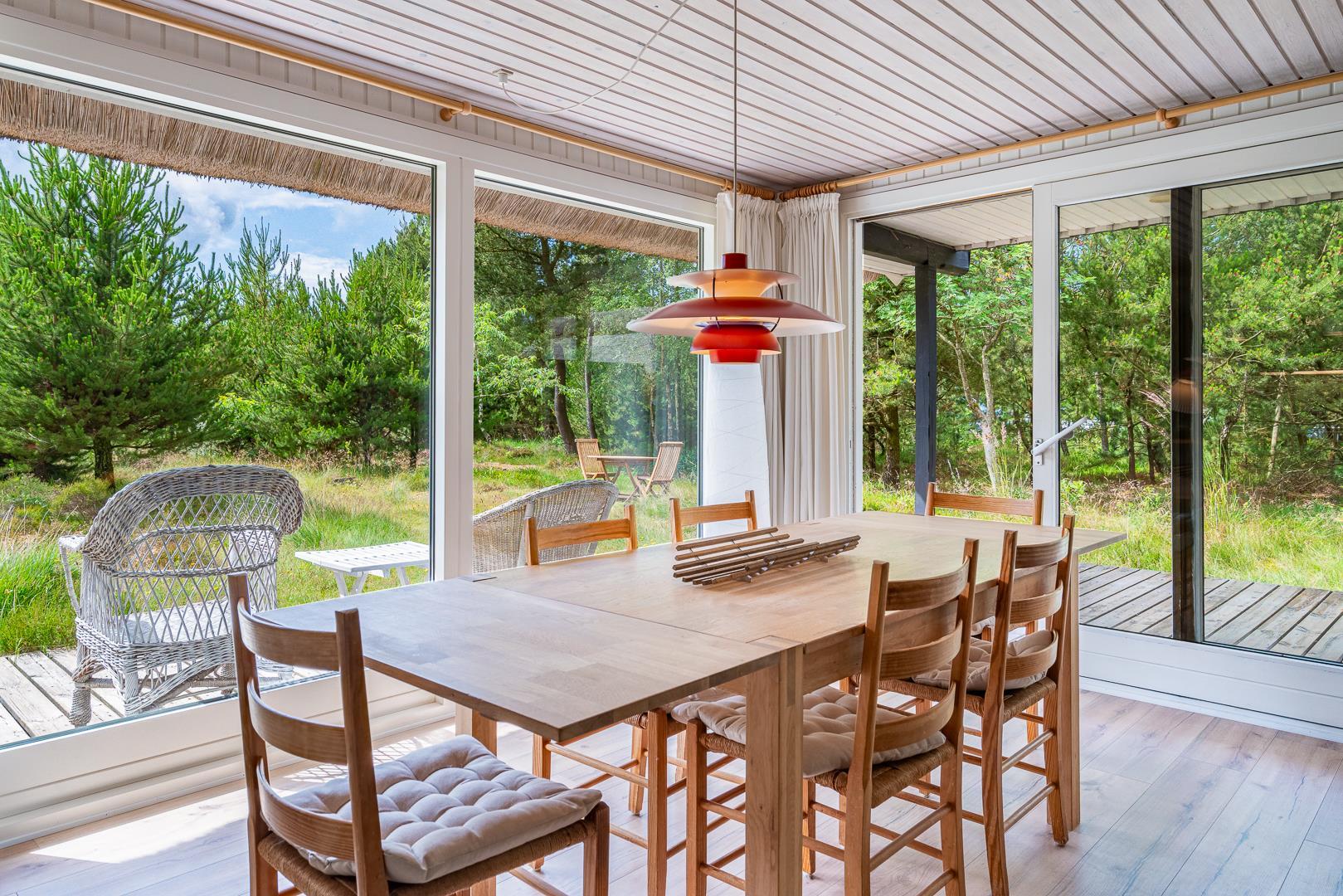 På Peder Larsens vej 2A i Houstrup ligger dette flotte feriehus med stråtag. Stor naturgrund på 2400 kvadratmeter og meget varieret bevoksning. På terrassen er der mulighed for at sidde både afskærmet i åben solgård eller overdækket hvis du trænger til skygge. Der er terrasse omkring størstedelen af huset.
