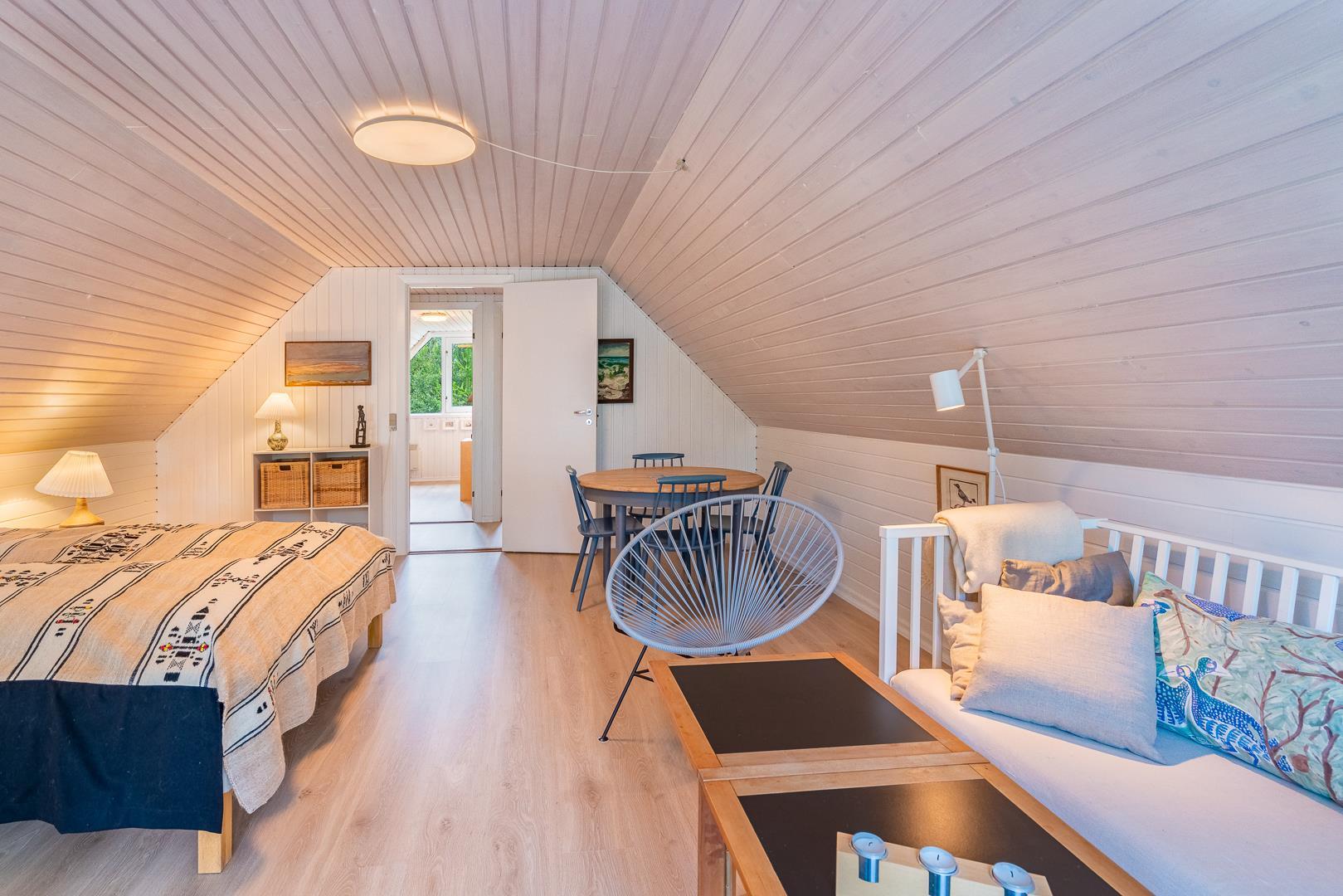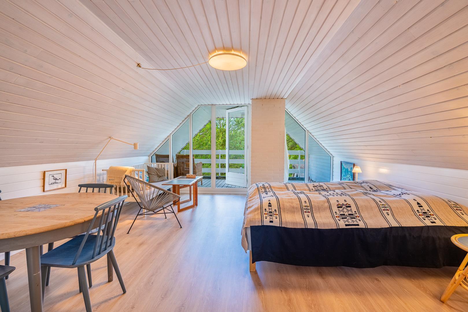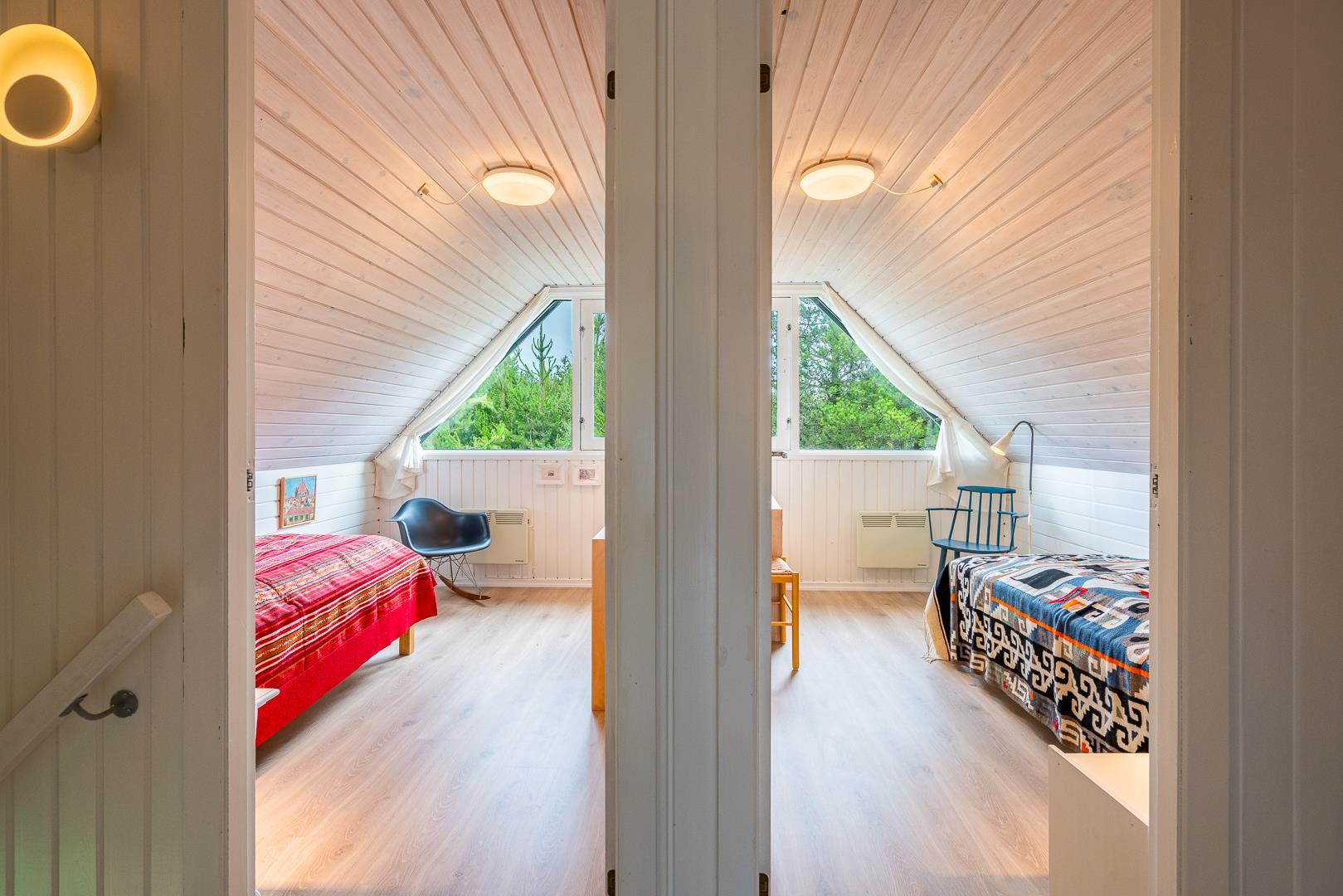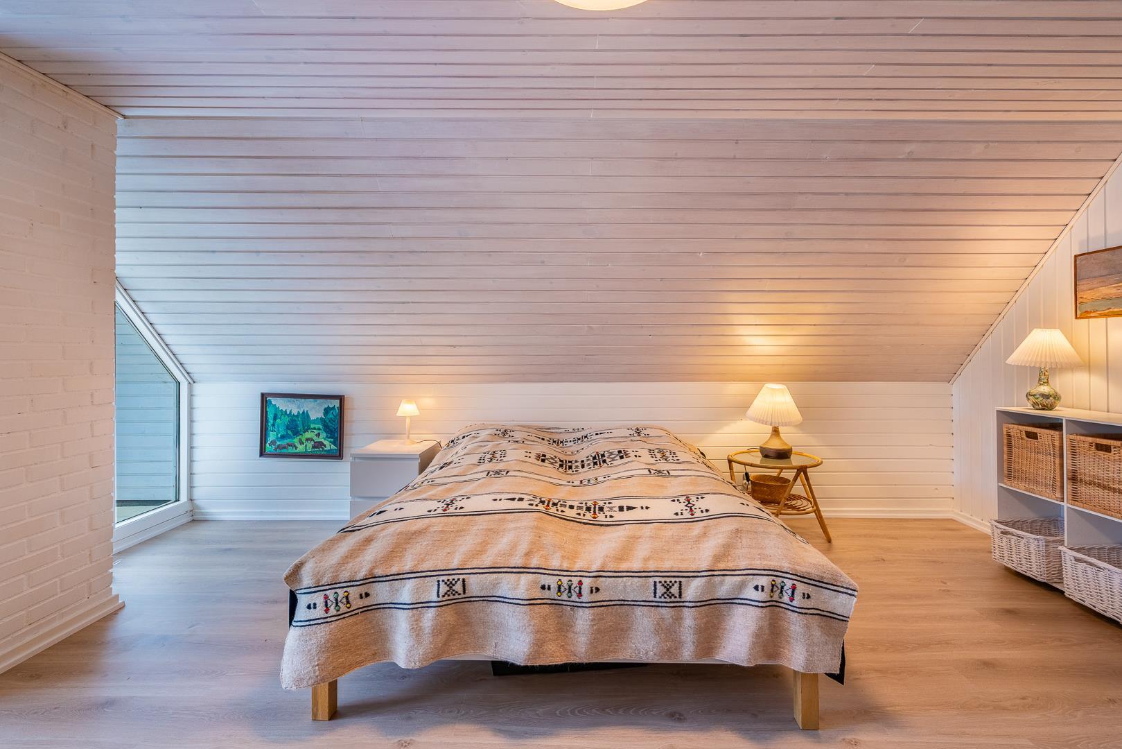 I finder 4 soverum, 2 med dobbeltsenge og 2 med enkeltsenge. På 1. salen, 3 soverum og en opholdsstue med tv. Nyd evt. en drink på balkonen fra det store master bedroom. og se solen gå ned i vest.