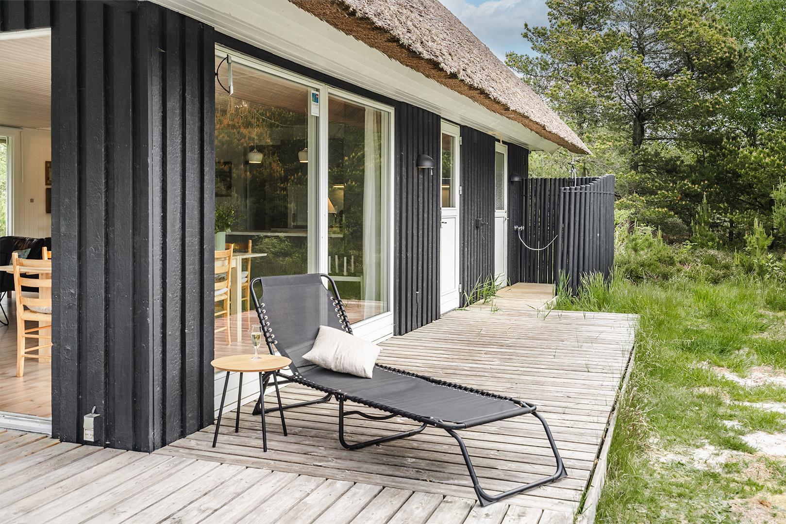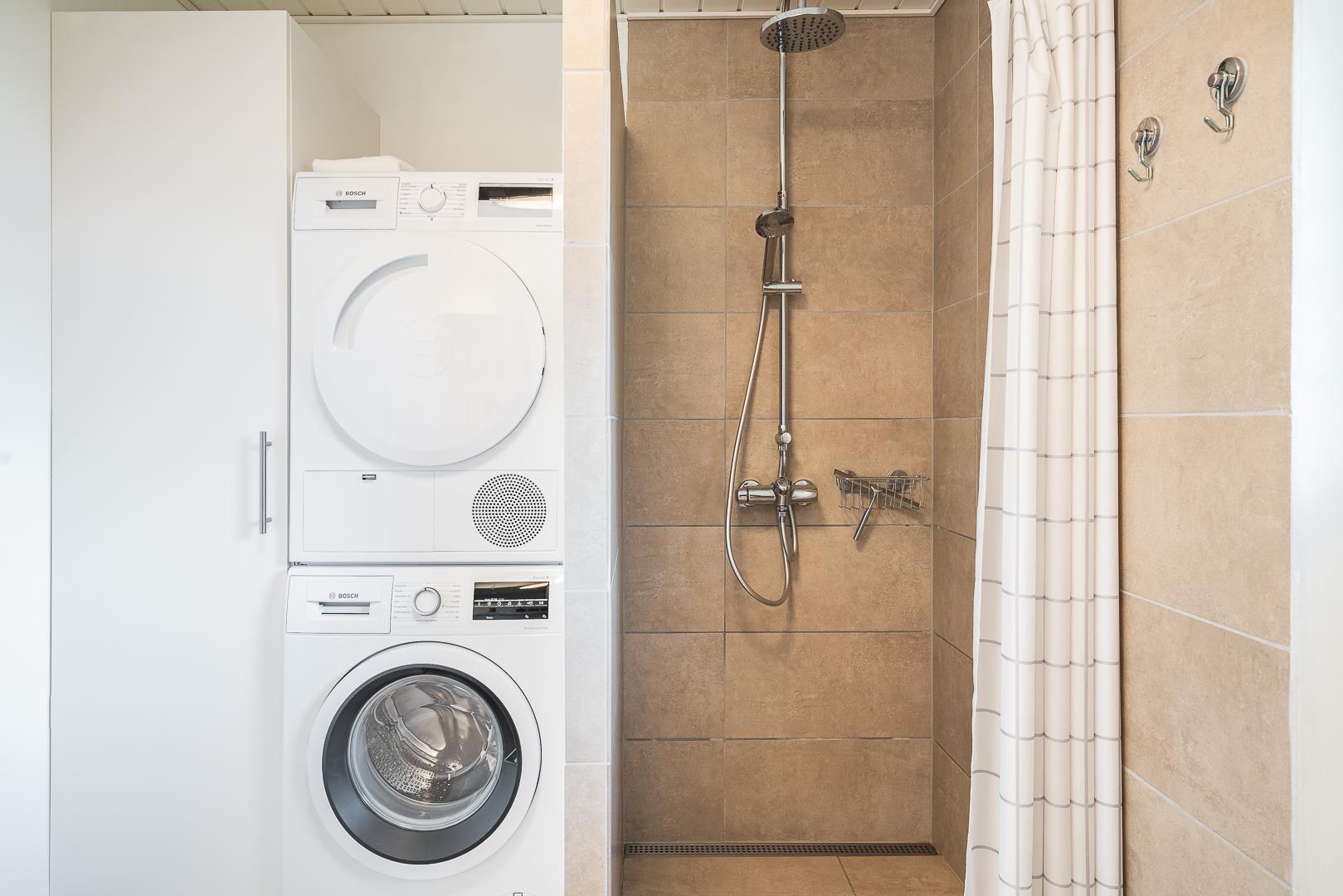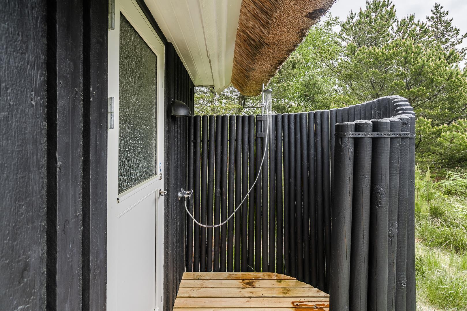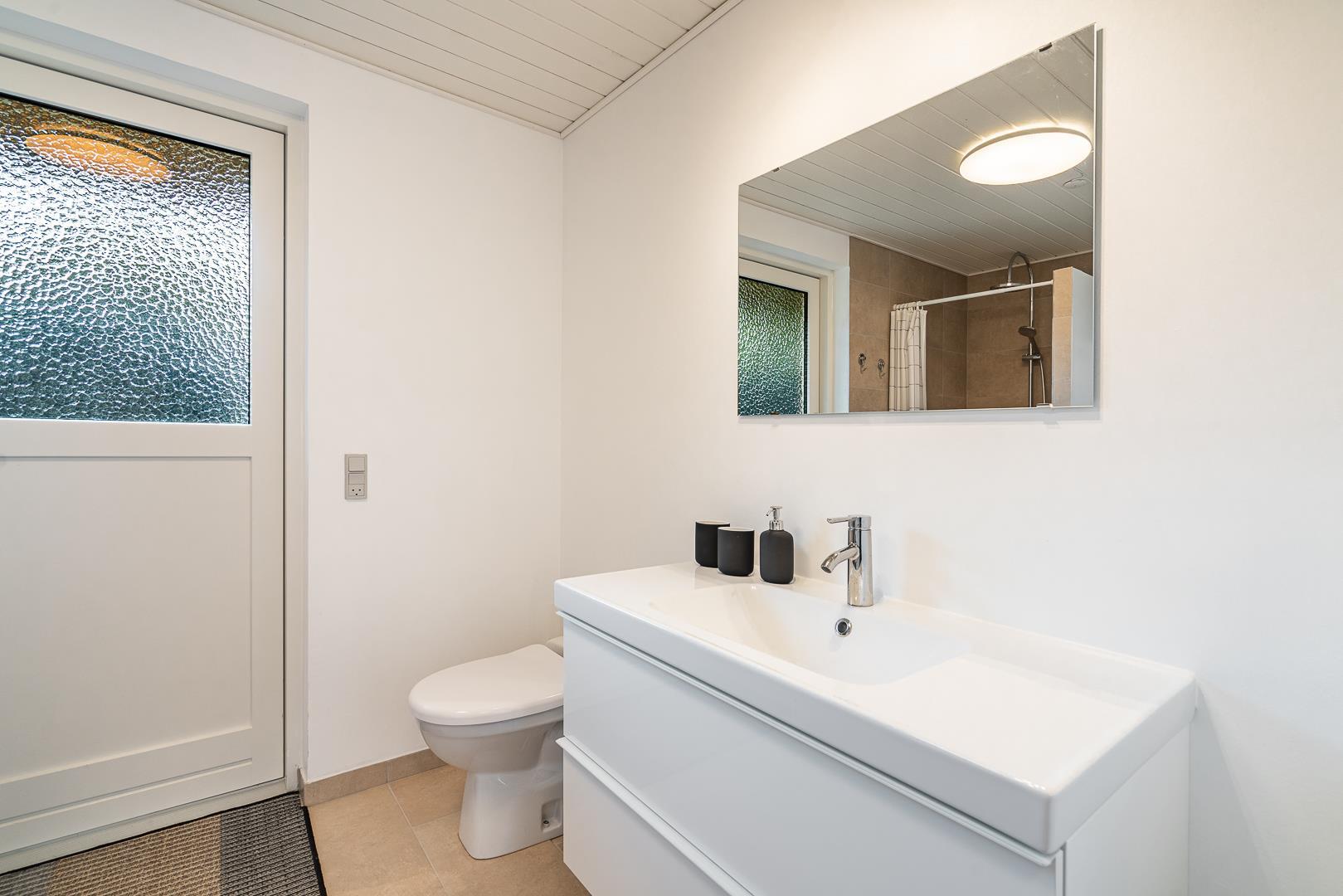 Fra ferieboligens flotte badeværelse fra 2021 og med både vaskemaskine og tørretumbler, har I direkte udgang til udebruseren og et bad på de varme dage.
