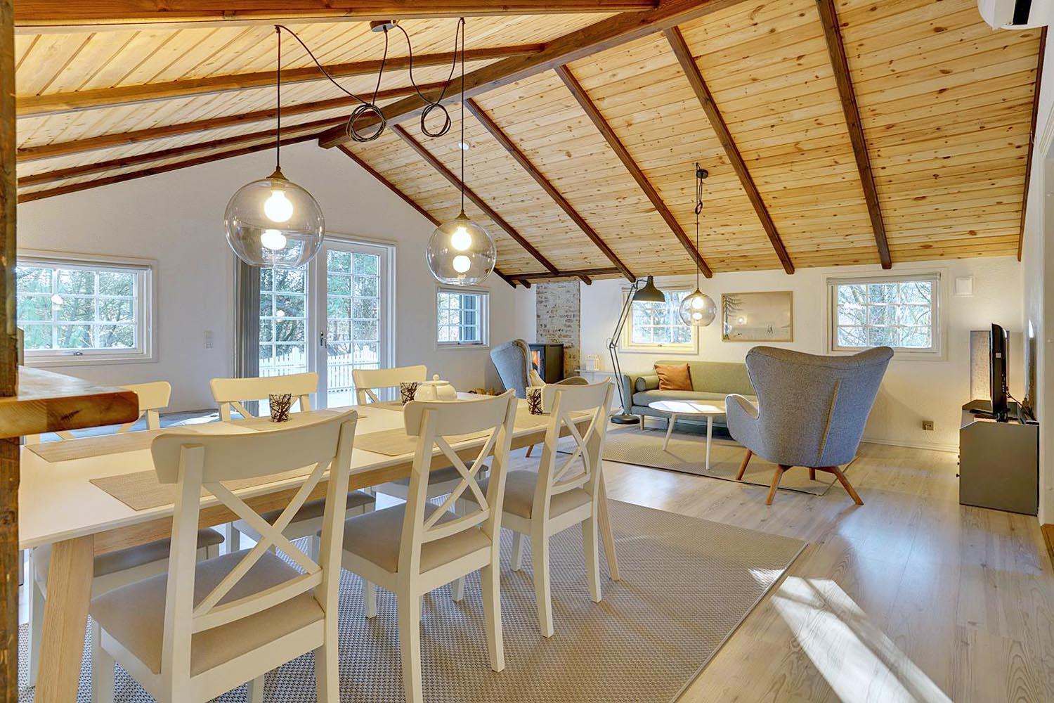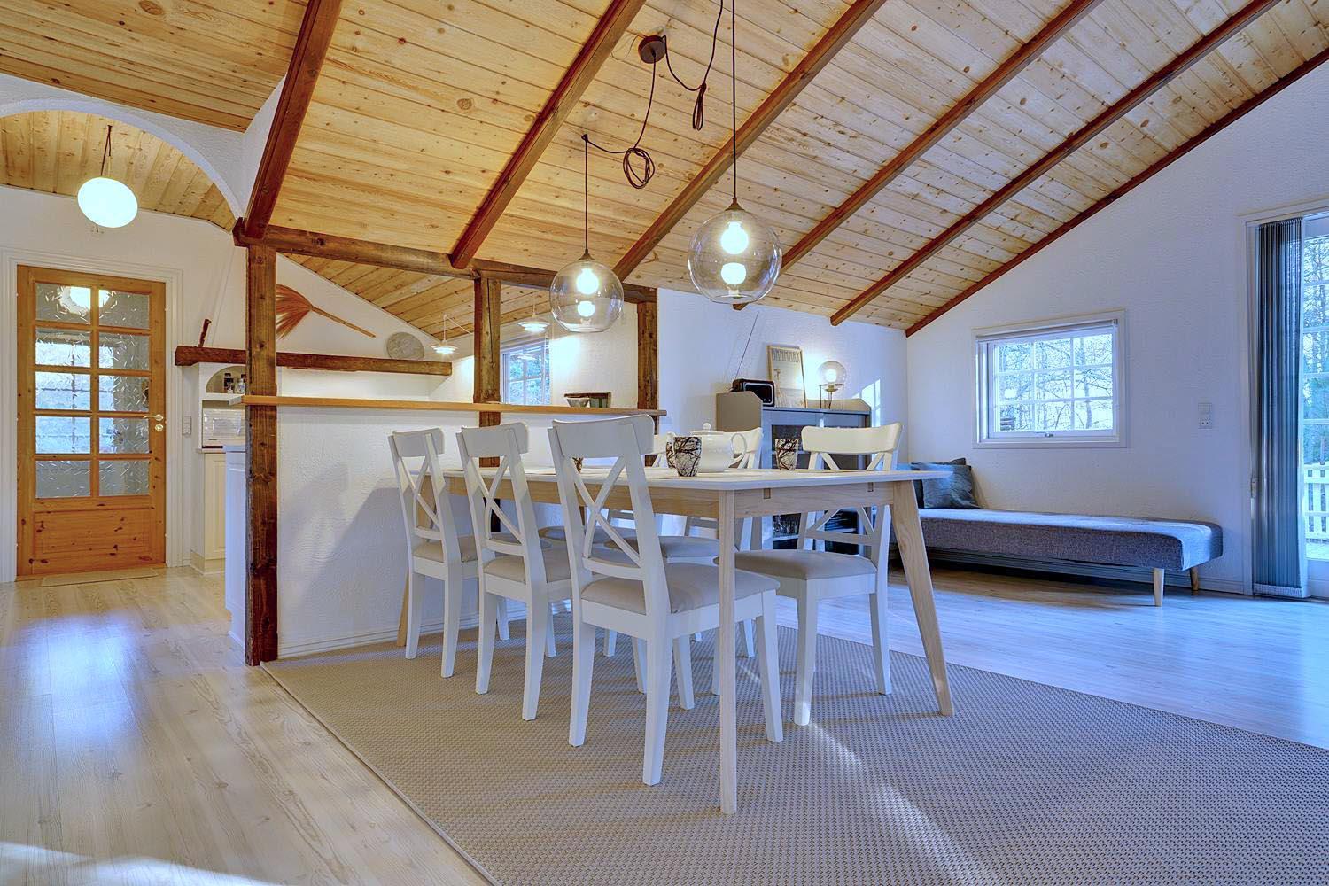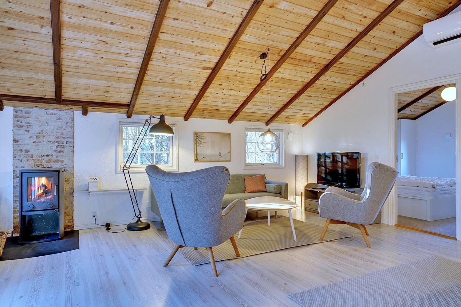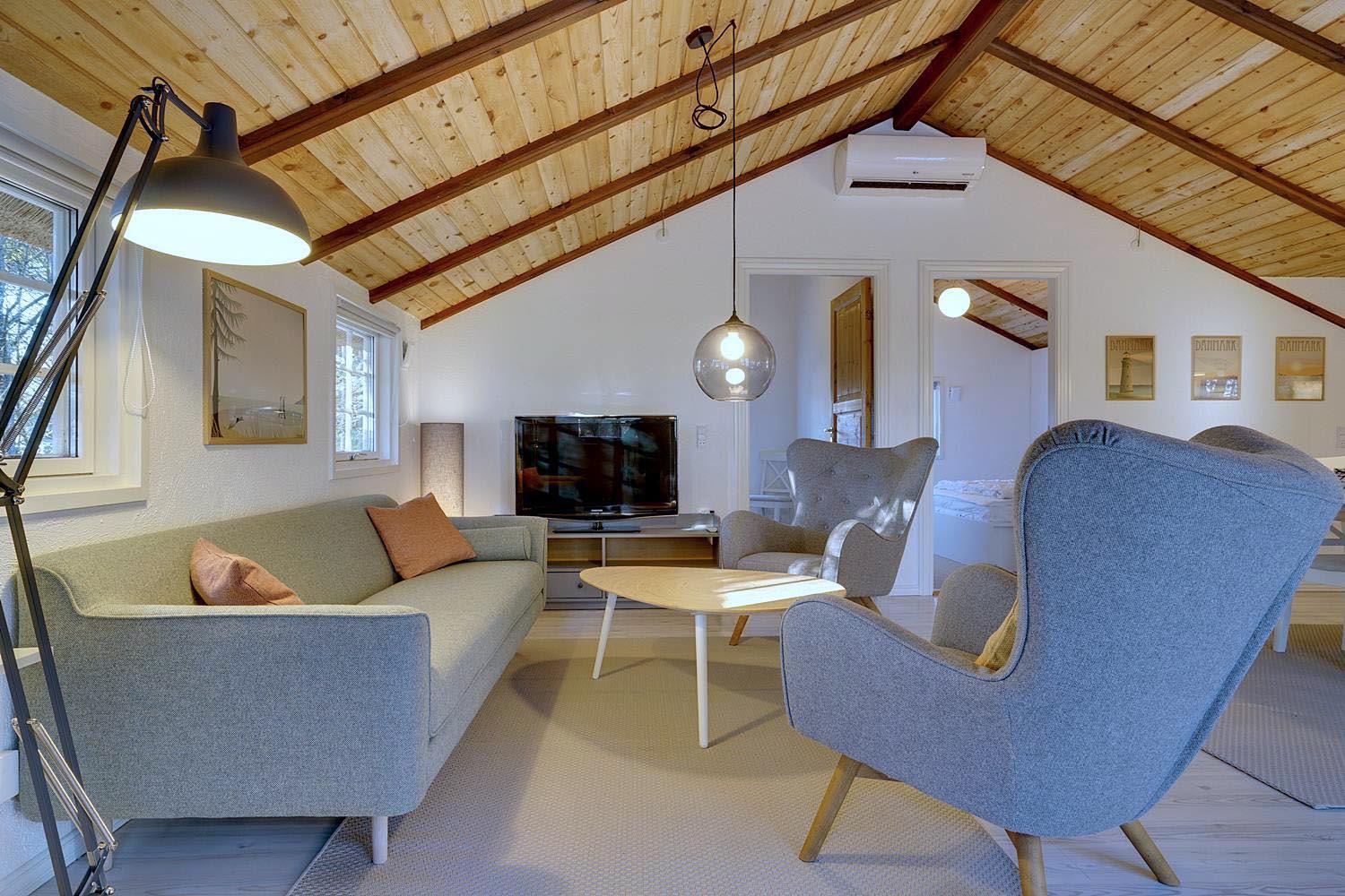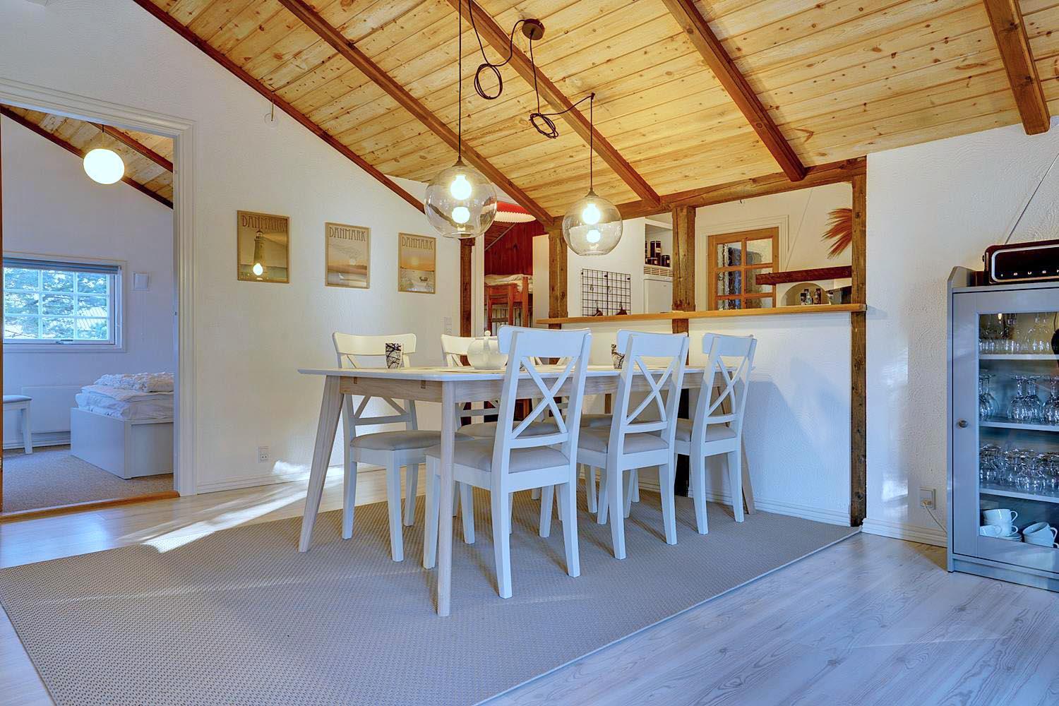 Huset er i 2021 blevet opdateret og fremtræder moderne og tidssvarende hele vejen rundt. En lys stue med skøn atmosfære og behagelig møbler. Brændeovn medvirker til hyggen, varmepumpe sørger for et godt indeklima og en strømregning der ikke ryger i vejret. I det åbne køkken med opvaskemaskine, mikroovn og separat fryser på ca. 50 liter vil I kunne kokkerere samtidig med at I er sammen med familien. 3 gode soverum , hvoraf 2 er med dobbeltseng.