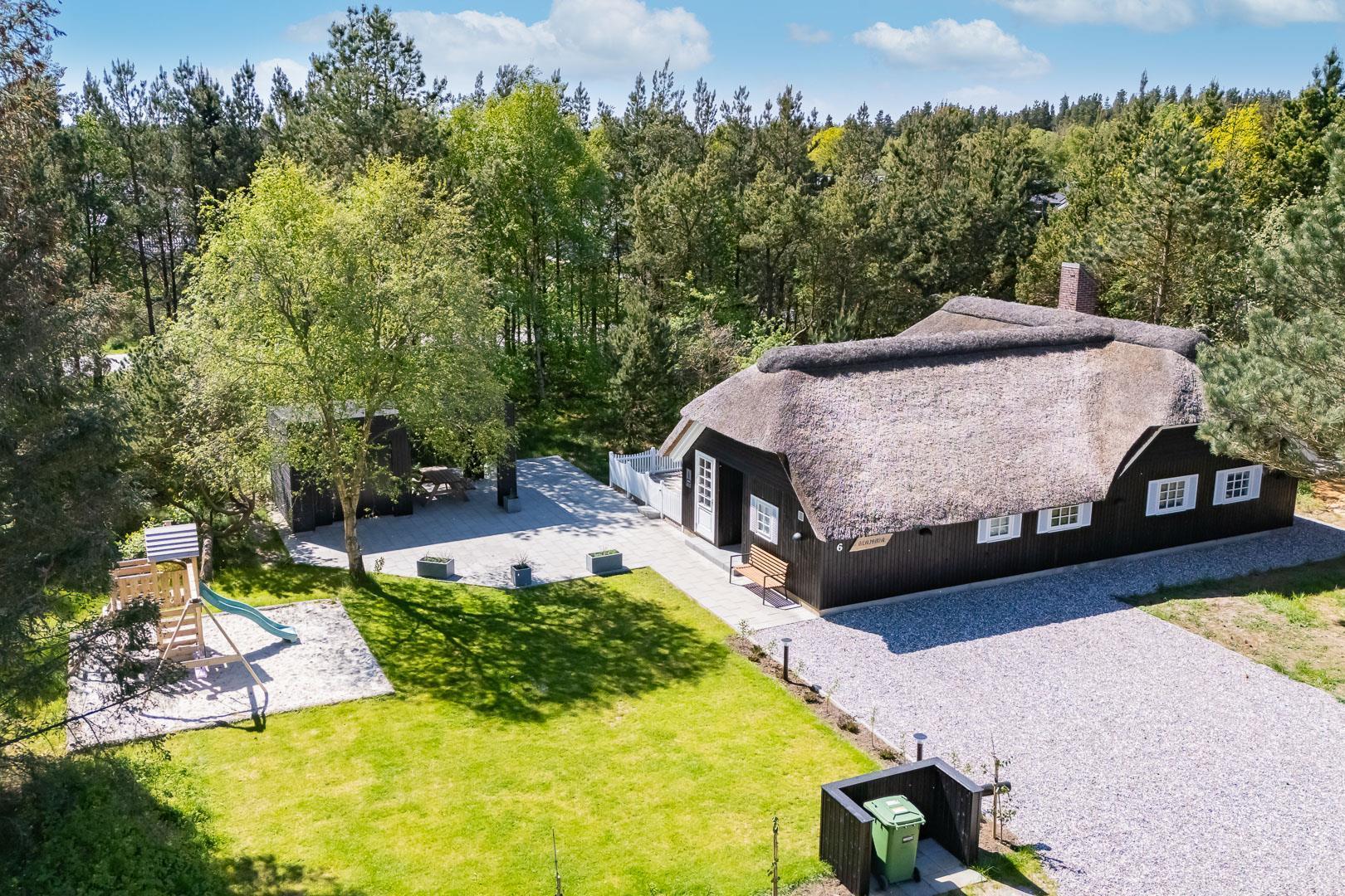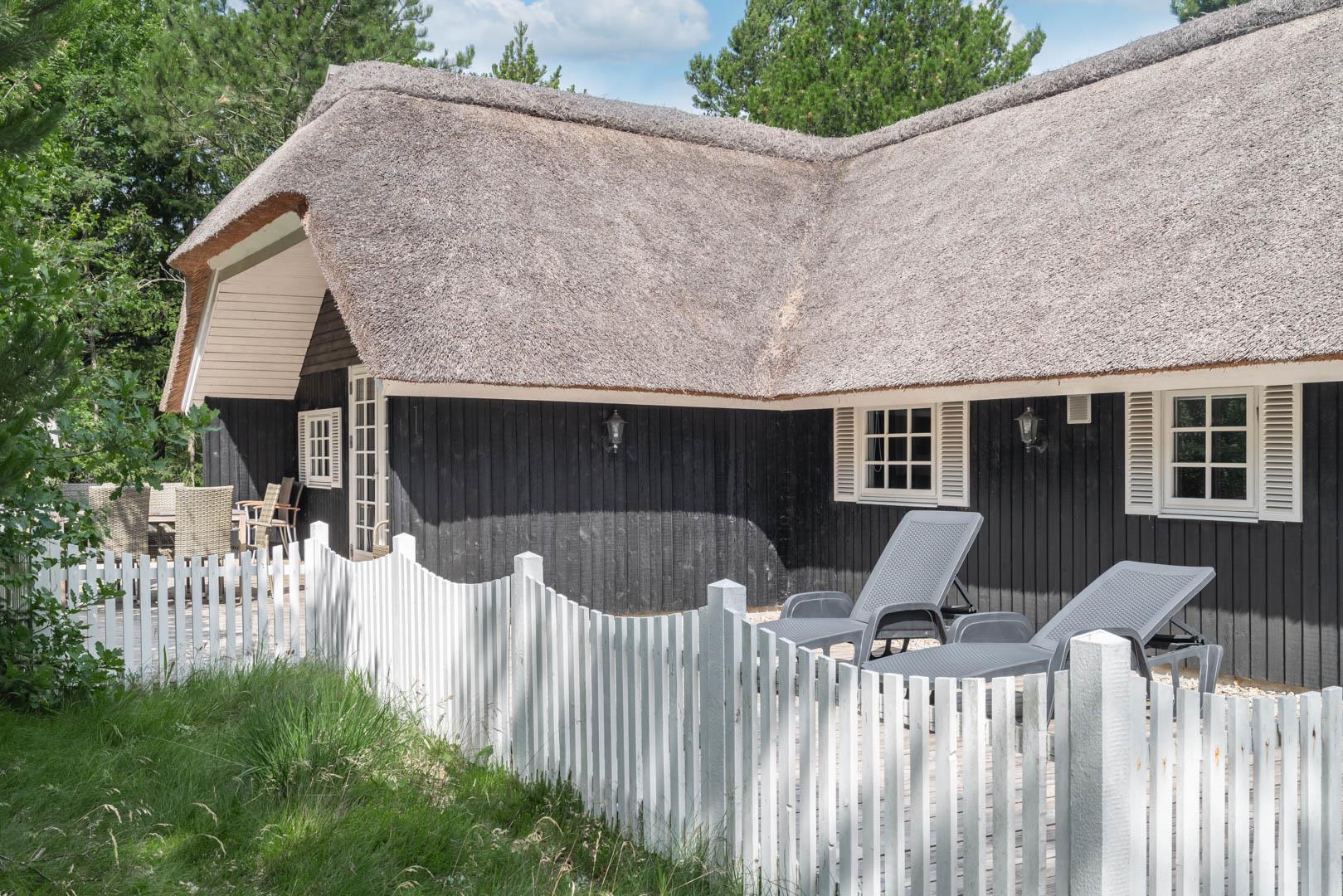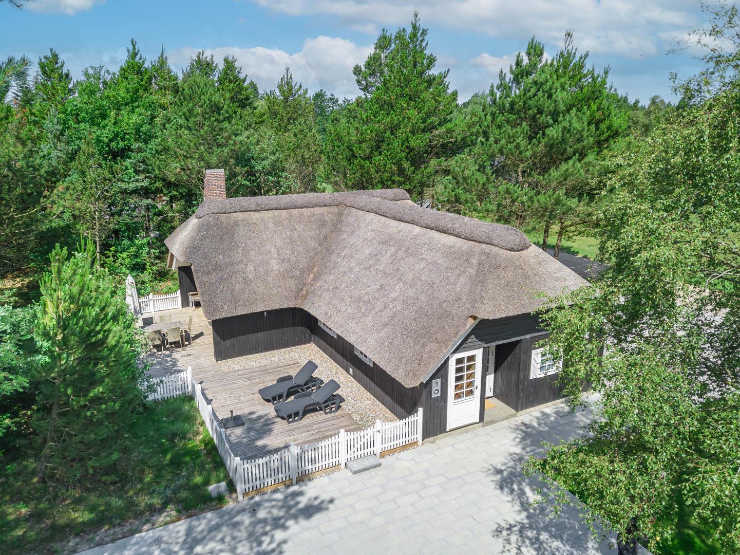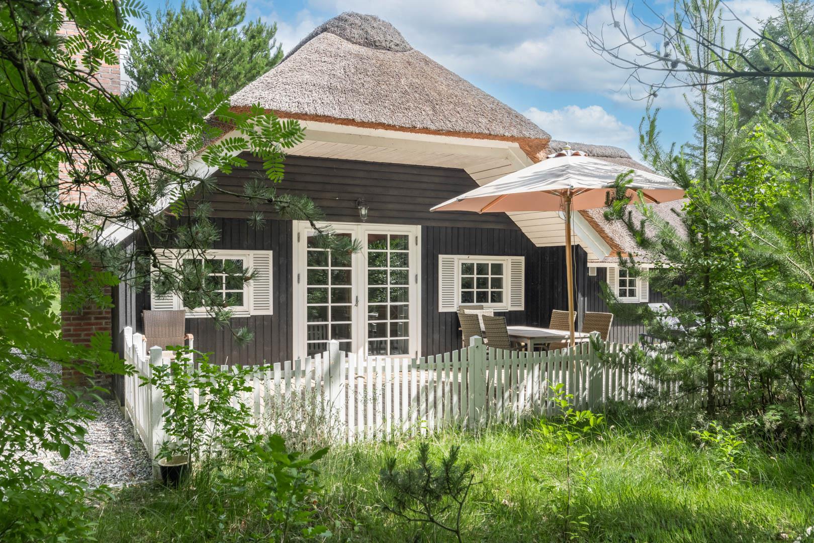 På en stor naturgrund på Hedevang 6, finder I dette charmerende og hyggelige feriehus med stråtag. Der er terrasse med indhegning omkring størstedelen af huset, så det er let at holde styr på hund eller børn.