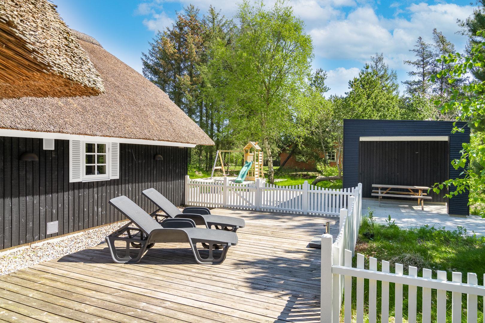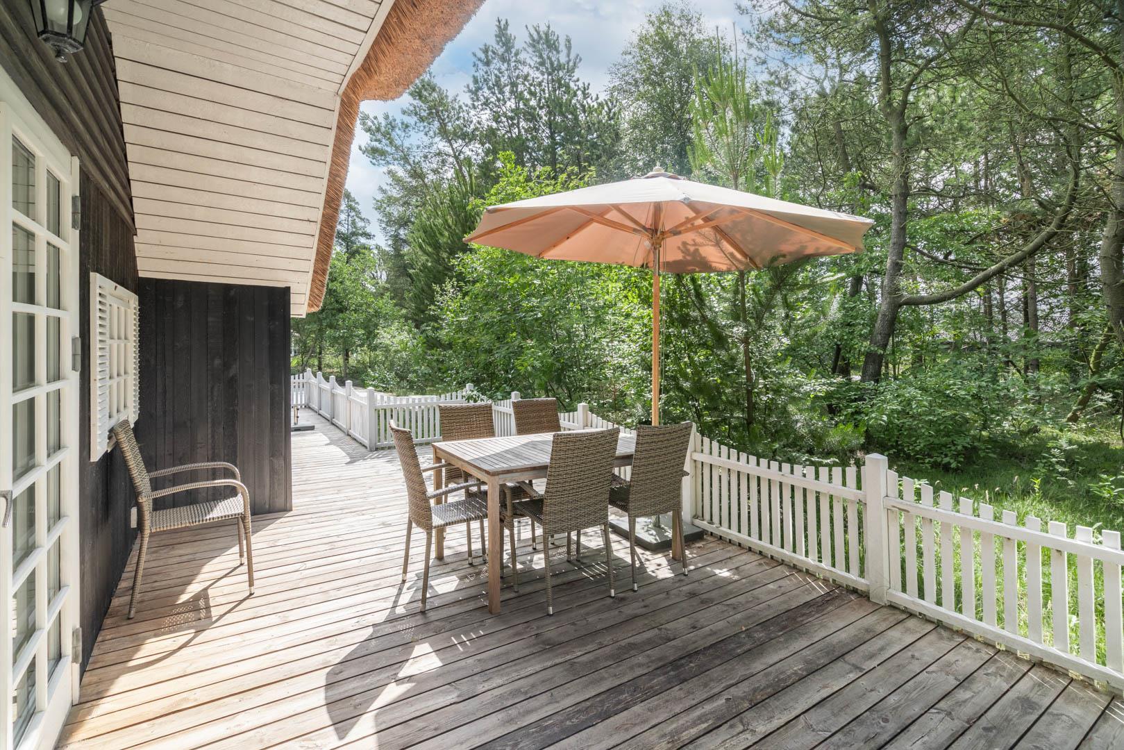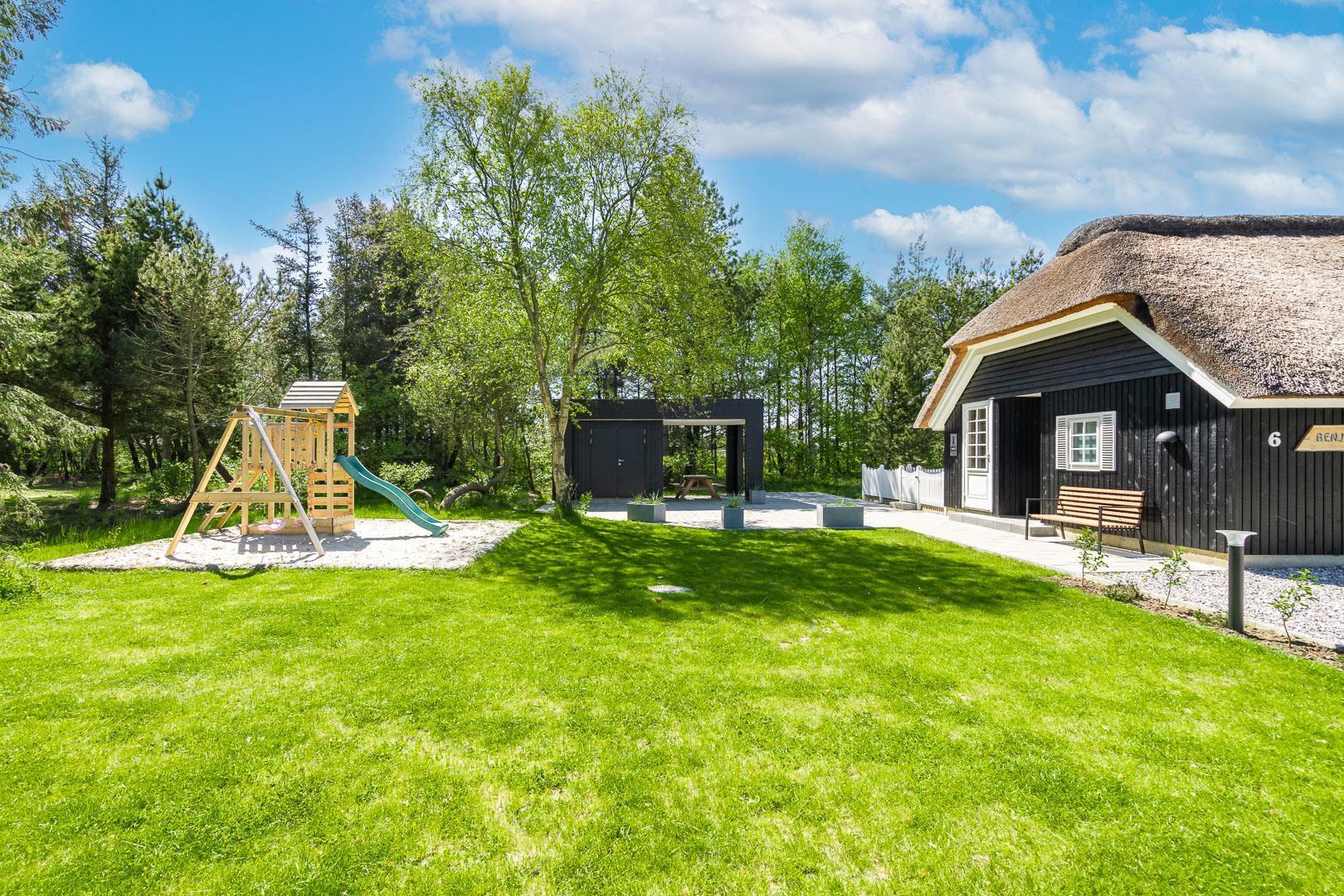 På en stor naturgrund på Hedevang 6, finder I dette charmerende og hyggelige feriehus med stråtag. Der er terrasse med indhegning omkring størstedelen af huset, så det er let at holde styr på hund eller børn.