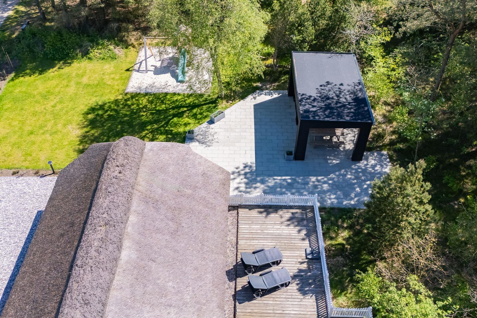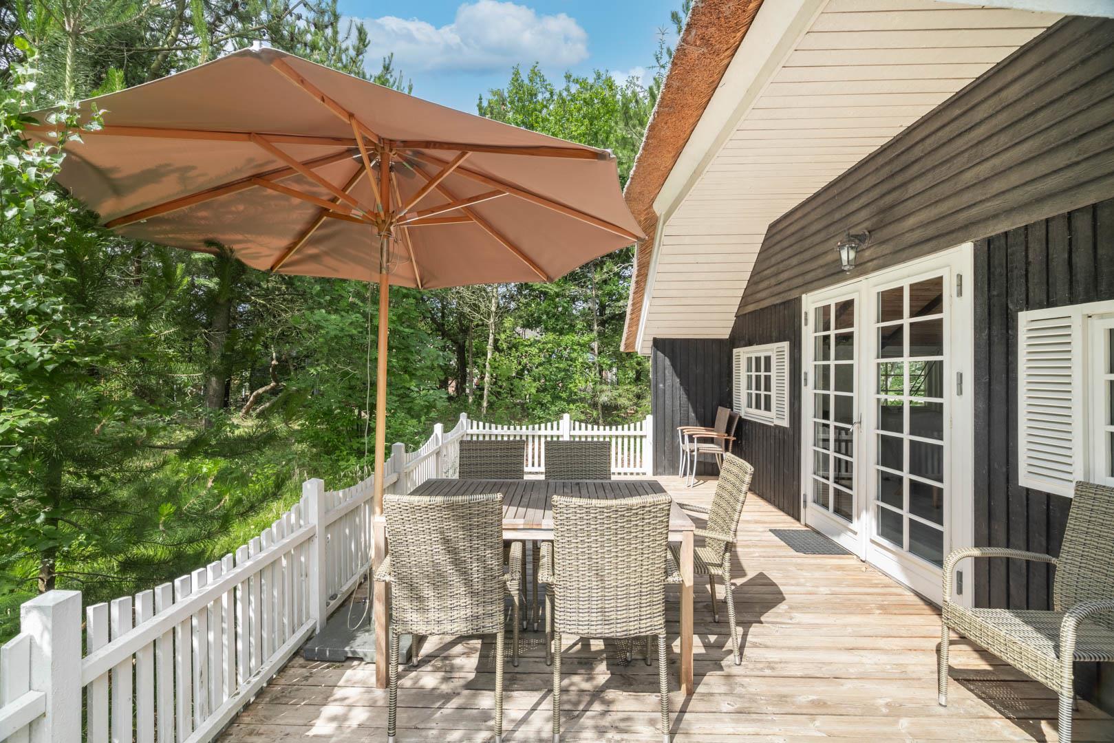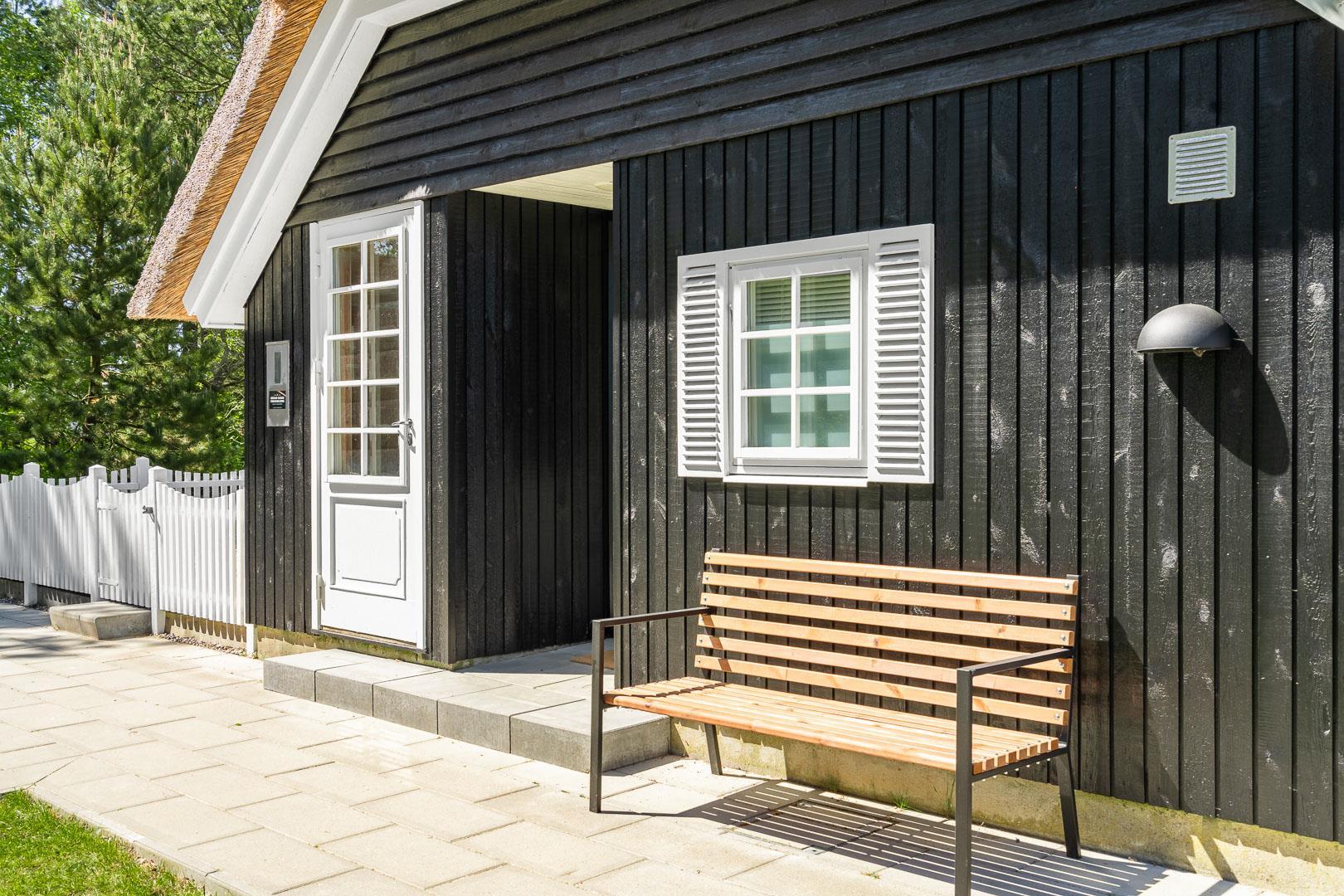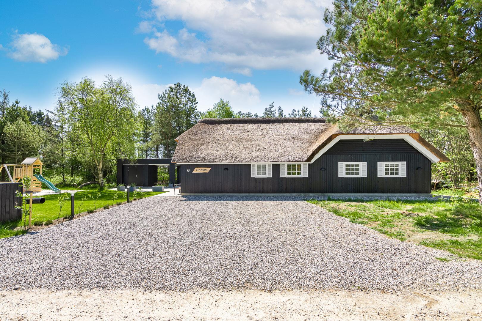 På en stor naturgrund på Hedevang 6, finder I dette charmerende og hyggelige feriehus med stråtag. Der er terrasse med indhegning omkring størstedelen af huset, så det er let at holde styr på hund eller børn.