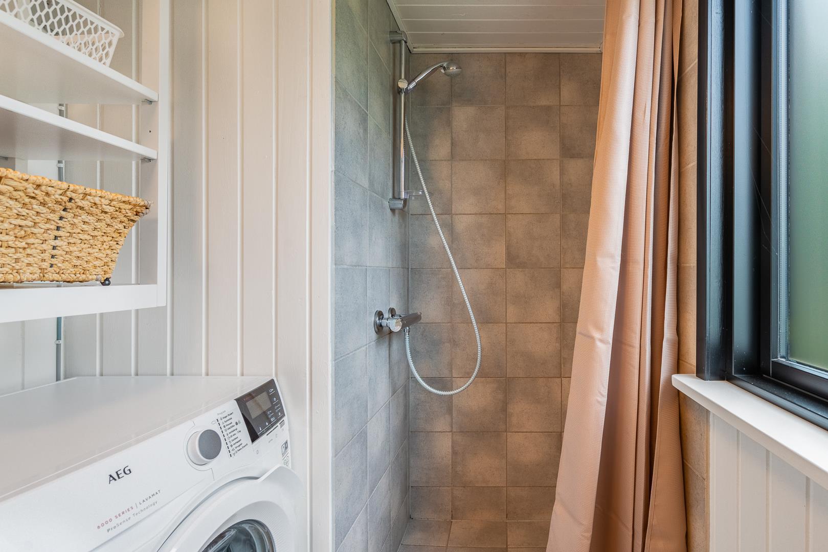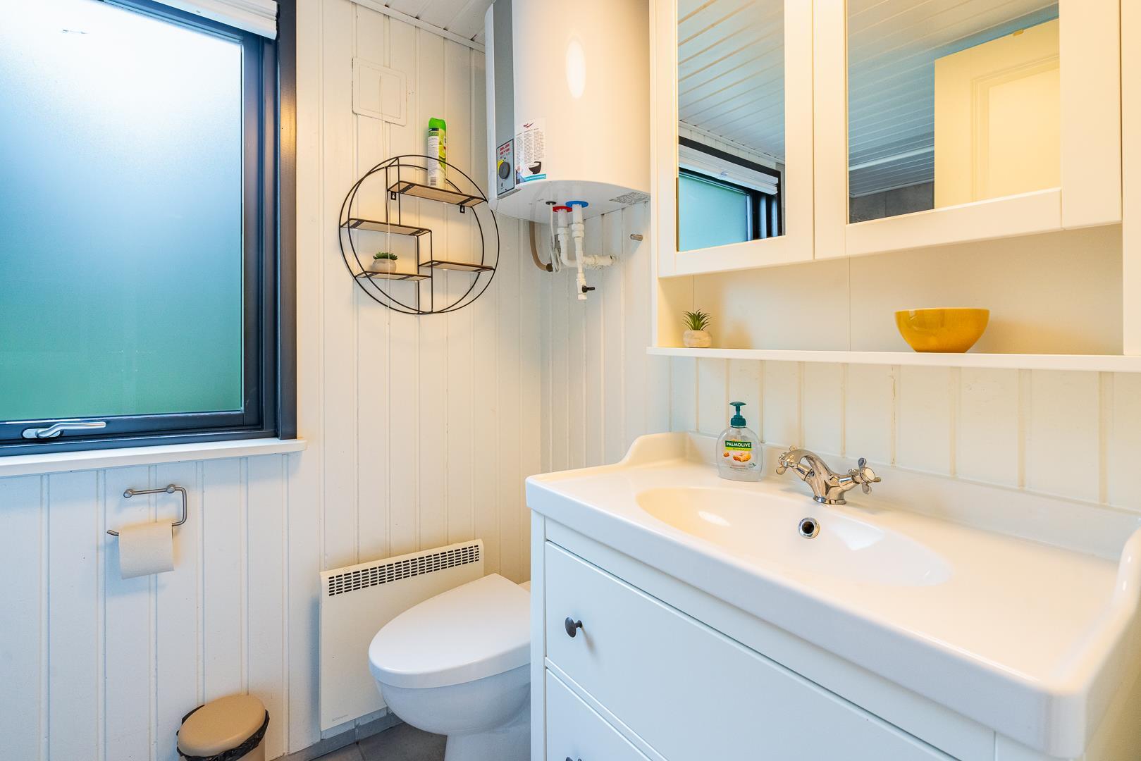Husets badeværelse er lyst og indbydende og er placeret i stueetagen.