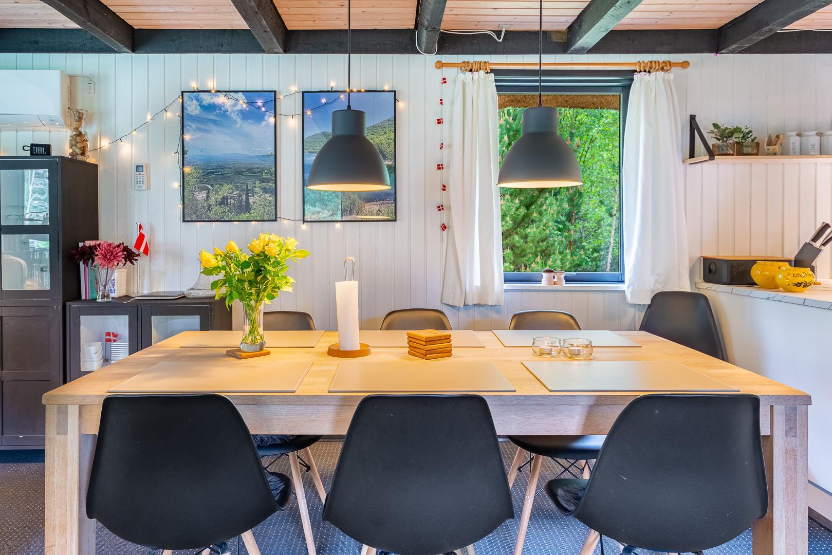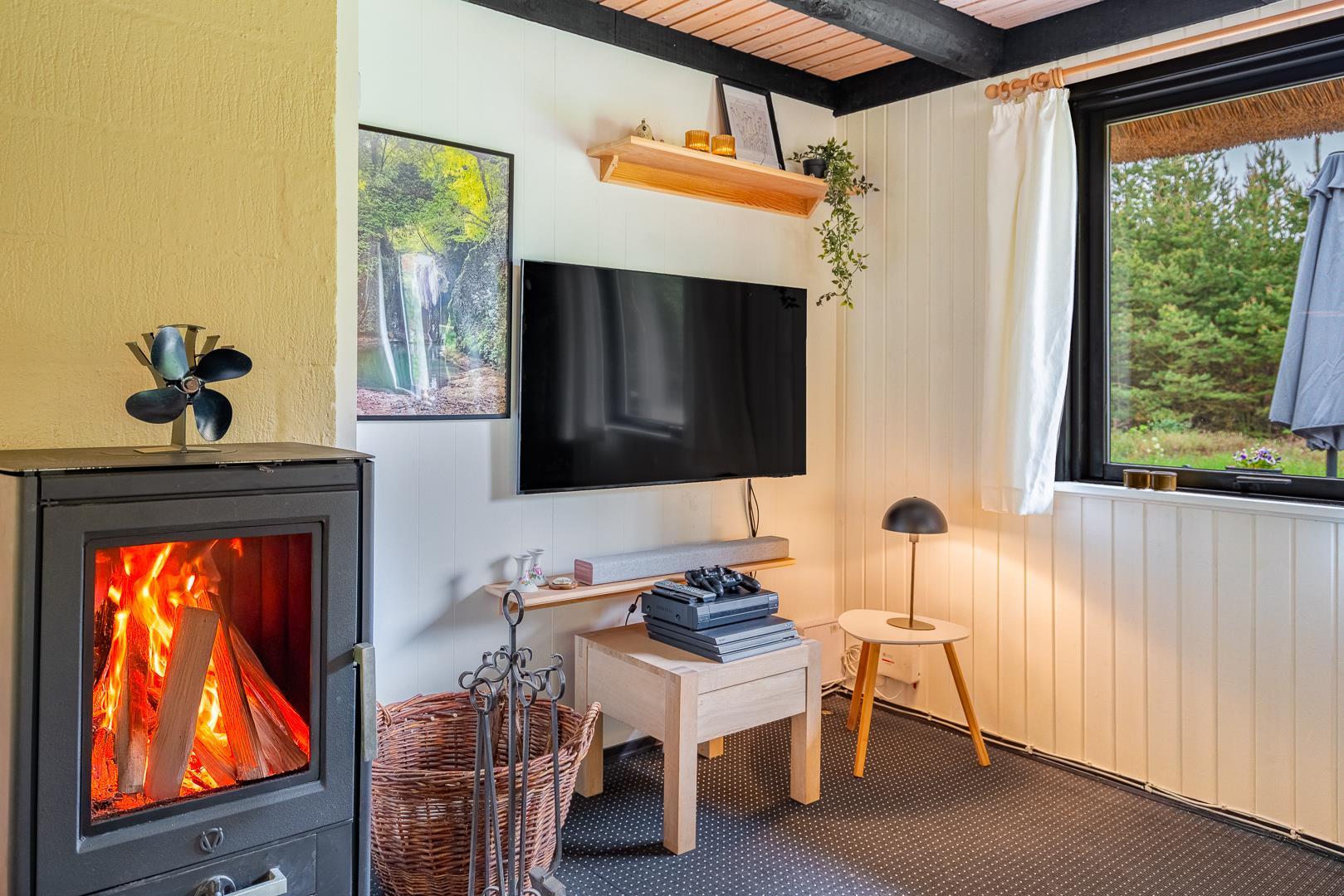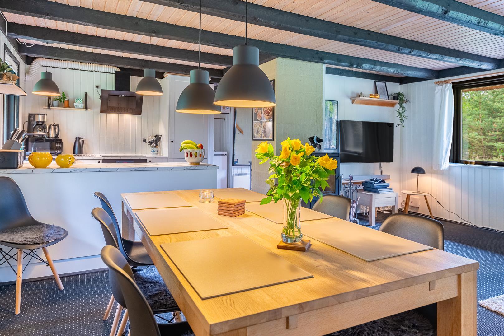 Indendørs byder sommerhuset på en hyggelig stue med synlige bjælker i loftet, som er i åben forbindelse med spiseafdelingen og køkkenet. Stuen er udstyret med fjernsyn med parabol. Her finder du også CD-afspiller, DVD-afspiller, Playstation samt en brændeovn, der skaber en varm og indbydende atmosfære i rummet. Spiseafdelingen har god plads til hele familien, hvilket gør det ideelt til fælles måltider og hyggelige stunder.