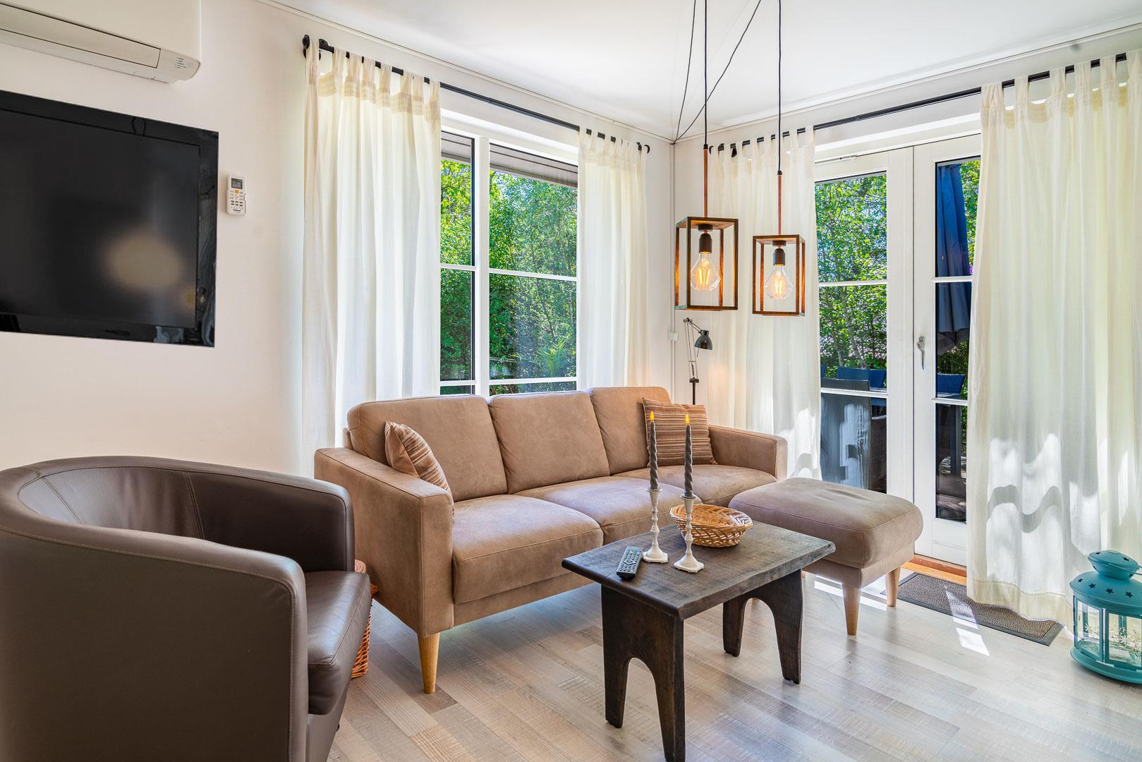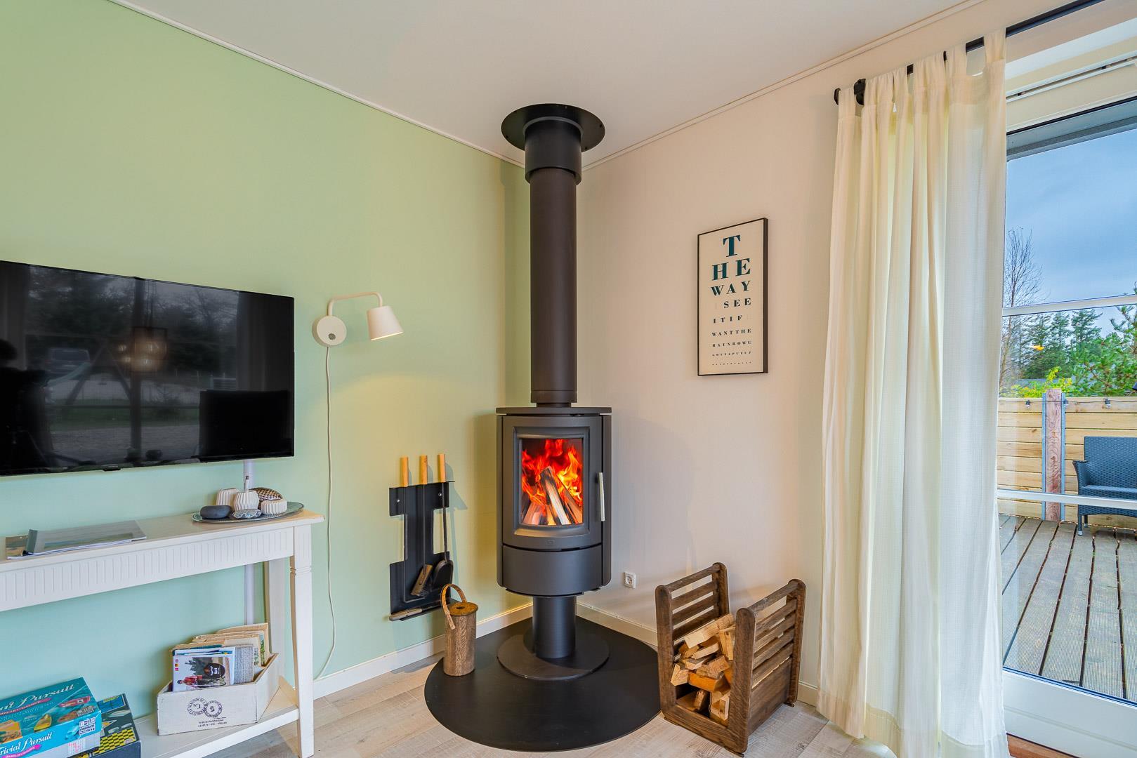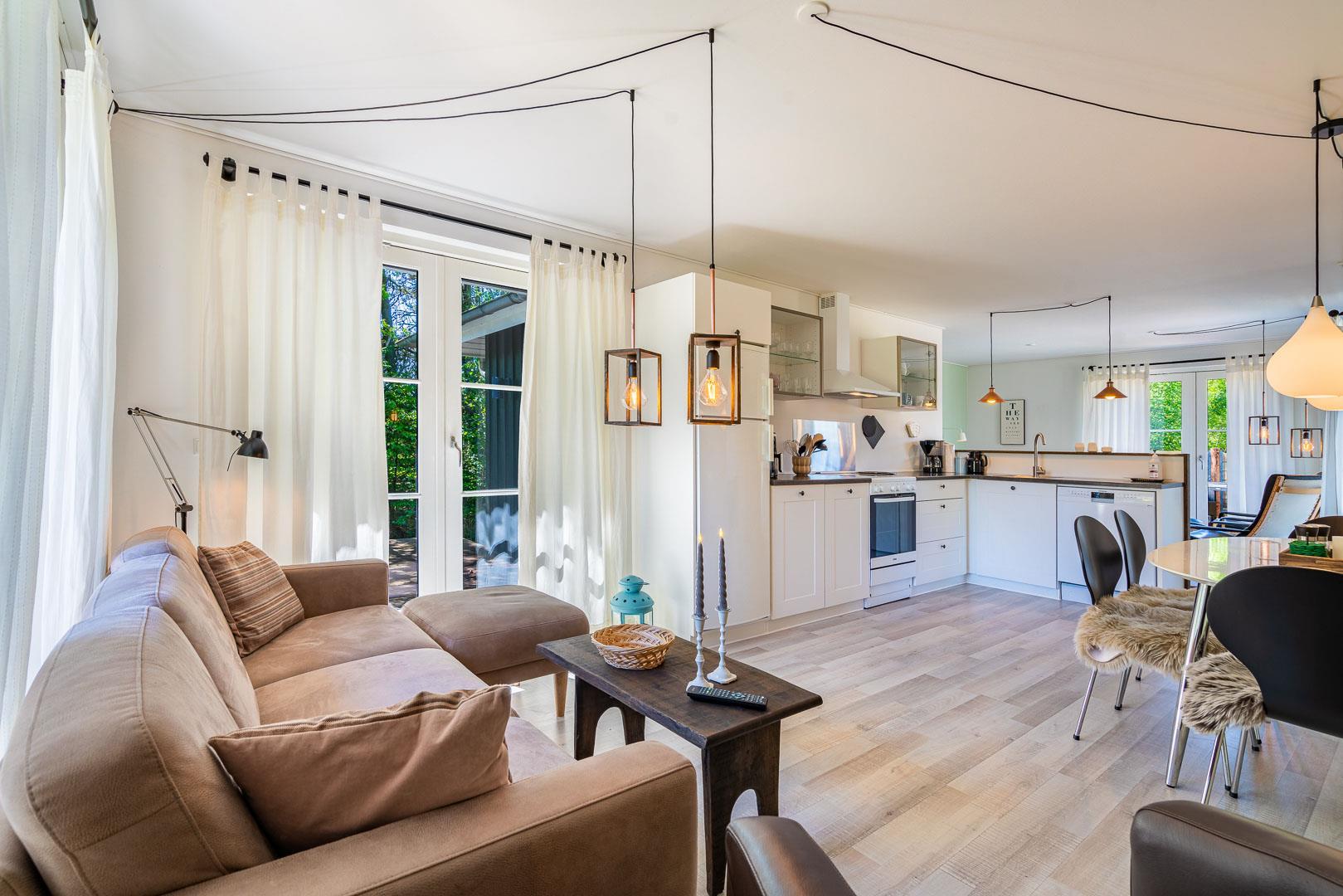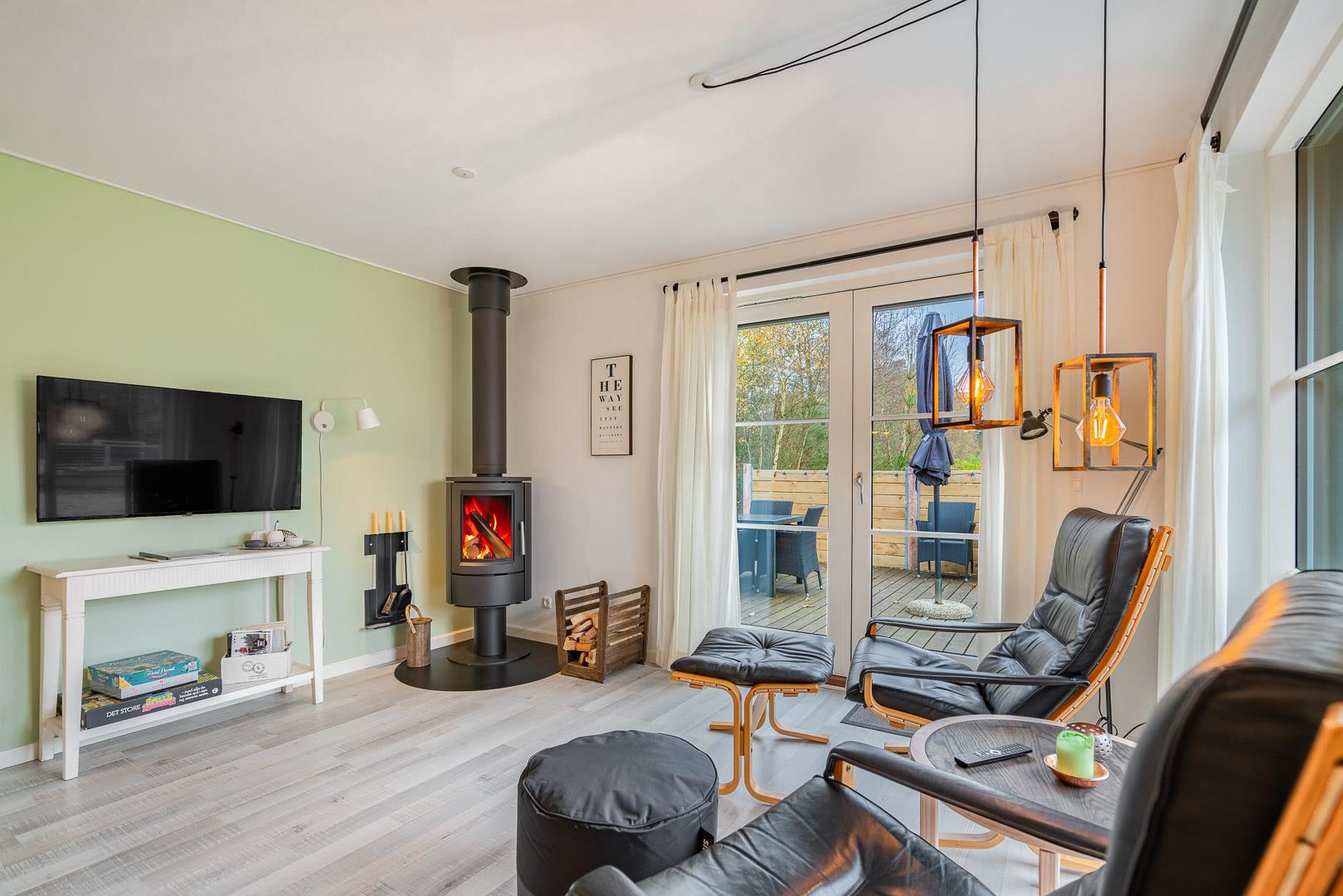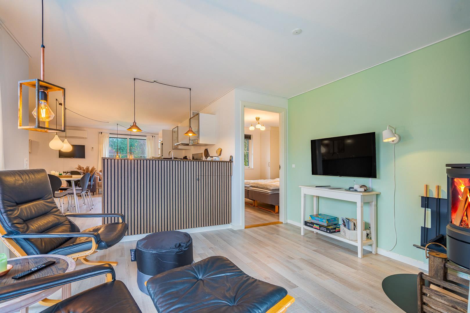 Det åbne køkken er moderne og veludstyret med opvaskemaskine og separat fryser, og hænger sammen med den lyse og hyggelige stue, hvor brændeovnen spreder varme og stemning. Her er også Chromecast-tv, gratis WiFi og en energivenlig varmepumpe, som sikrer godt klima året rundt. Der er selvfølgelig også vaskemaskine og tørretumbler, hvis behovet skulle opstå under ferien.