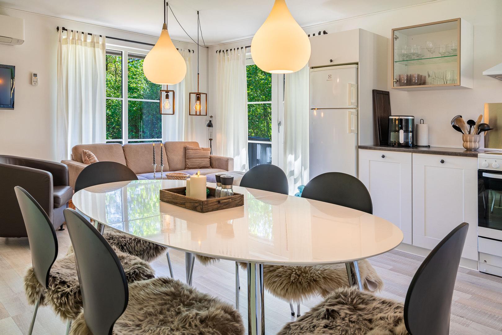 Det lyse køkken er moderne indrettet med opvaskemaskine og god plads til fælles madlavning. Til længere ophold står både vaskemaskine og tørretumbler til rådighed – særligt praktisk for familier eller ved længere ferier.