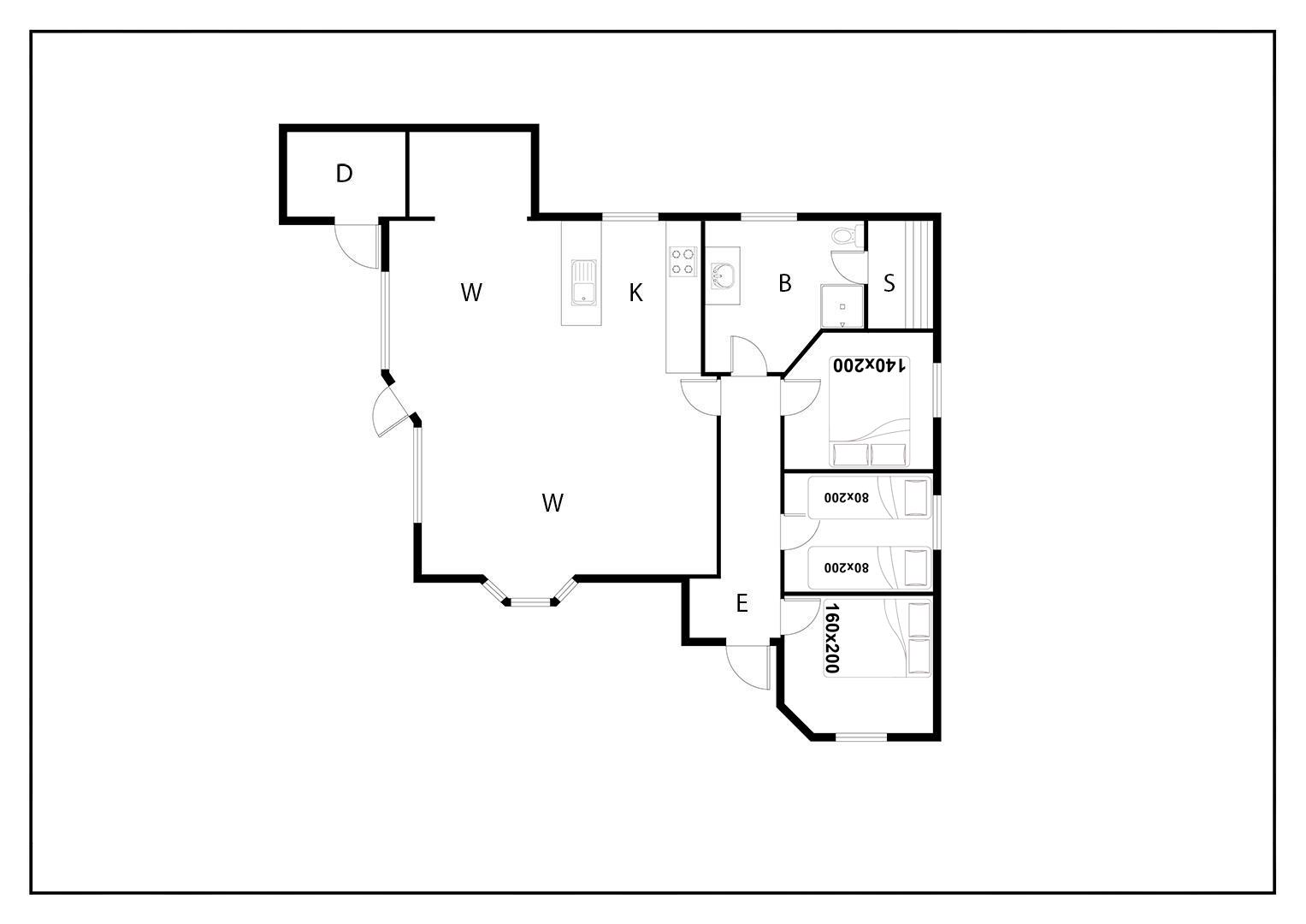 Sengestørrelser: 1 dobbeltseng 160 x 200 cm + 1 dobbeltseng 140 x 200 cm + 2 enkeltsenge 80 x 200 cm.