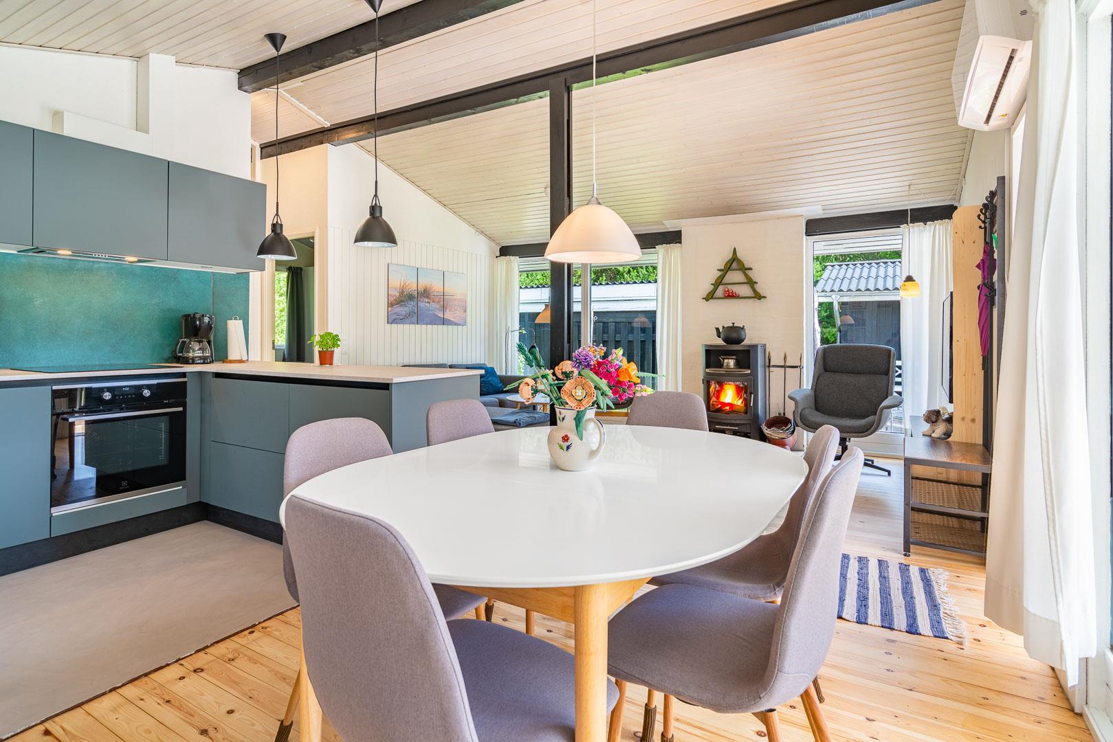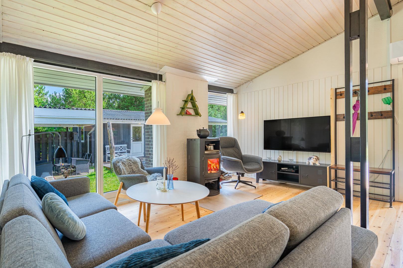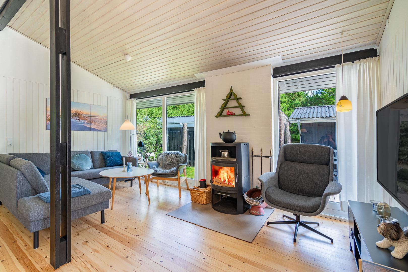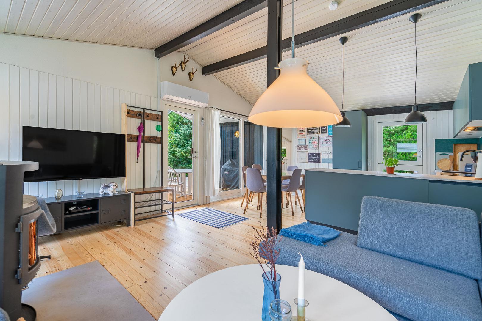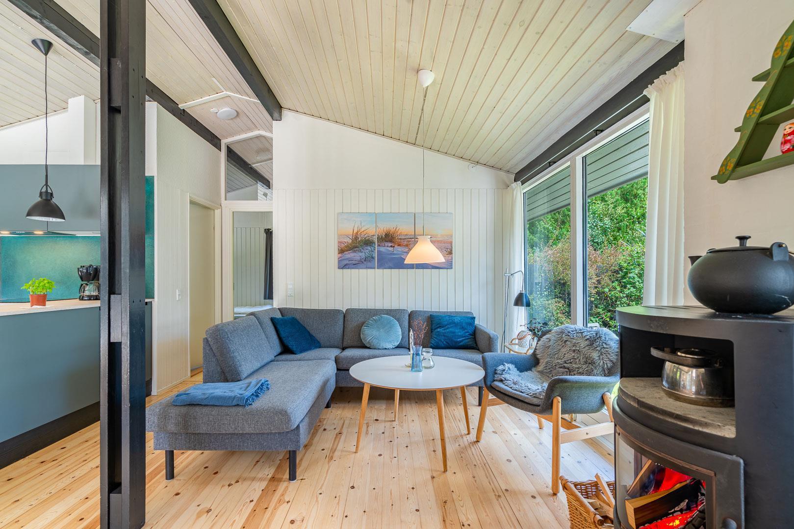 Det stilfulde køkken fra 2024 er både funktionelt og indbydende – et perfekt sted at lave måltider med udsigt til naturen. I stuen finder du en brændeovn, varmepumpe og en komfortabel sofa, der indbyder til afslapning og hygge efter en dag i det fri.