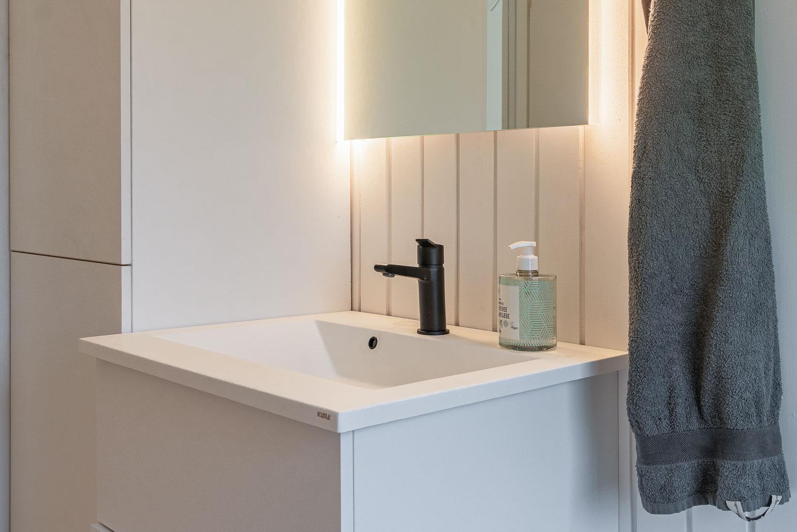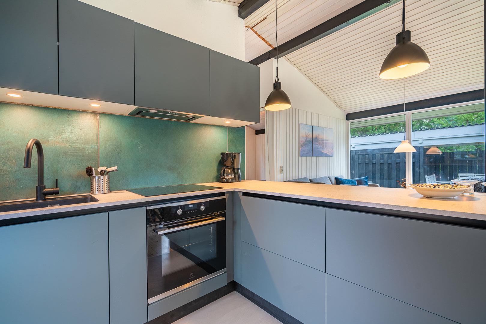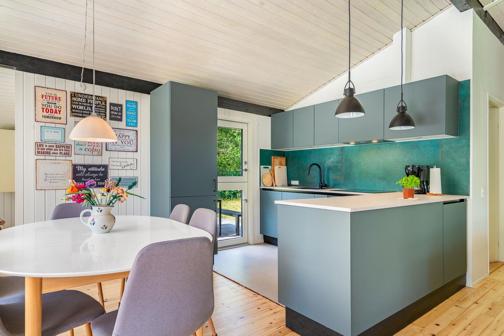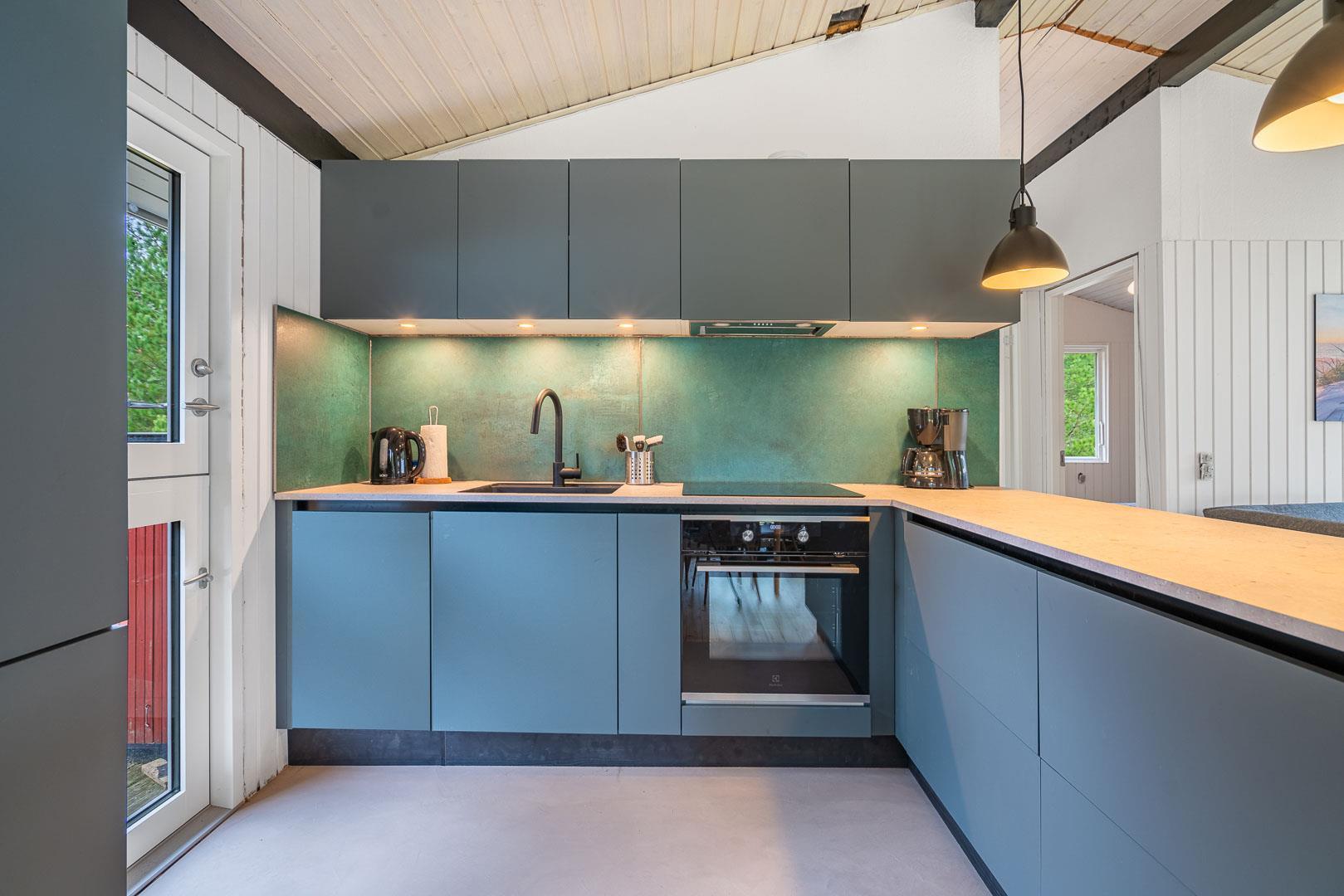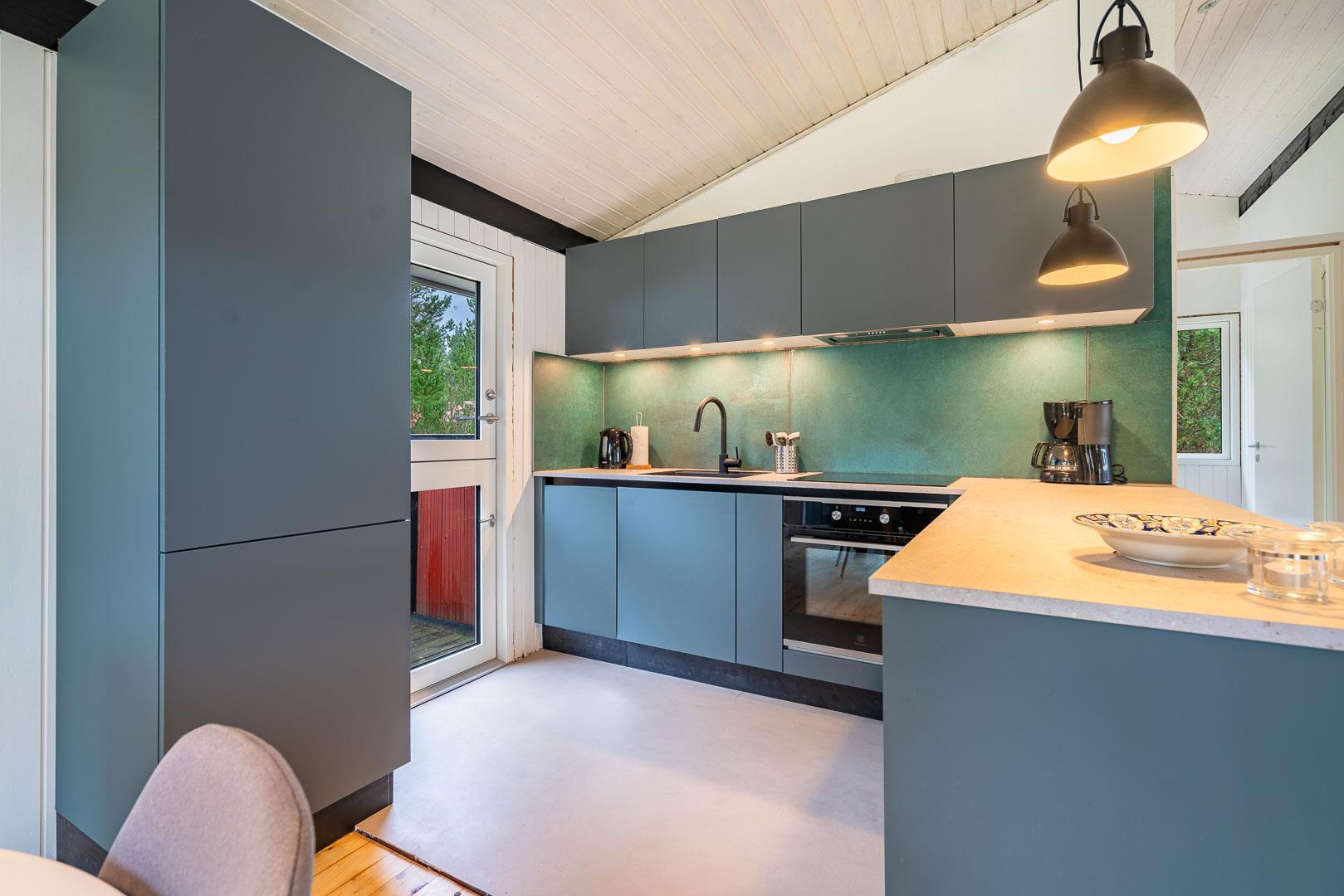 Det stilfulde køkken fra 2024 er både funktionelt og indbydende – et perfekt sted at lave måltider med udsigt til naturen. I stuen finder du en brændeovn, varmepumpe og en komfortabel sofa, der indbyder til afslapning og hygge efter en dag i det fri.