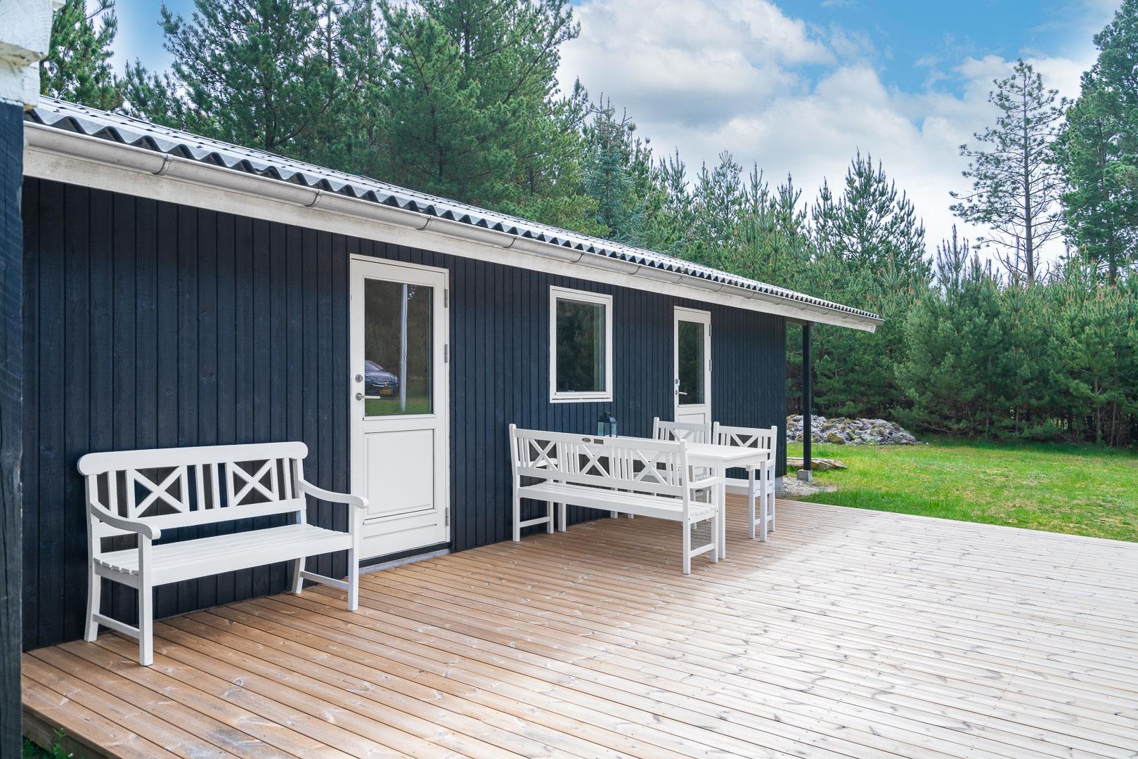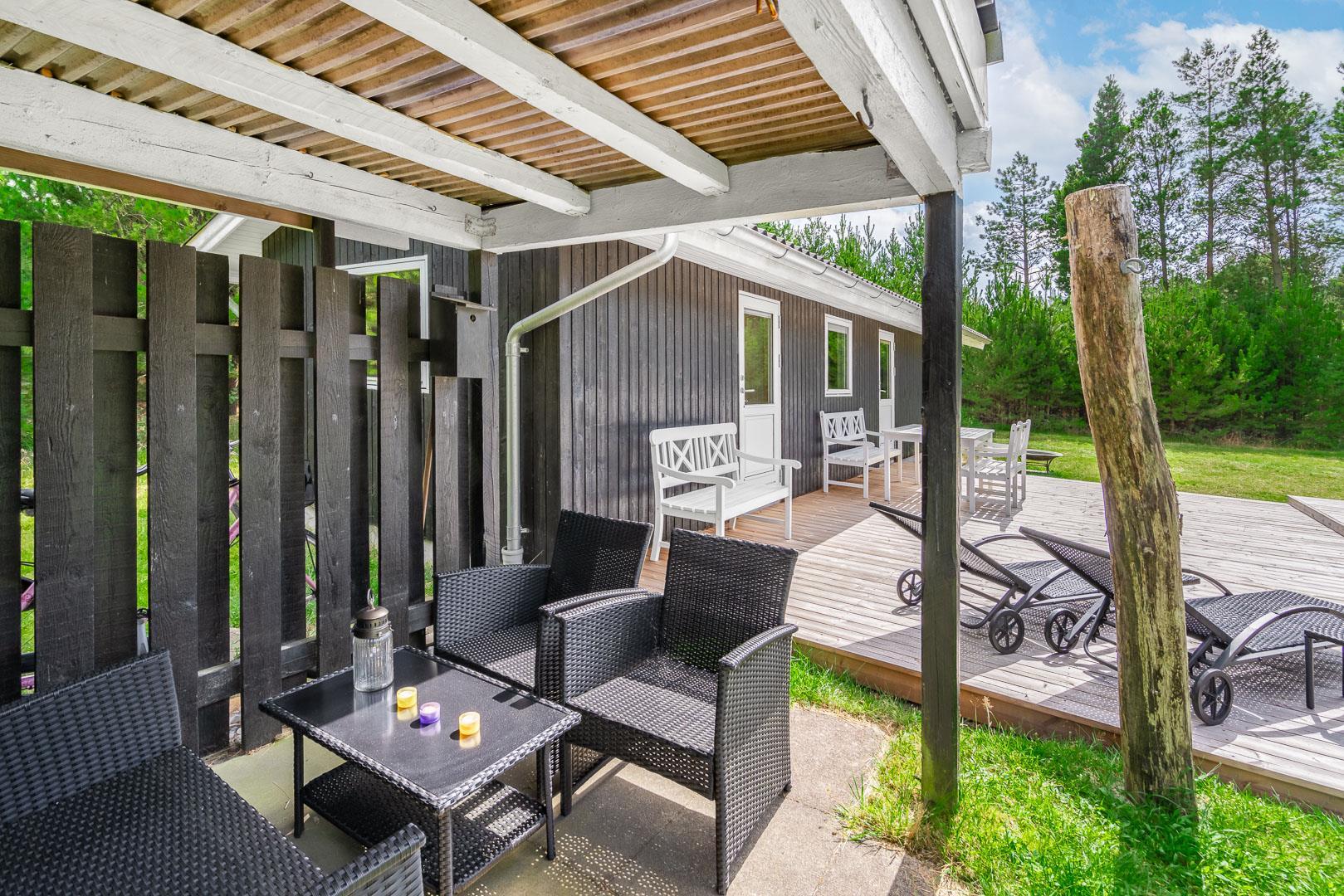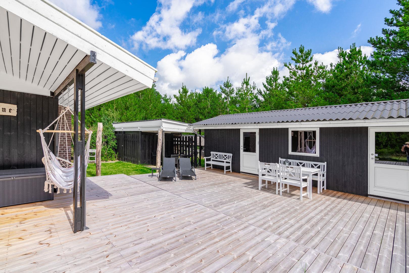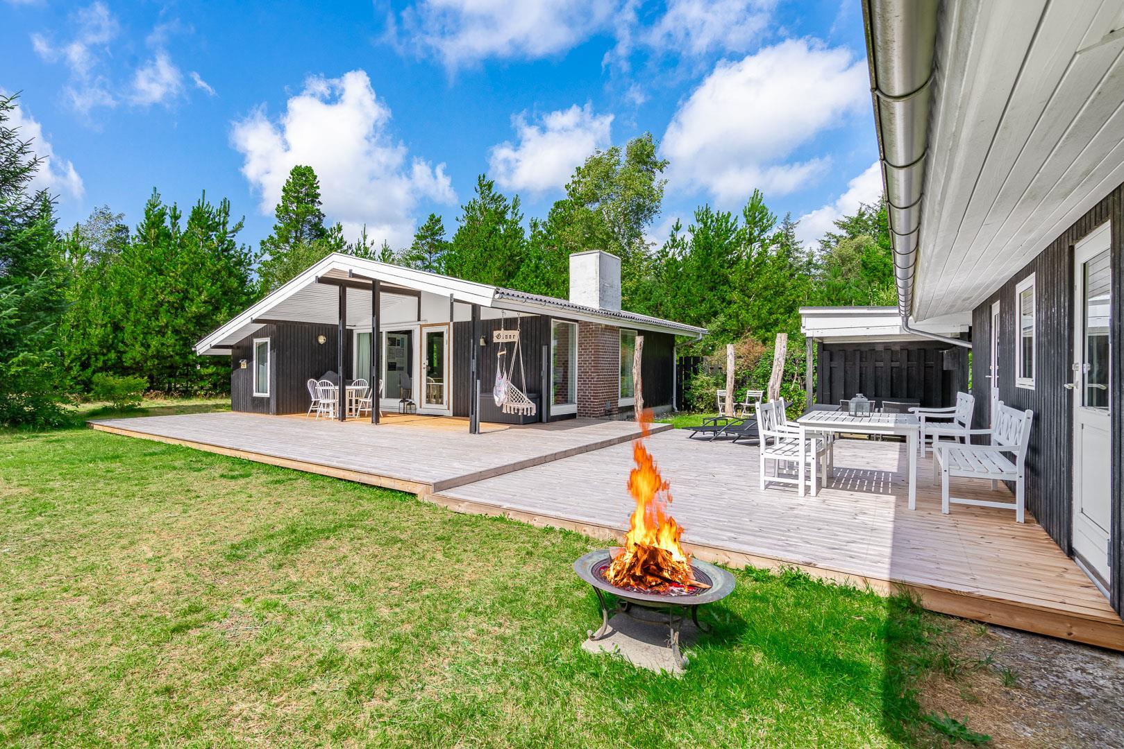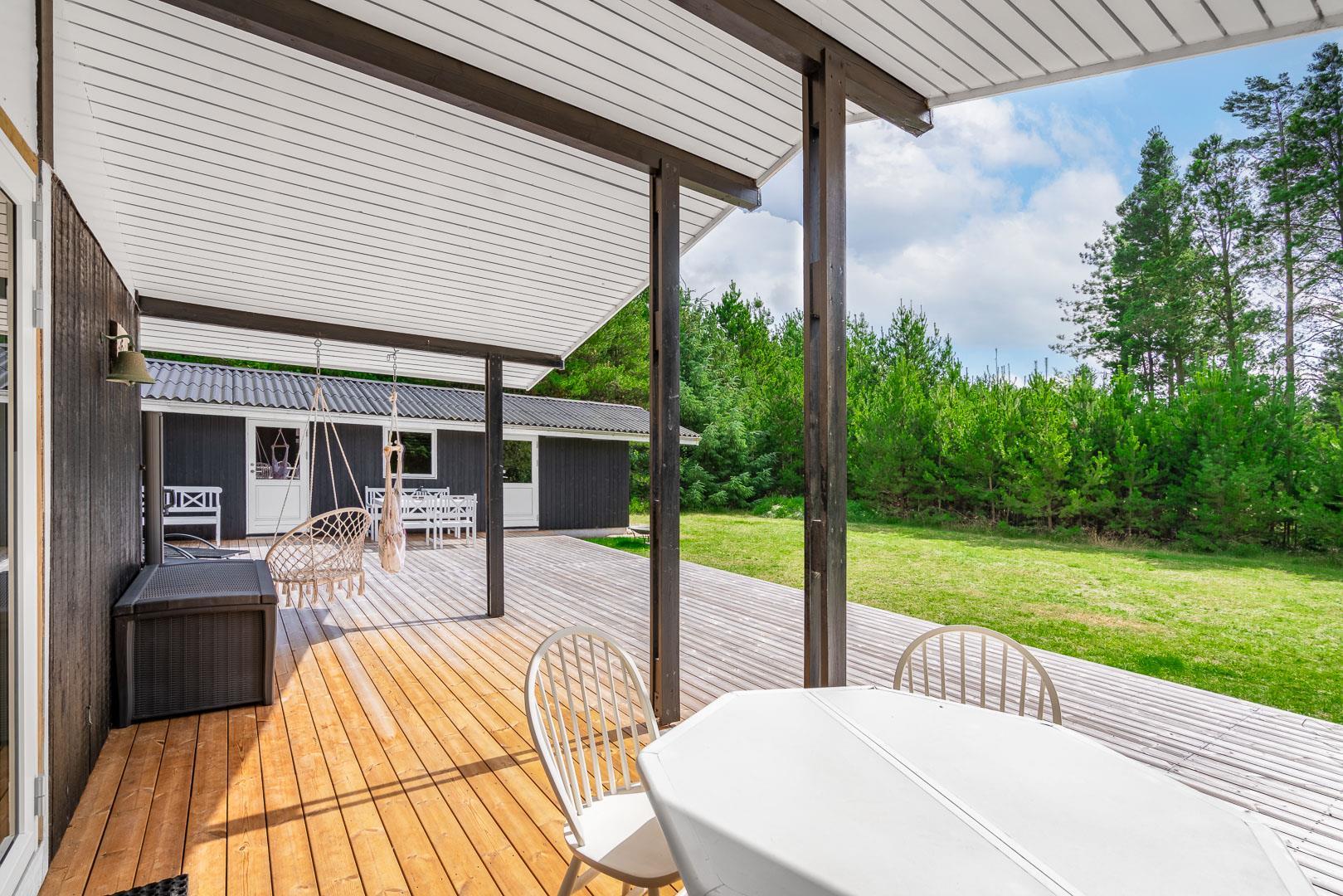 Sommerhuset byder på flere terrasser og hyggelige kroge, der inviterer til afslapning i solen eller under den overdækkede terrasse. På grunden finder du også et bålfad, der skaber den perfekte ramme for aftener med snobrød, ristede skumfiduser og nærvær omkring flammerne.