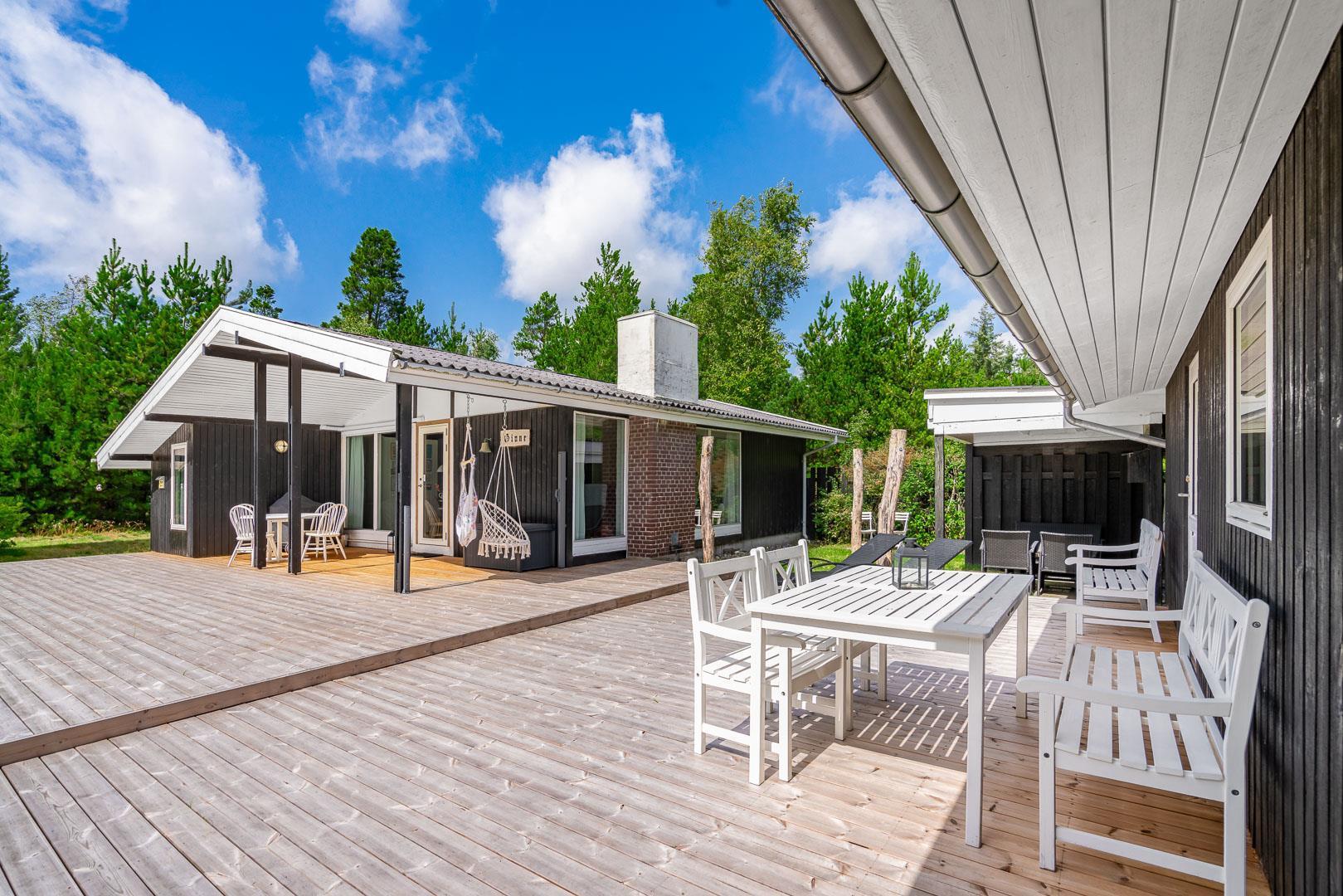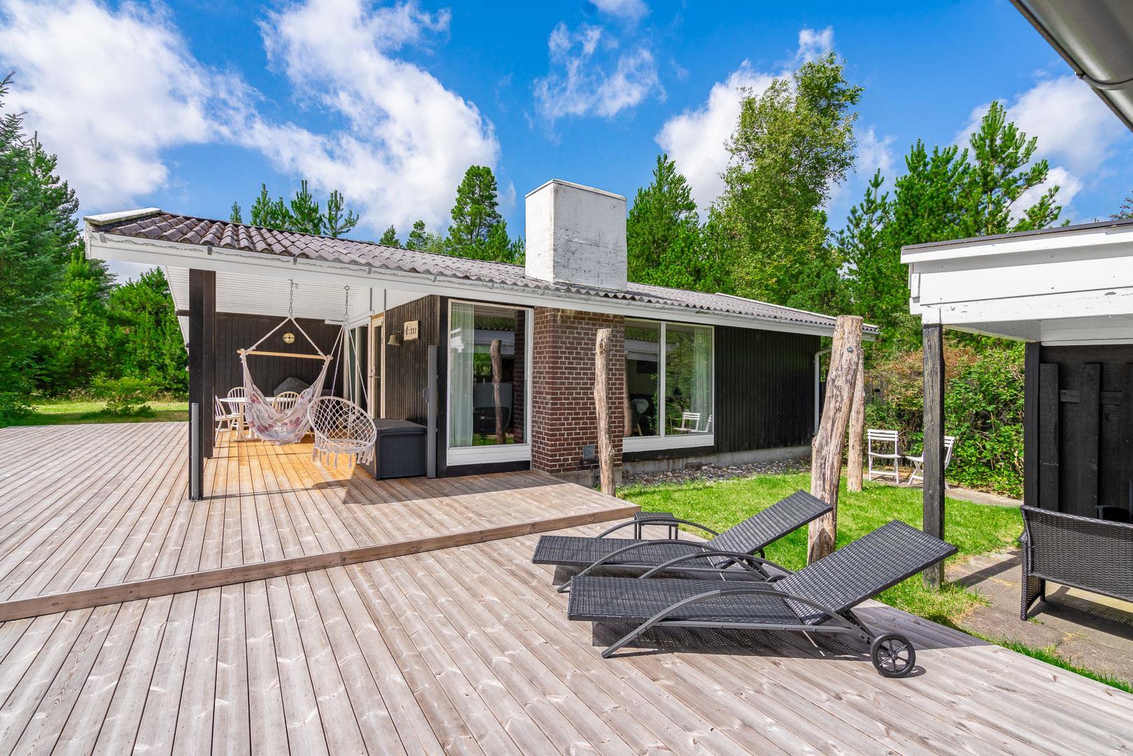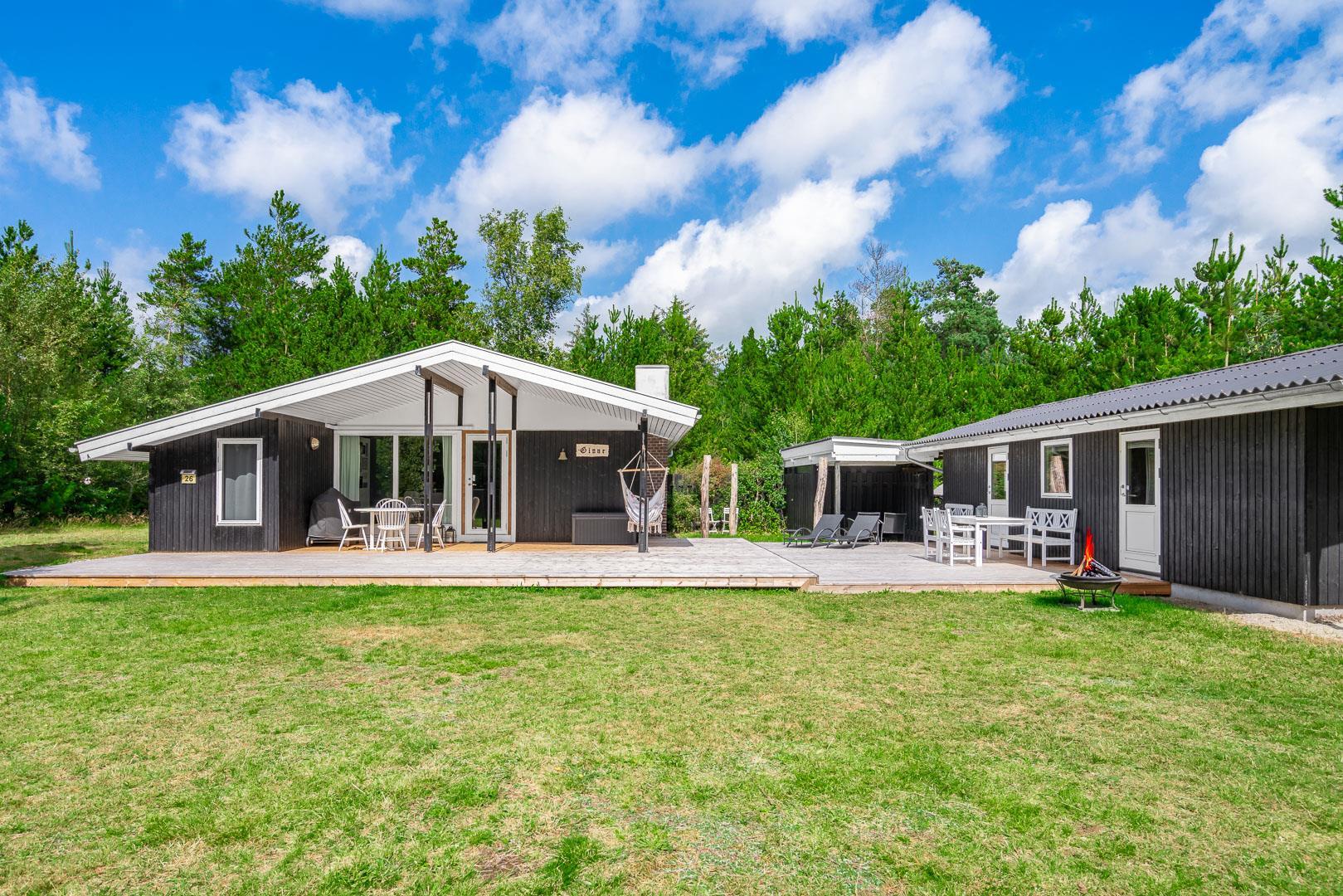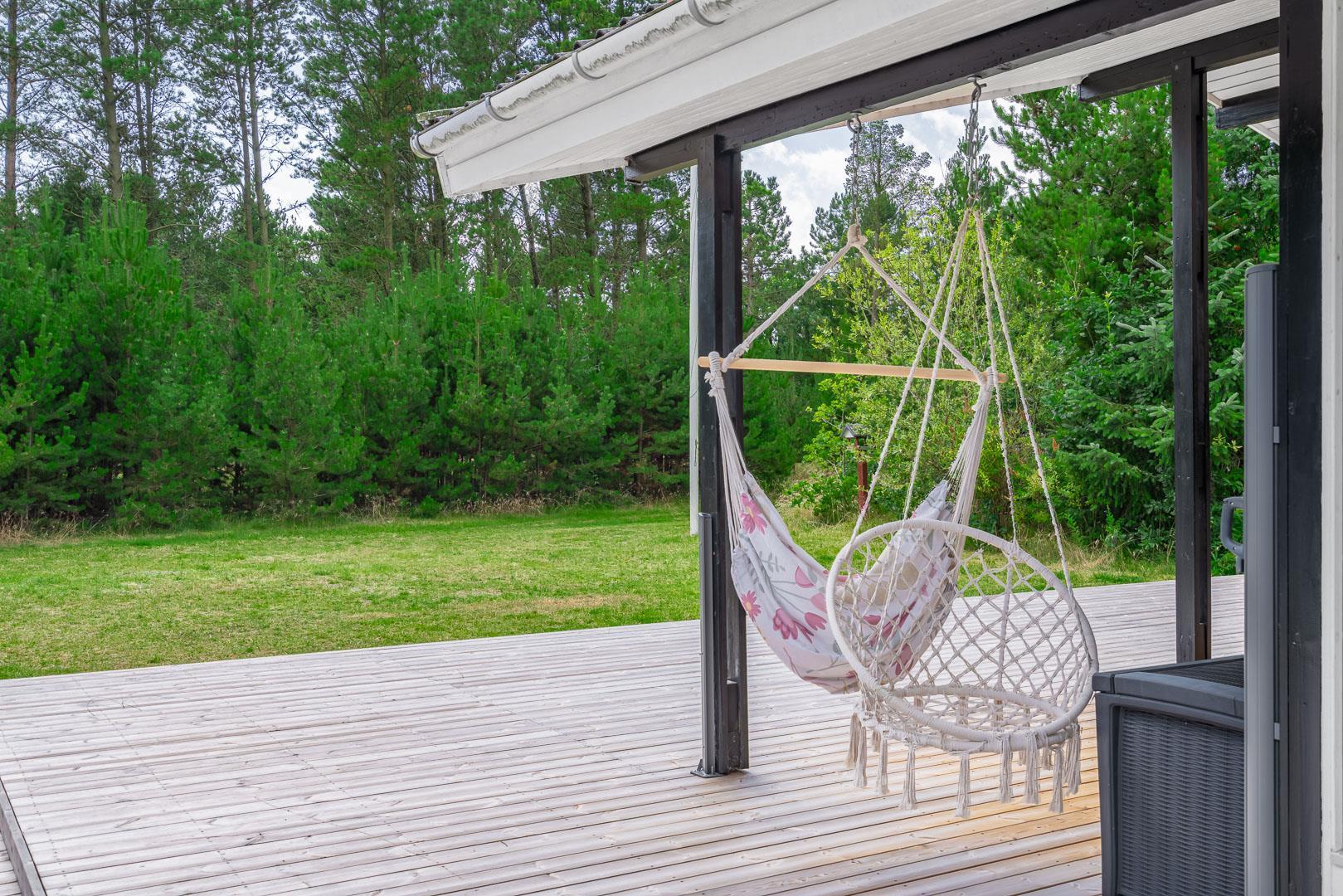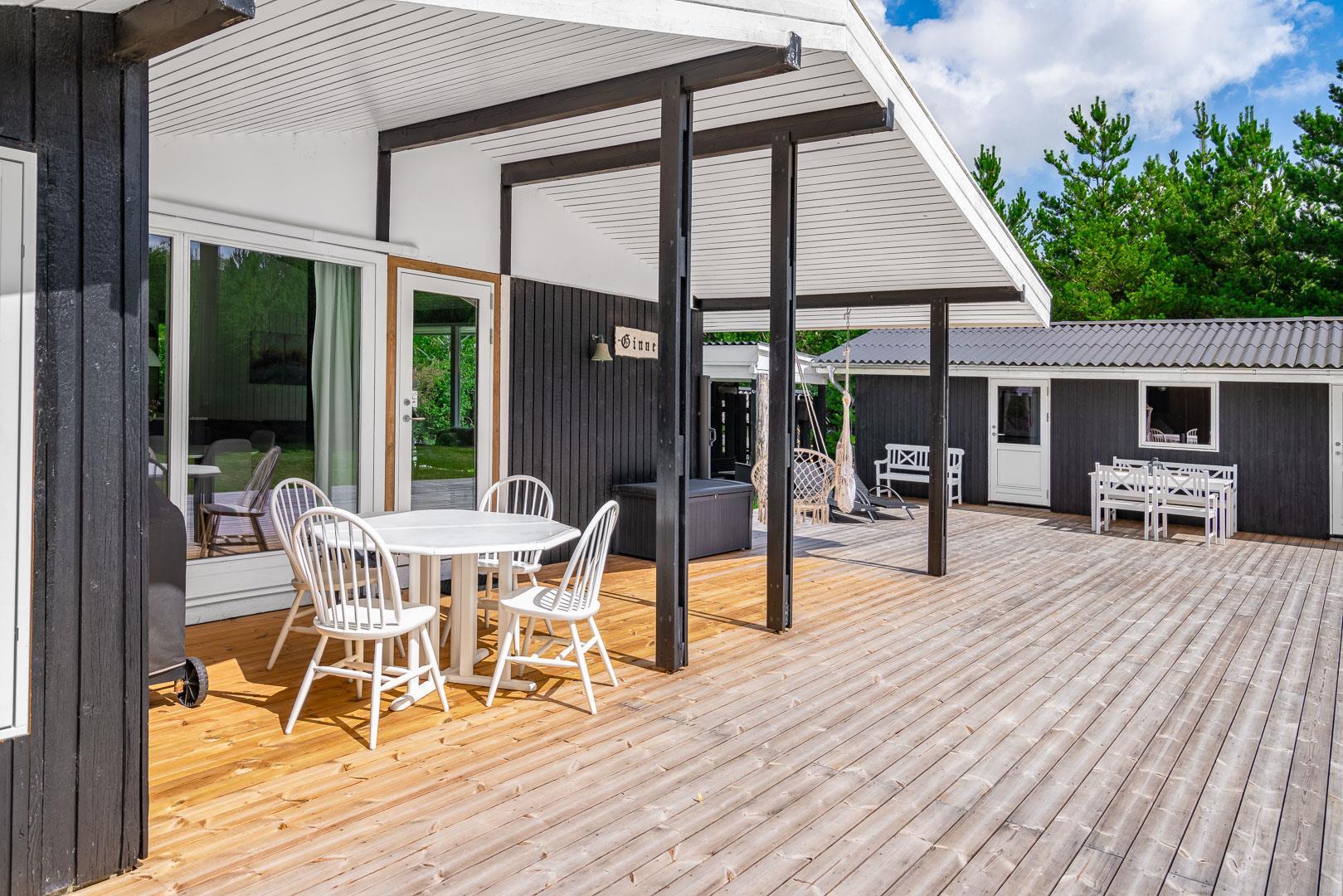 Sommerhuset byder på flere terrasser og hyggelige kroge, der inviterer til afslapning i solen eller under den overdækkede terrasse. På grunden finder du også et bålfad, der skaber den perfekte ramme for aftener med snobrød, ristede skumfiduser og nærvær omkring flammerne.