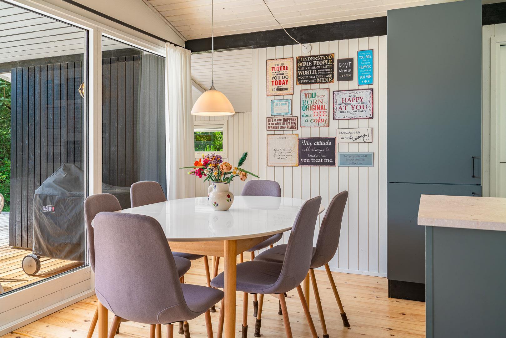 Sommerhuset ligger ugeneret og idyllisk på en stor grund, der både giver plads til leg og fordybelse. I nærområdet finder du desuden en spændende legeplads med aktiviteter, der kan begejstre børnene i timevis. Og som noget særligt er det tilladt at tage én hund med, så familiens firbenede ven også kan nyde de skønne omgivelser.