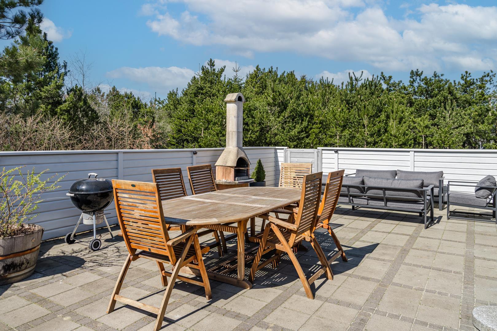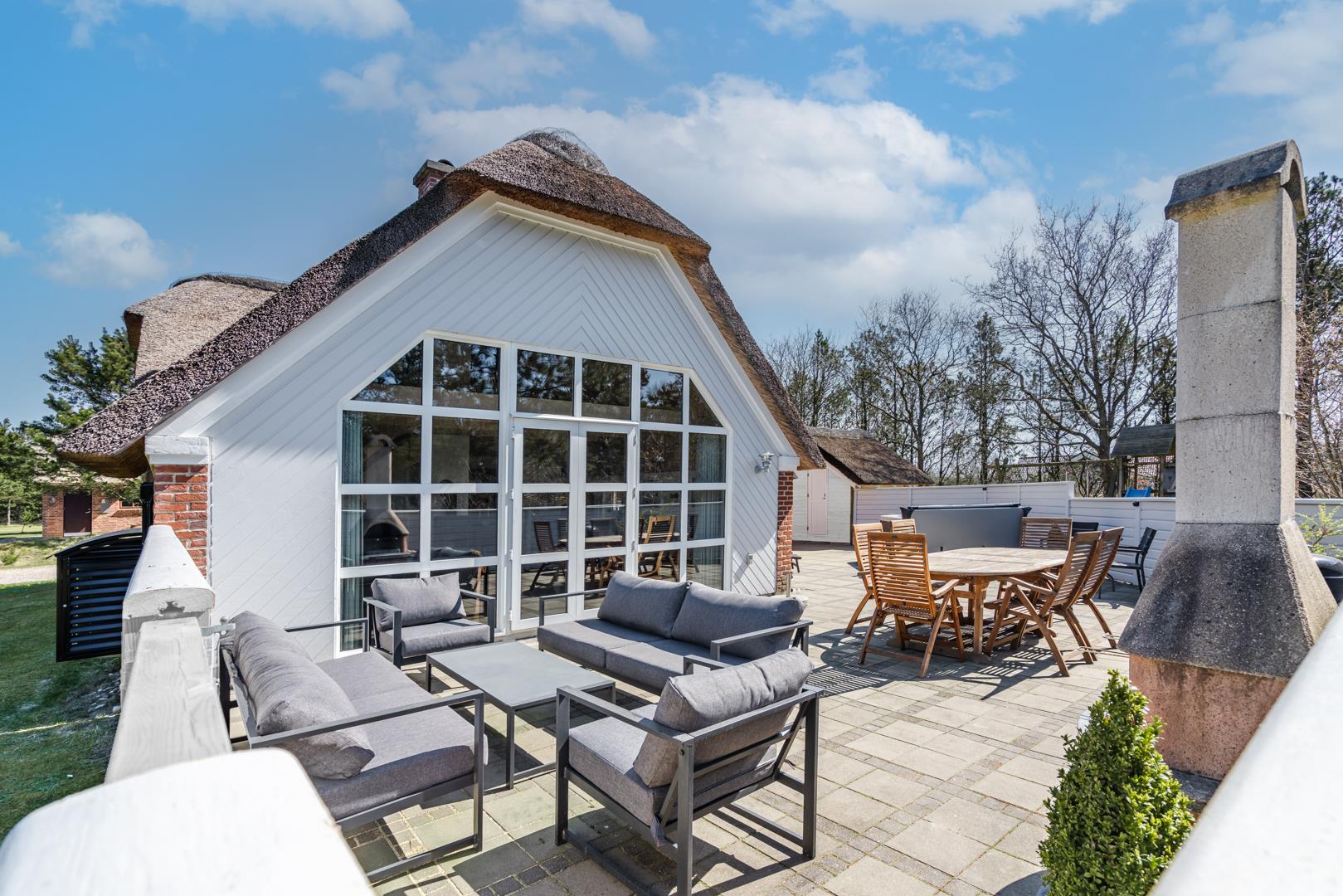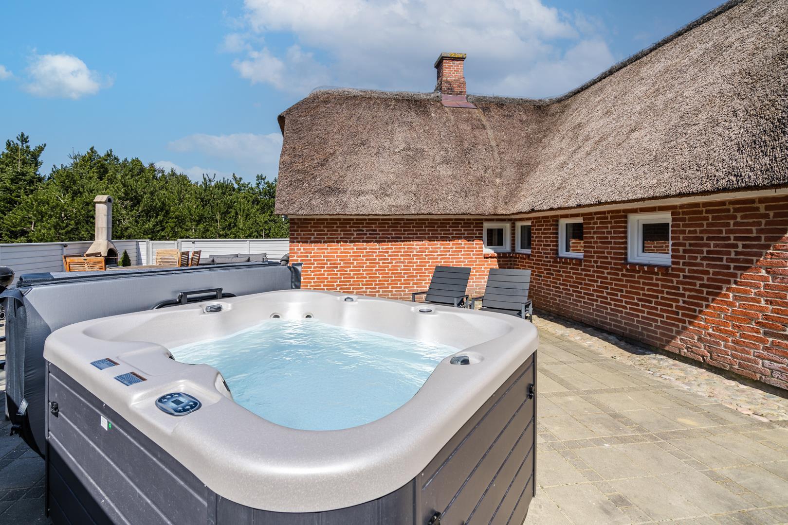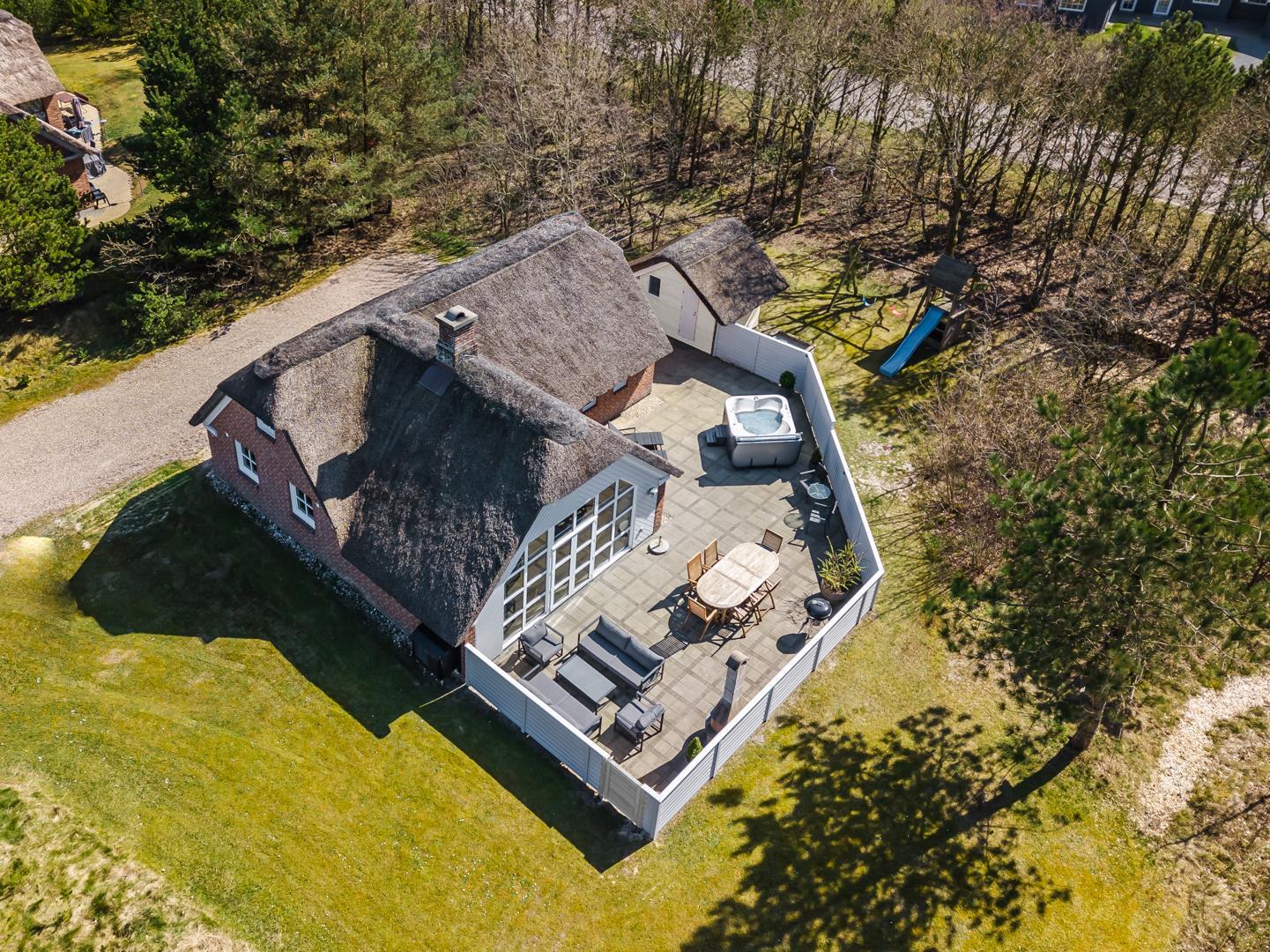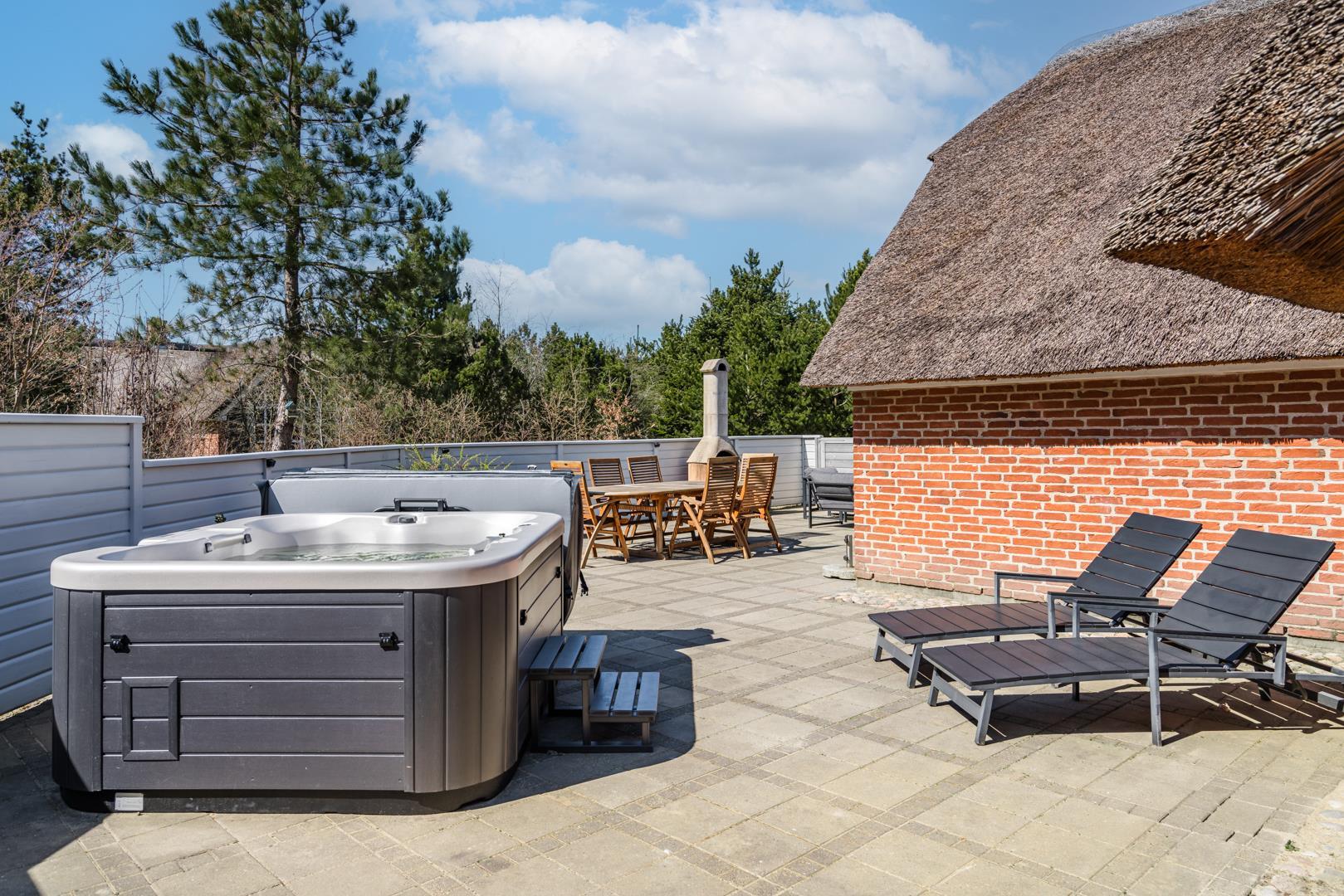 Nyd de dejlige udendørsarealer med en helt lukket flisebelagt terrasse – perfekt til både afslapning og hyggelige måltider under åben himmel. Huset byder desuden på en skøn udendørs spa, hvor du kan læne dig tilbage og nyde roen i de naturskønne omgivelser.