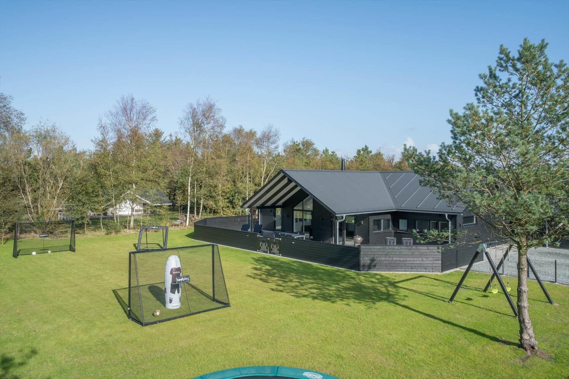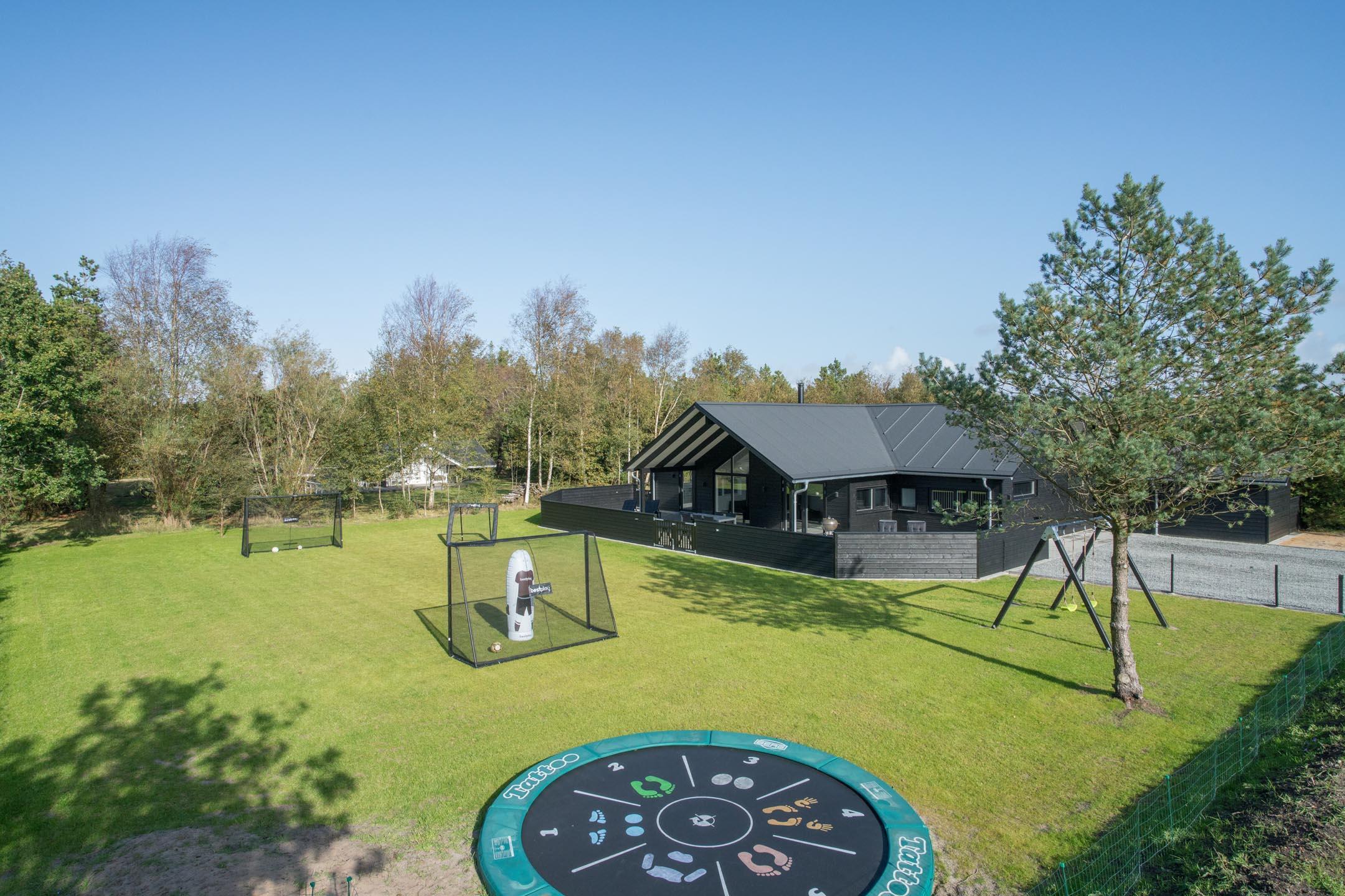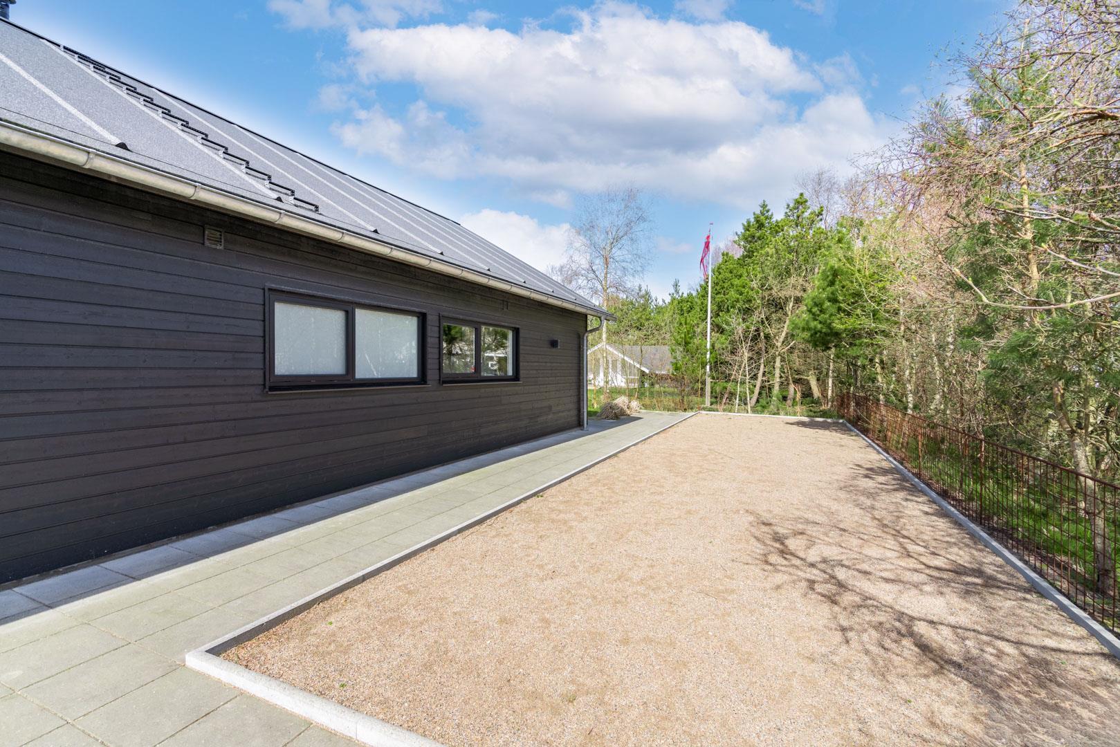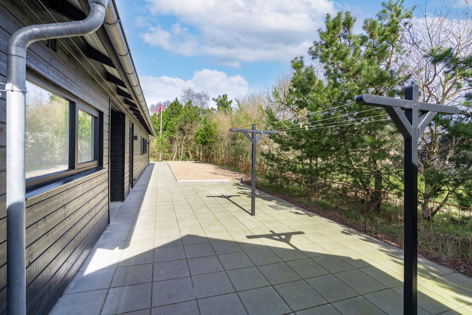Stor indhegnet terrasse på ca. 70m2 - 3 udgange, hvor børn og hund kan holdes inde. En del af terrassen (ca 20 m2) er overdækket og medvirkende til at forlænge sommeren. På den dejlige grund er der fodboldmål, sandkasse, petanque bane og gynger samt trampolin, som indbyder til leg og boldspil. Huset udlejes kun til familier - ingen udlejning til grupper. Separat og aflåst skur til lejer - og med ekstra køleskab. Et helt igennem gennemført hus !