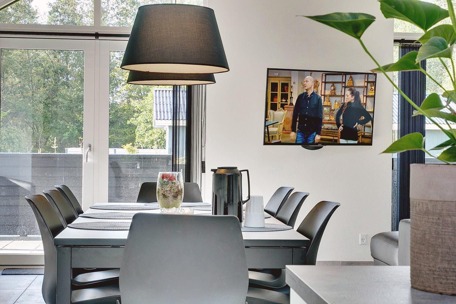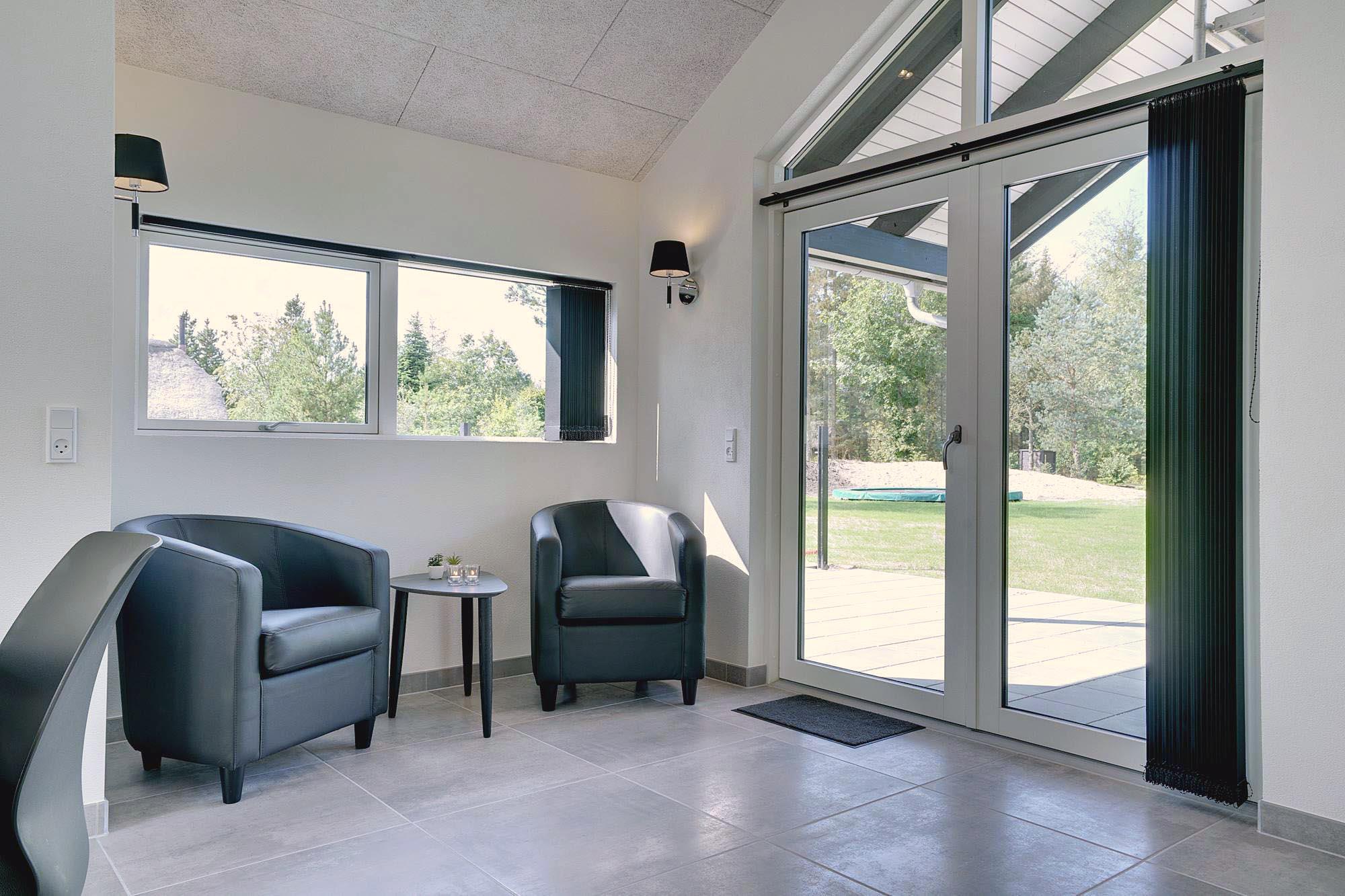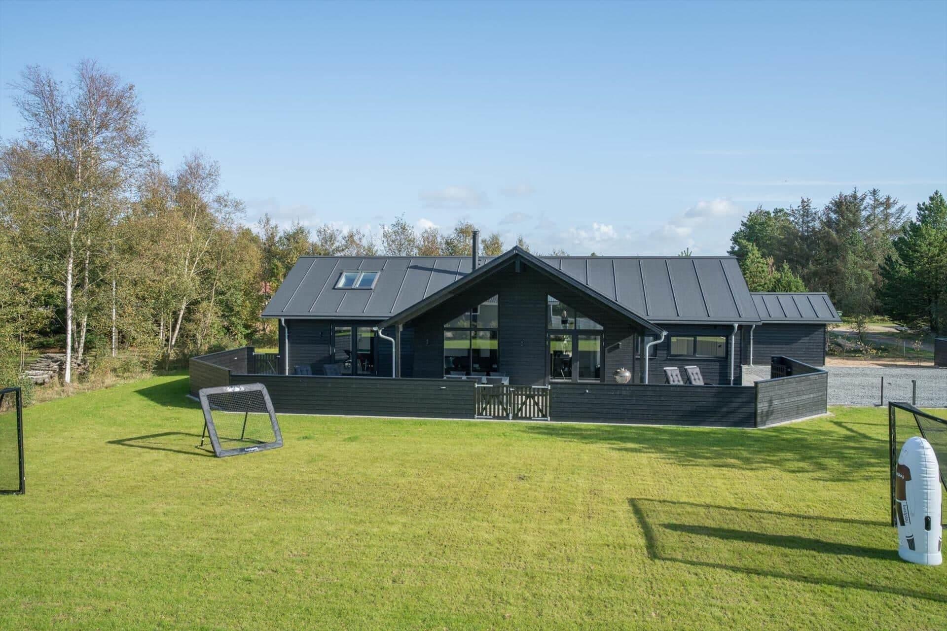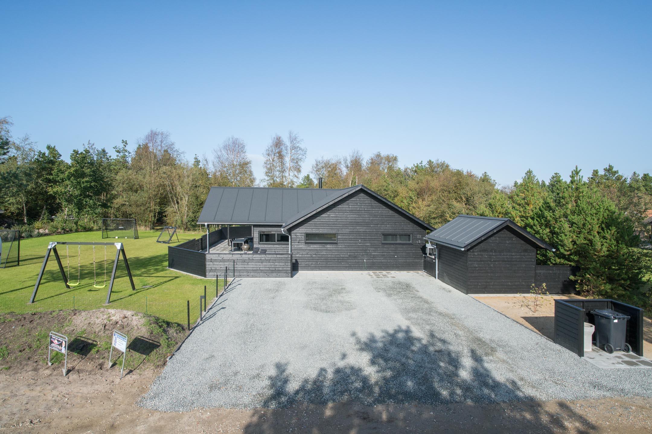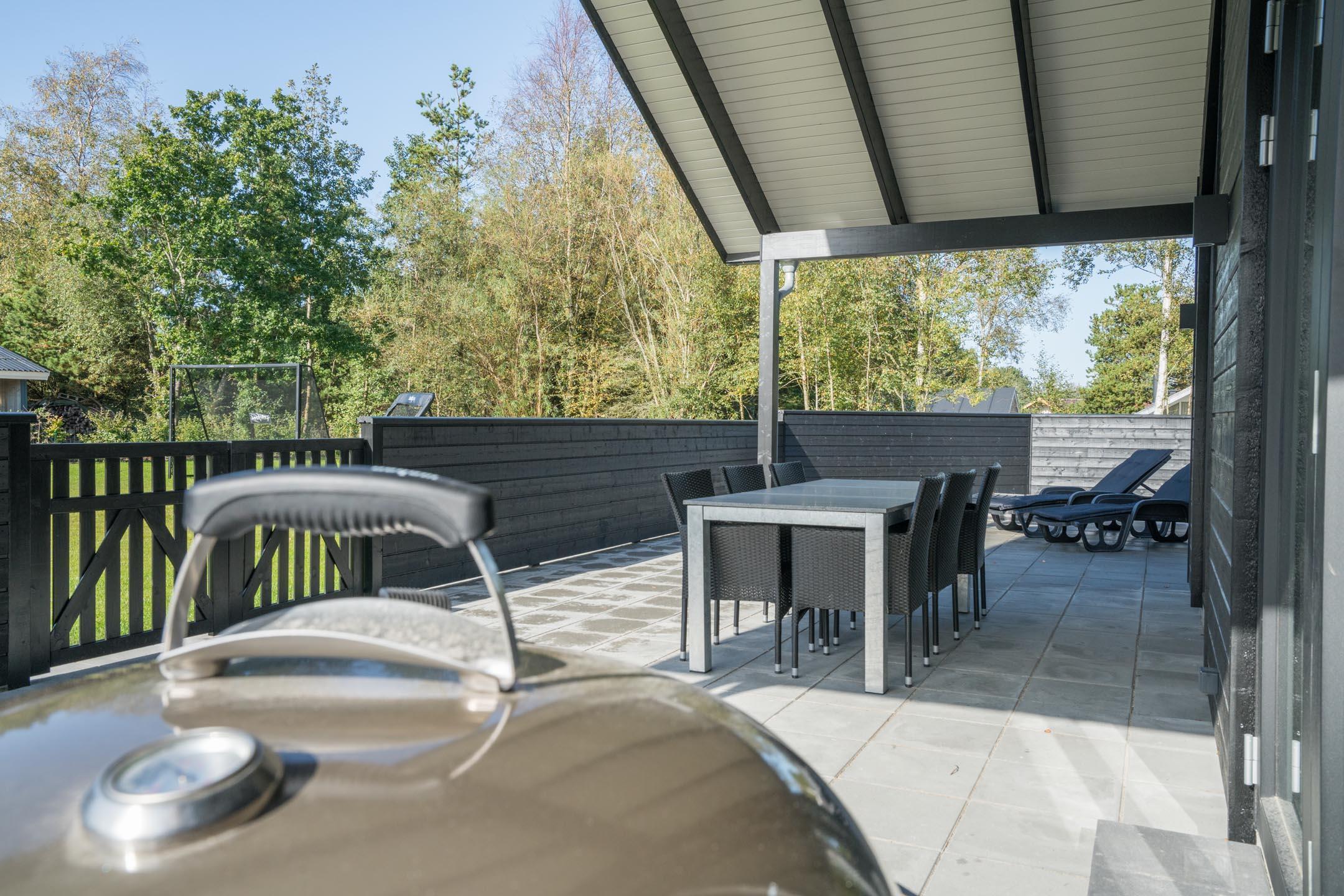 Stor indhegnet terrasse på ca. 70m2 - 3 udgange, hvor børn og hund kan holdes inde. En del af terrassen (ca 20 m2) er overdækket og medvirkende til at forlænge sommeren. På den dejlige grund er der fodboldmål, sandkasse, petanque bane og gynger samt trampolin, som indbyder til leg og boldspil. Huset udlejes kun til familier - ingen udlejning til grupper. Separat og aflåst skur til lejer - og med ekstra køleskab. Et helt igennem gennemført hus !