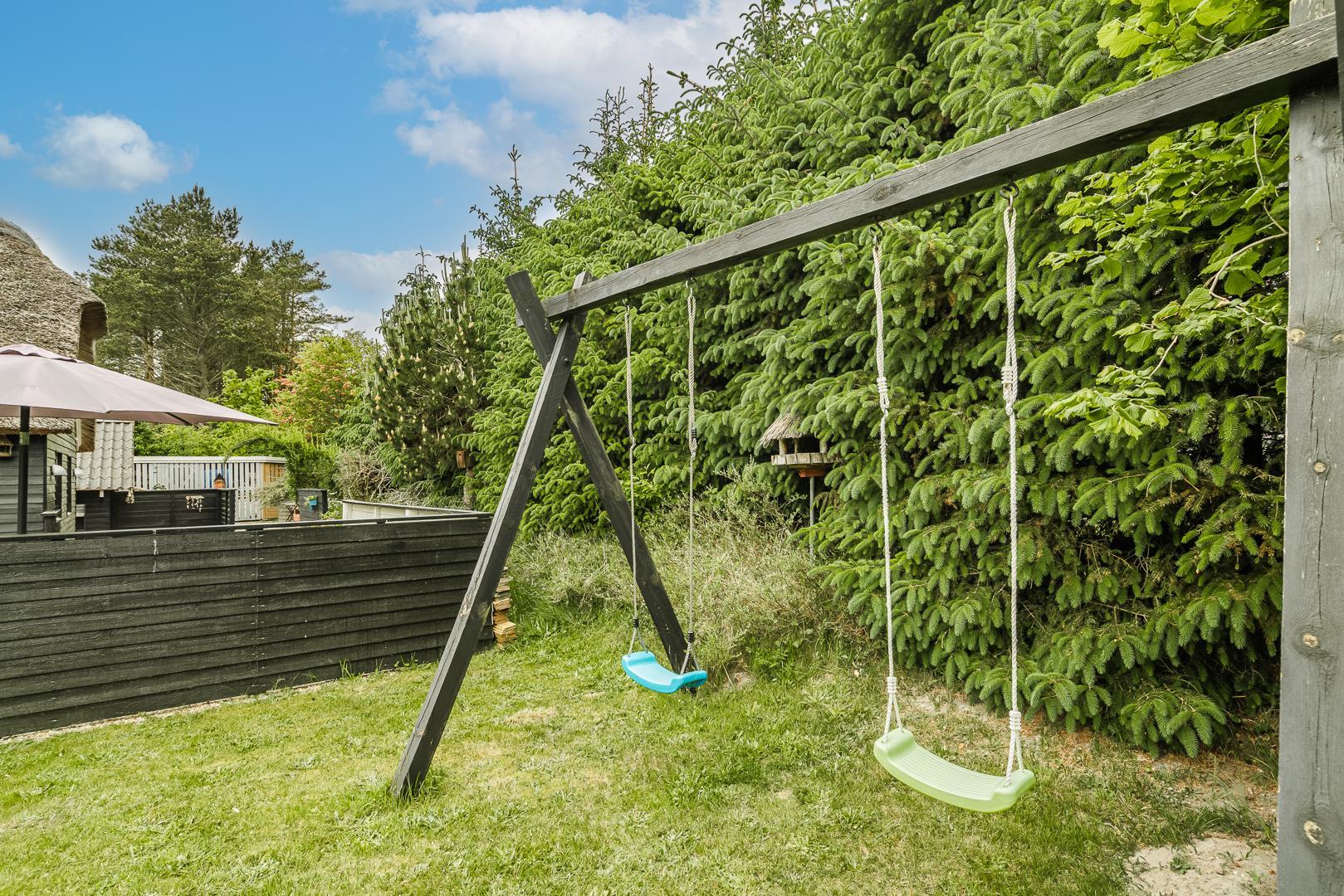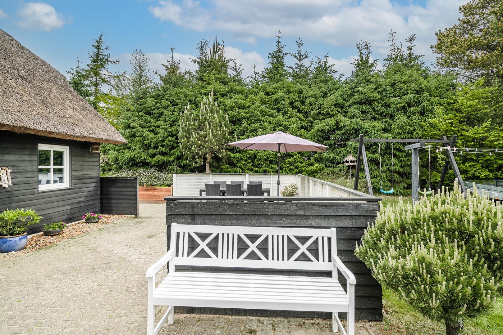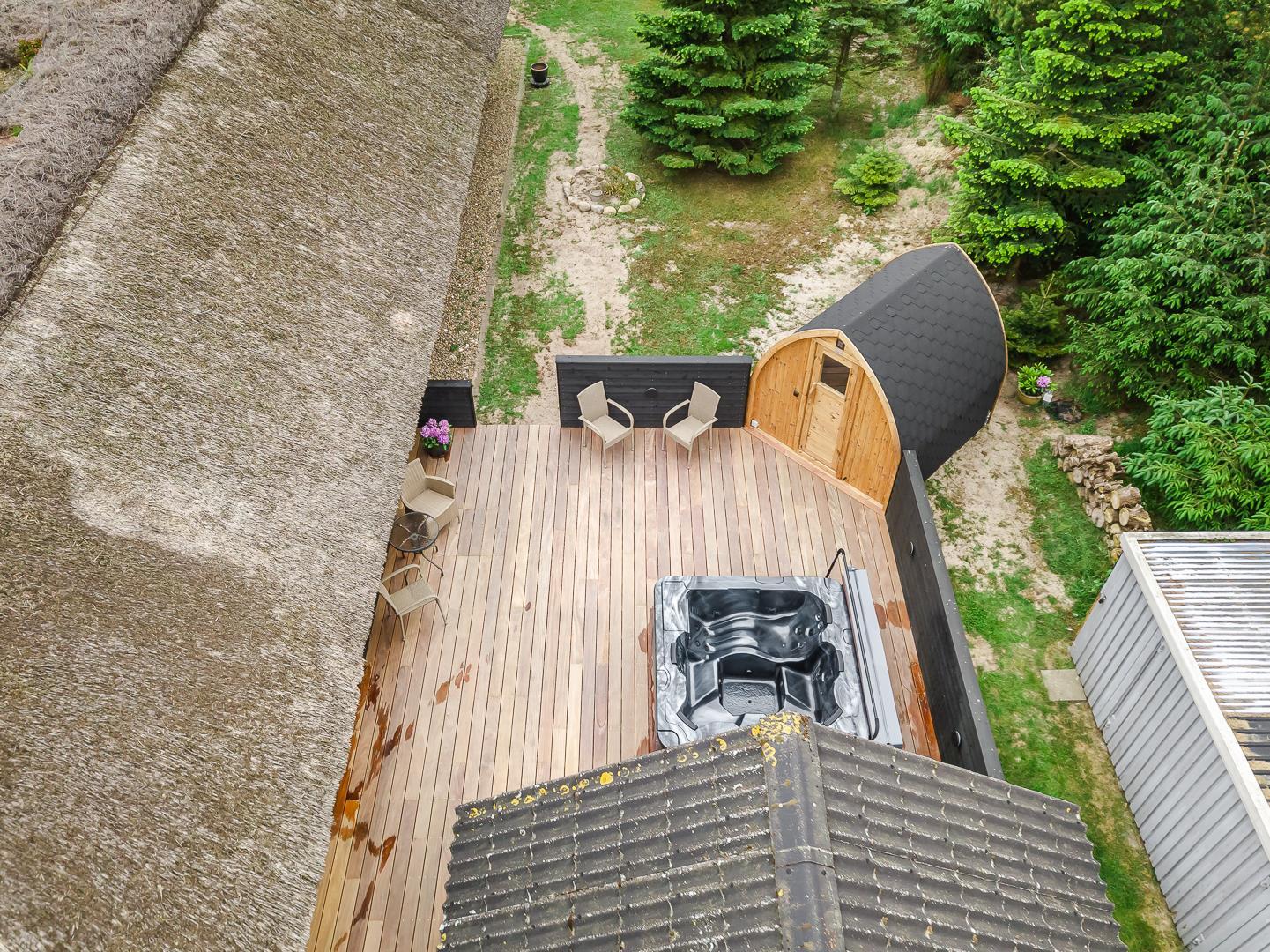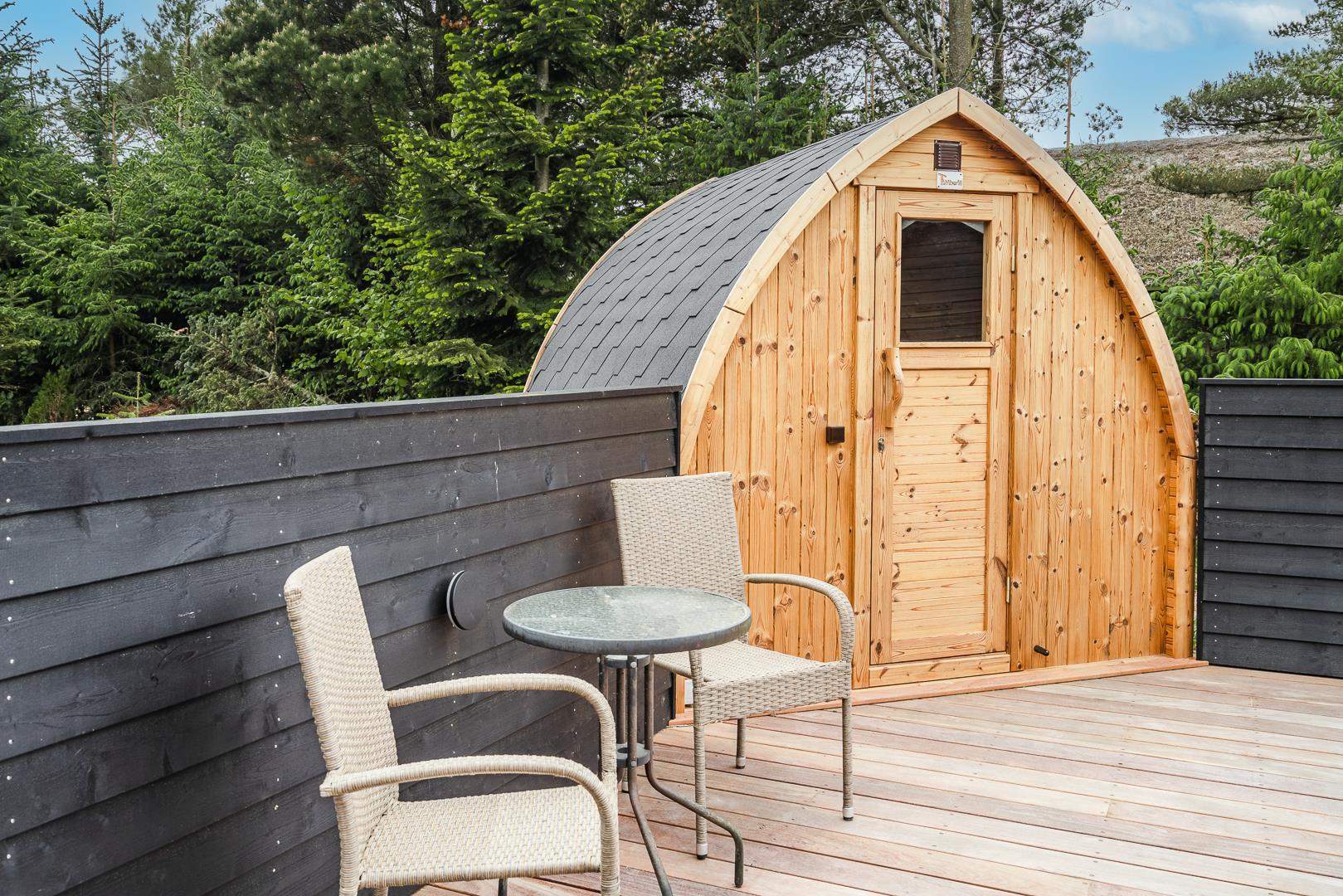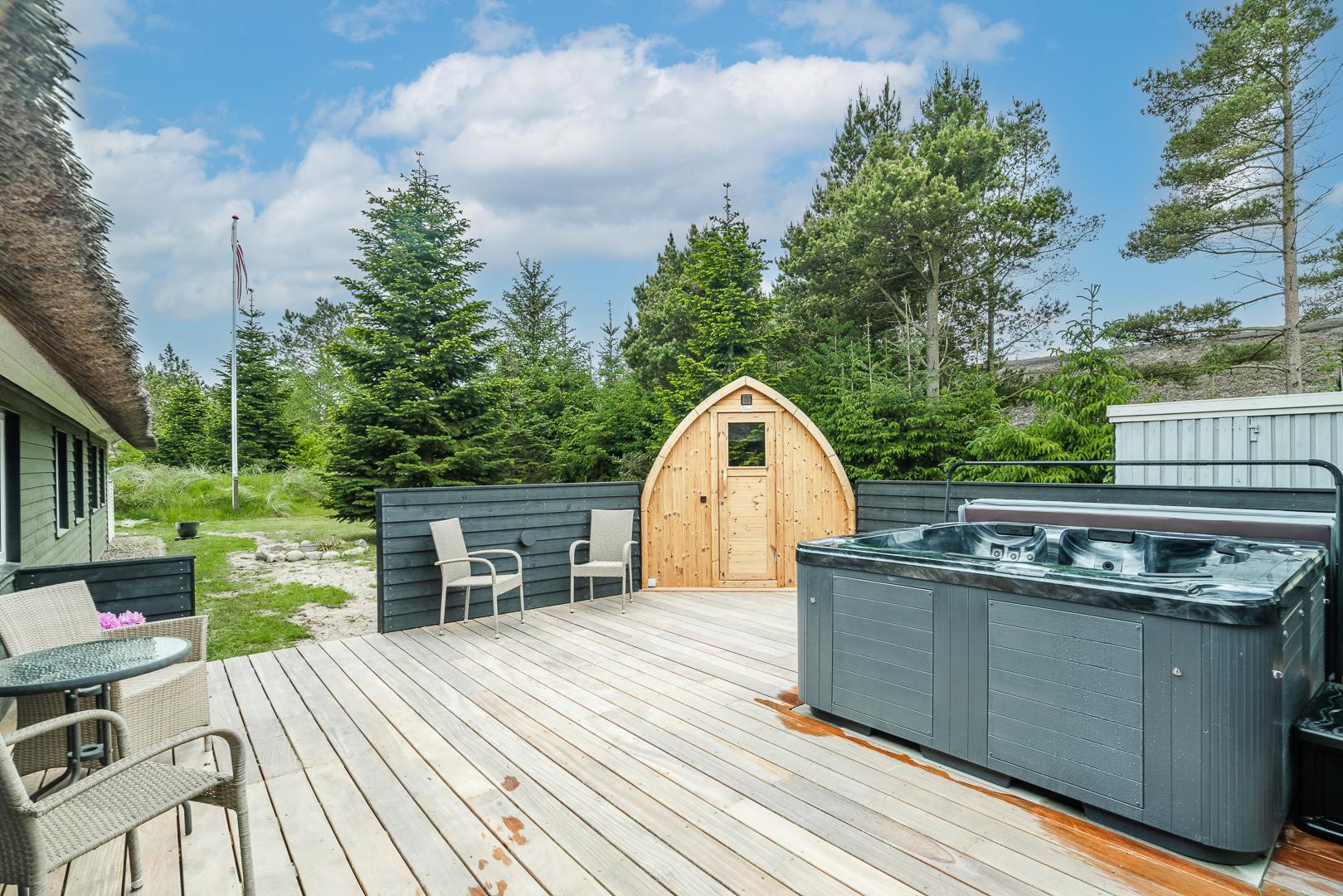 Den store, solrige træterrasse er designet til afslapning og nydelse. Her kan du lade dig forkæle i spaen, nyde varmen i saunaen eller bare slappe af i de hyggelige loungeområder. Den velbeplantede grund omkring sommerhuset skaber en idyllisk ramme med grønne omgivelser året rundt. Til familiens yngste er der et gyngestativ, og der er flere hyggelige kroge, hvor du kan nyde en god kop kaffe i solen.