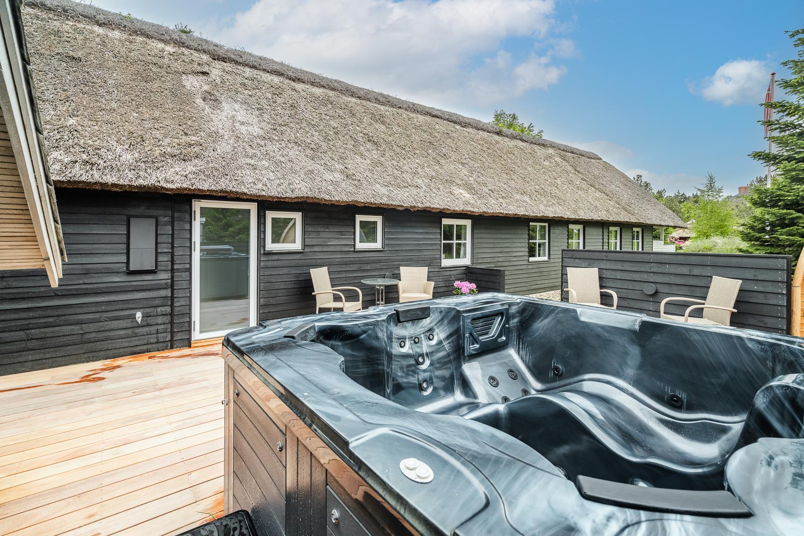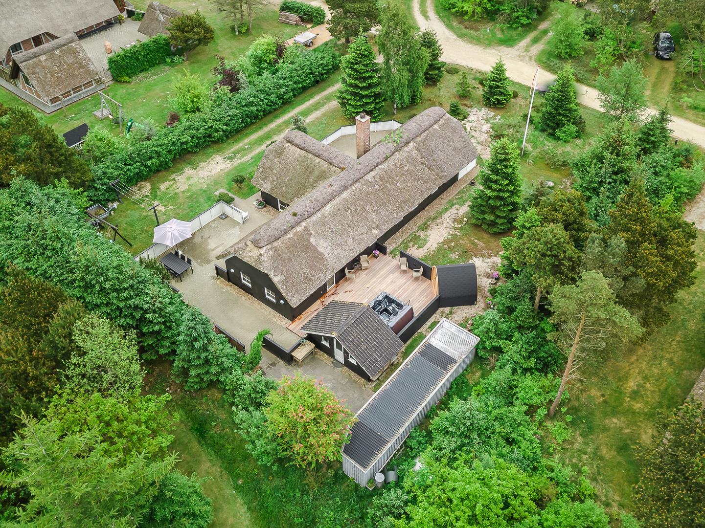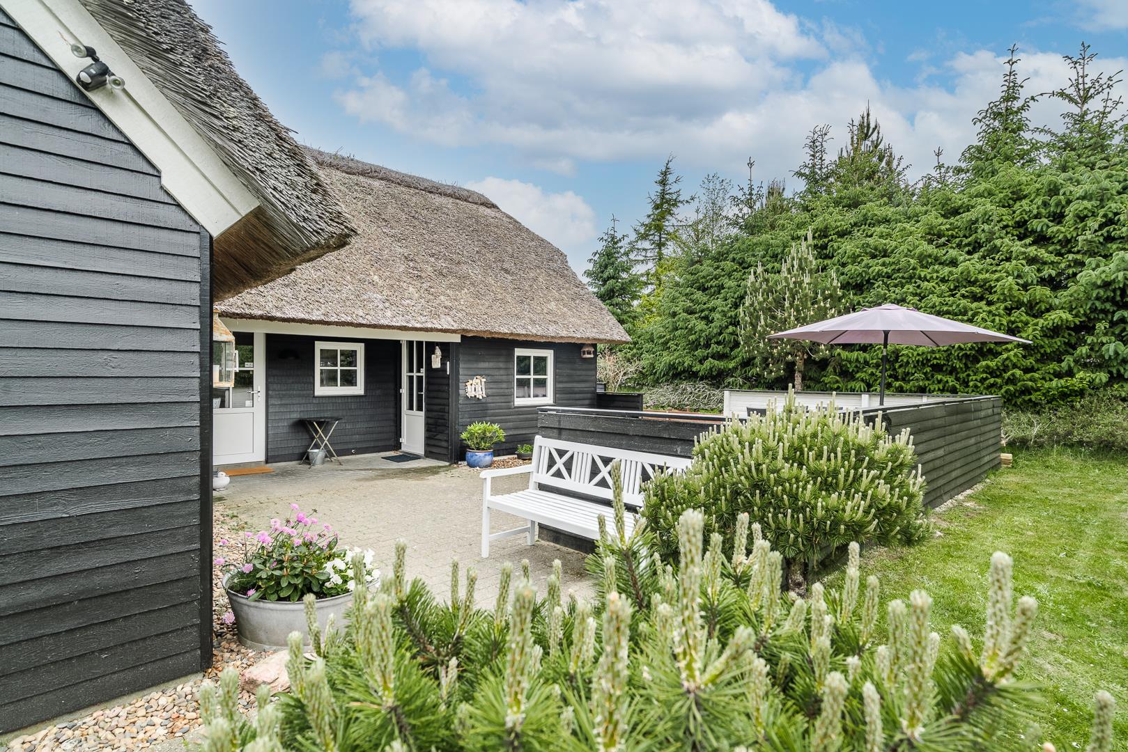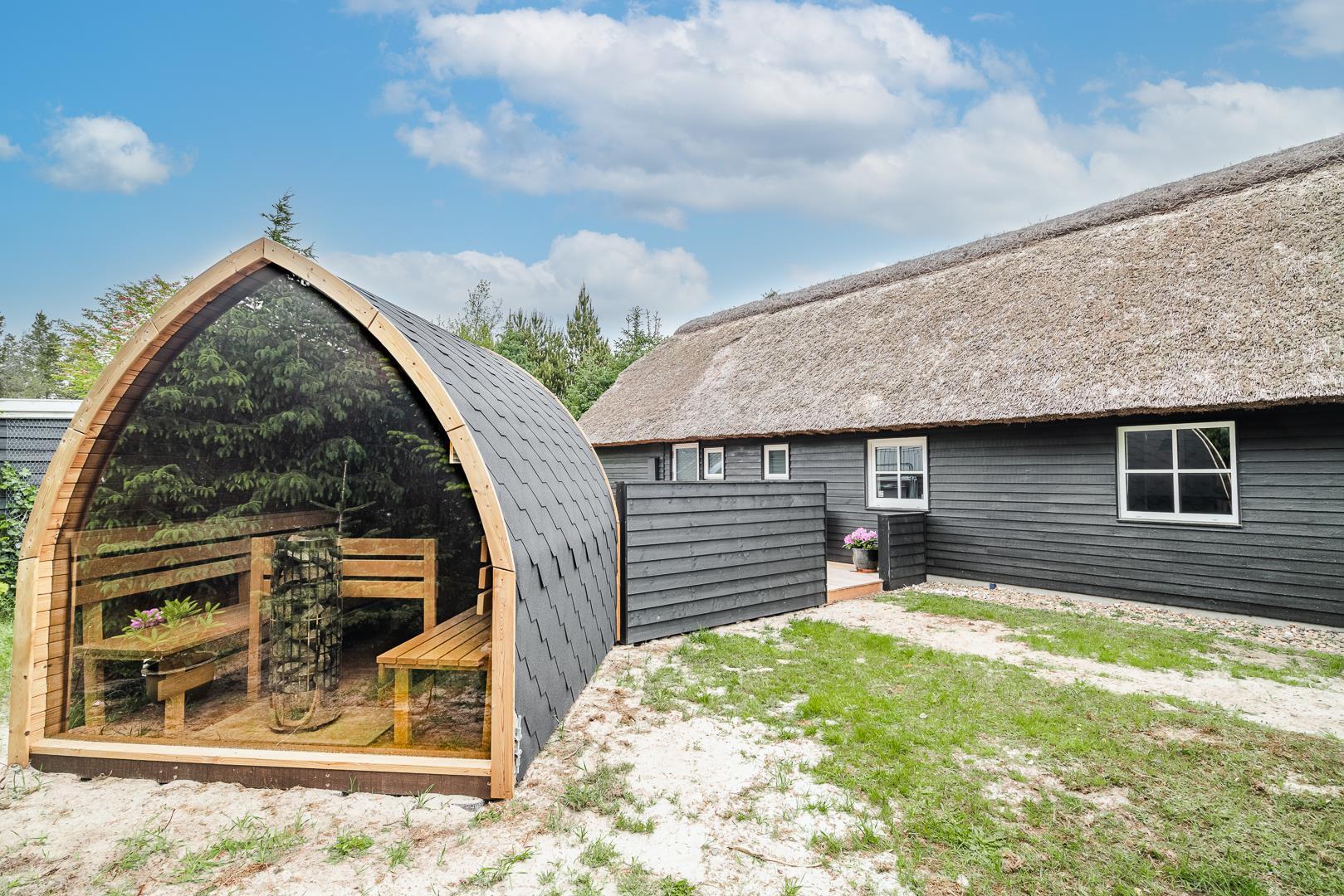 Den store, solrige træterrasse er designet til afslapning og nydelse. Her kan du lade dig forkæle i spaen, nyde varmen i saunaen eller bare slappe af i de hyggelige loungeområder. Den velbeplantede grund omkring sommerhuset skaber en idyllisk ramme med grønne omgivelser året rundt. Til familiens yngste er der et gyngestativ, og der er flere hyggelige kroge, hvor du kan nyde en god kop kaffe i solen.