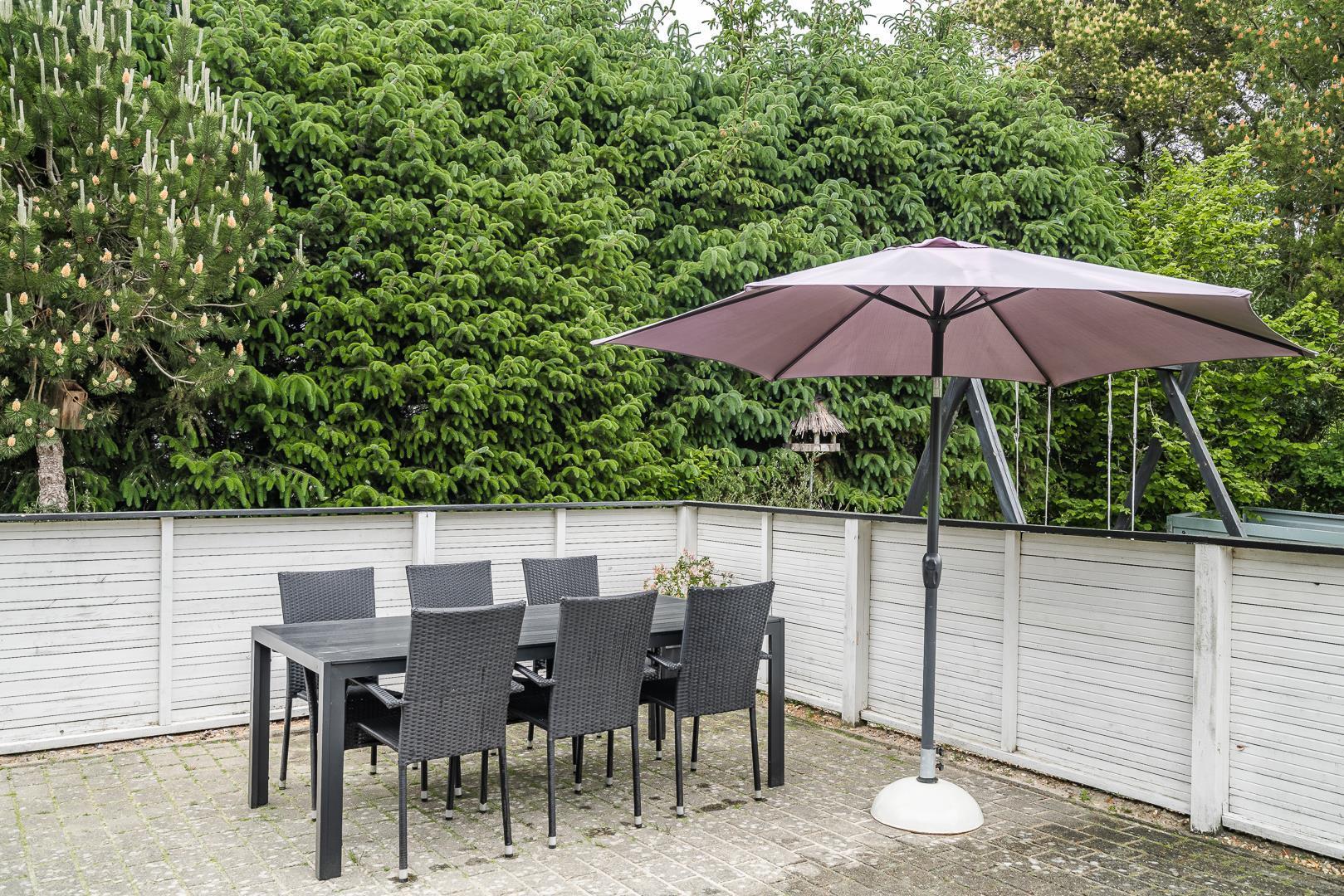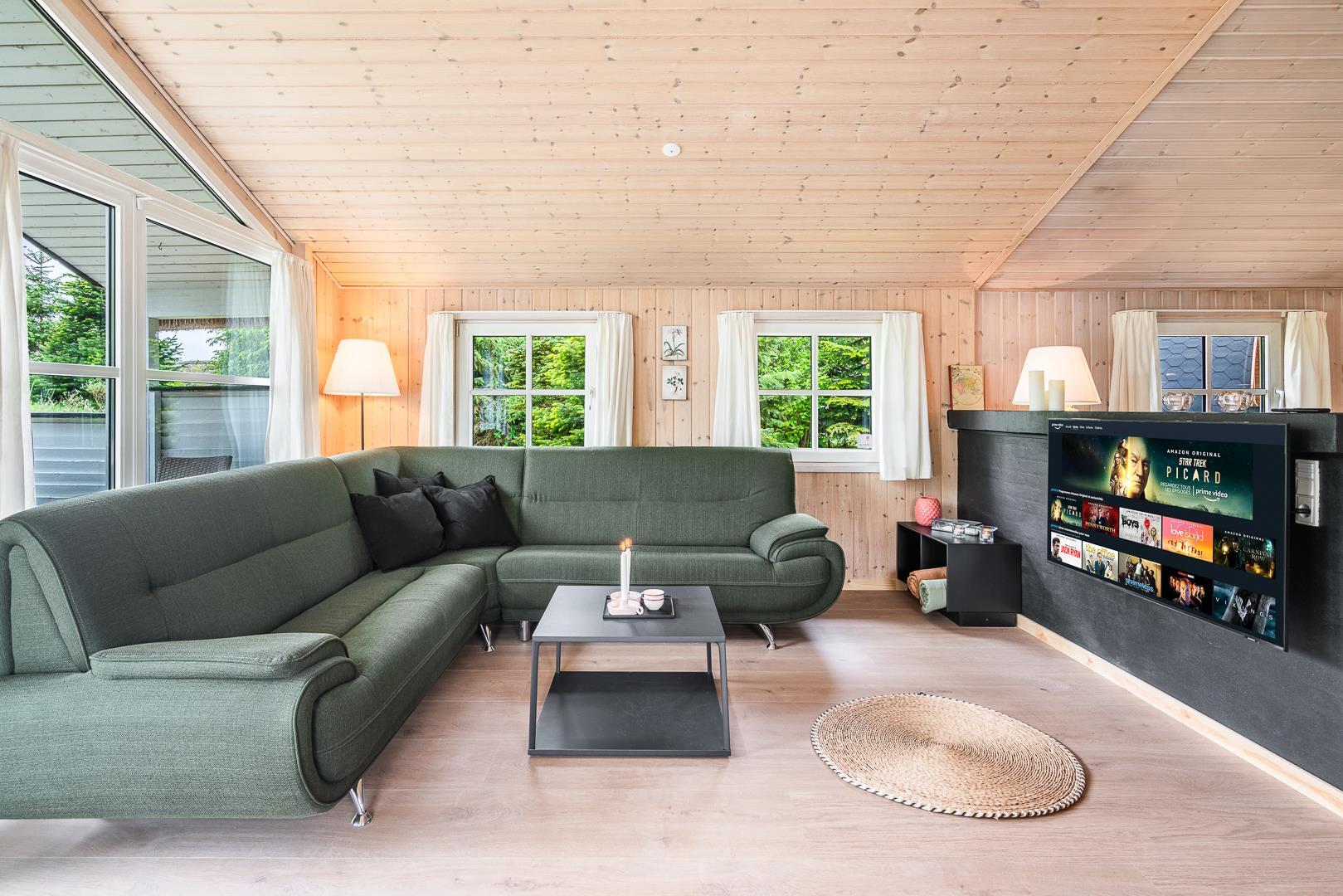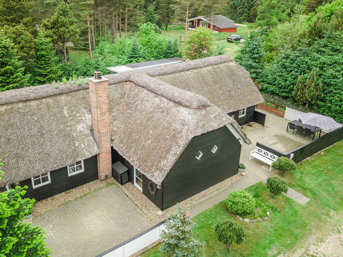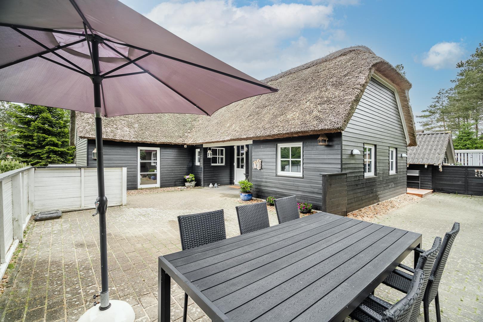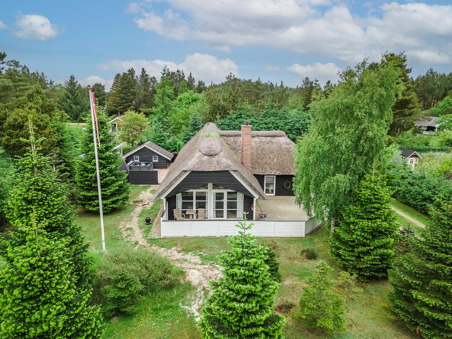 Den store, solrige træterrasse er designet til afslapning og nydelse. Her kan du lade dig forkæle i spaen, nyde varmen i saunaen eller bare slappe af i de hyggelige loungeområder. Den velbeplantede grund omkring sommerhuset skaber en idyllisk ramme med grønne omgivelser året rundt. Til familiens yngste er der et gyngestativ, og der er flere hyggelige kroge, hvor du kan nyde en god kop kaffe i solen.