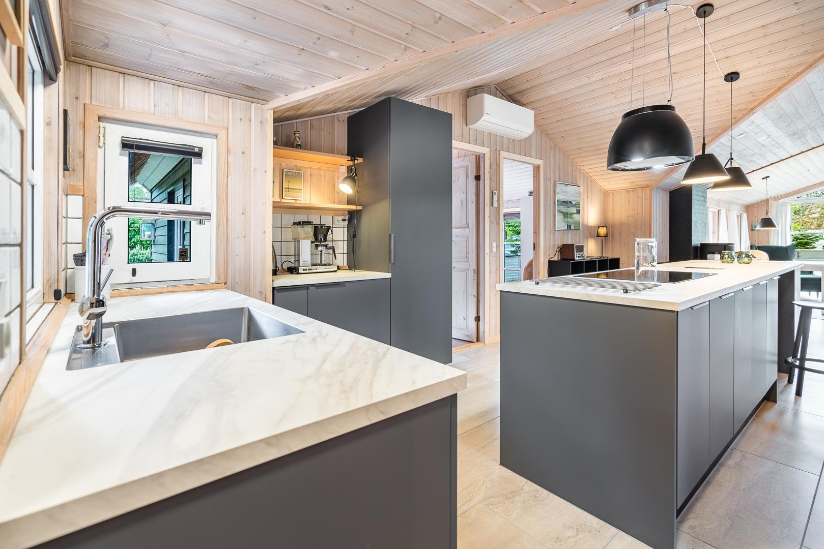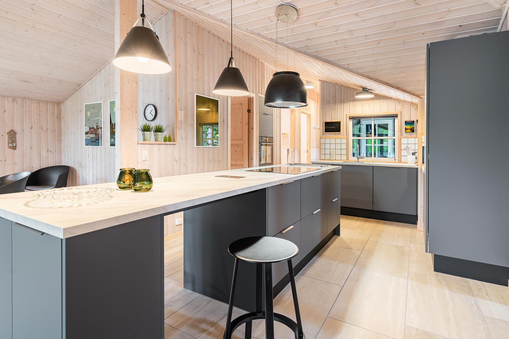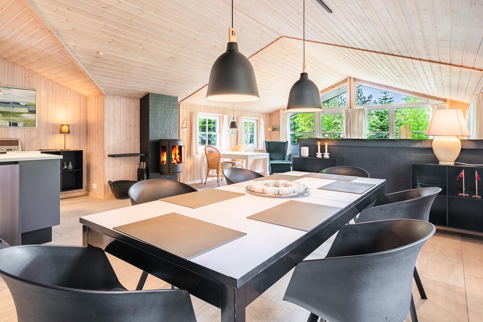 Sommerhusets hjerte er det store, åbne køkken-alrum med en elegant kogeø og masser af bordplads. Her kan familien samles over madlavningen, mens barstolene ved køkkenøen indbyder til hyggelige stunder. Køkkenet glider naturligt over i den lyse stue, hvor komfortable møbler og en centralt placeret brændeovn skaber den helt rigtige feriestemning. En miljøvenlig varmepumpe sørger for et behageligt indeklima året rundt.