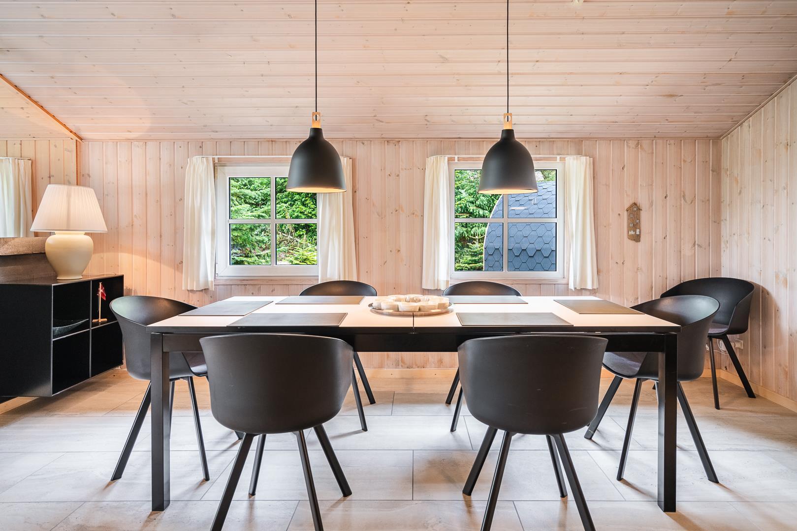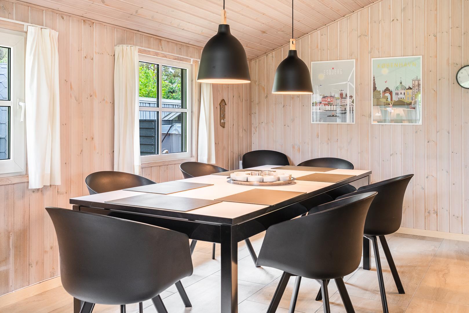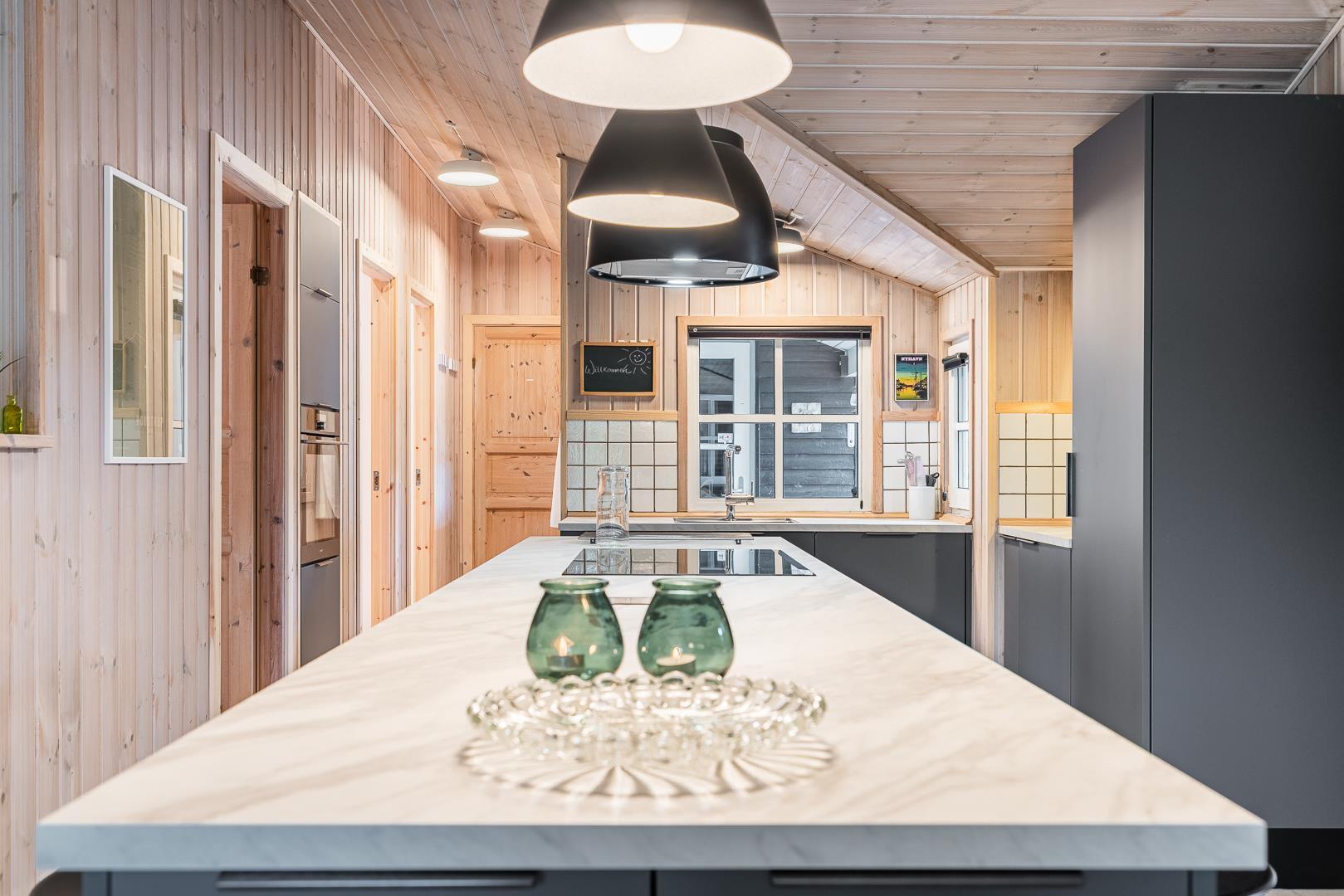Sommerhusets hjerte er det store, åbne køkken-alrum med en elegant kogeø og masser af bordplads. Her kan familien samles over madlavningen, mens barstolene ved køkkenøen indbyder til hyggelige stunder. Køkkenet glider naturligt over i den lyse stue, hvor komfortable møbler og en centralt placeret brændeovn skaber den helt rigtige feriestemning. En miljøvenlig varmepumpe sørger for et behageligt indeklima året rundt.