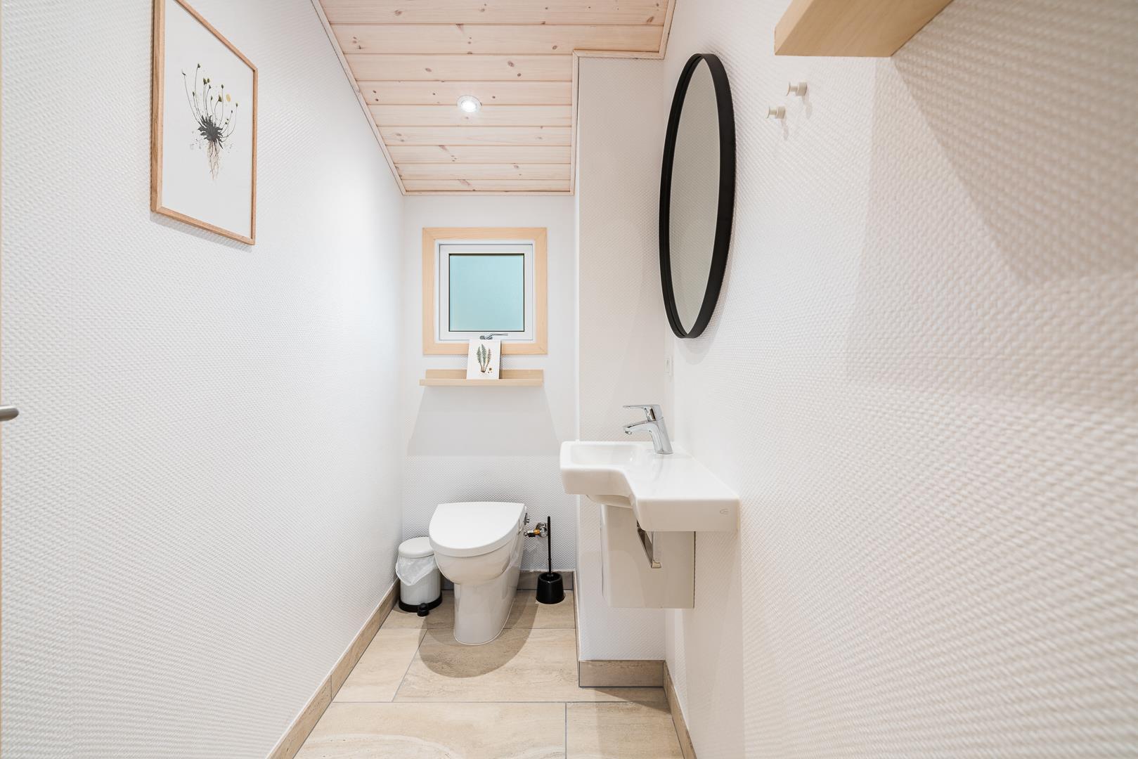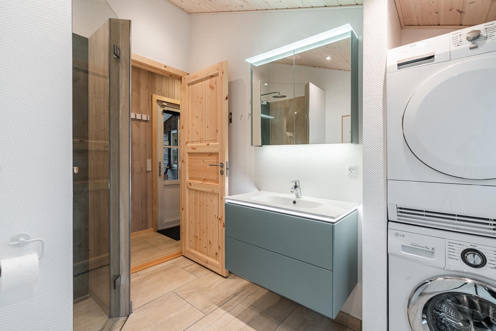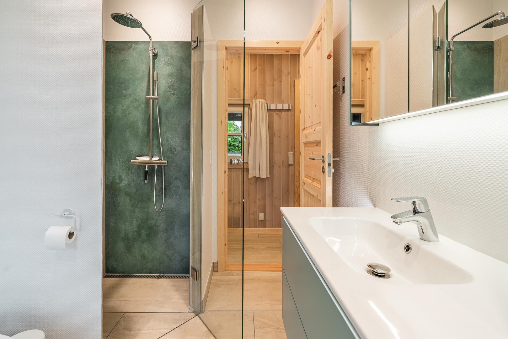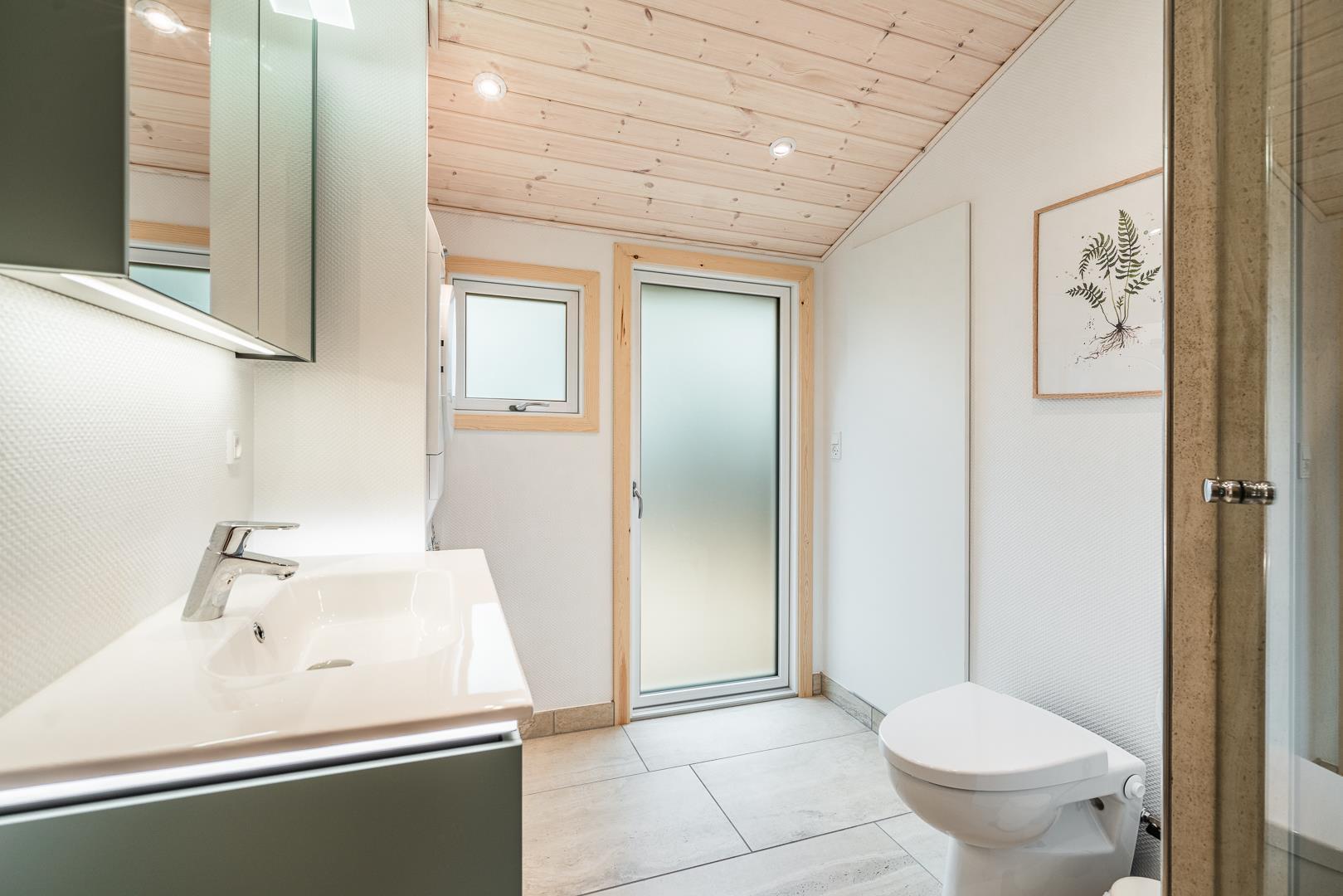 Badeværelset (renoveret i 2022) er både stilfuldt og funktionelt med direkte adgang til en af husets største attraktioner: den lækre træterrasse med udespa og sauna.