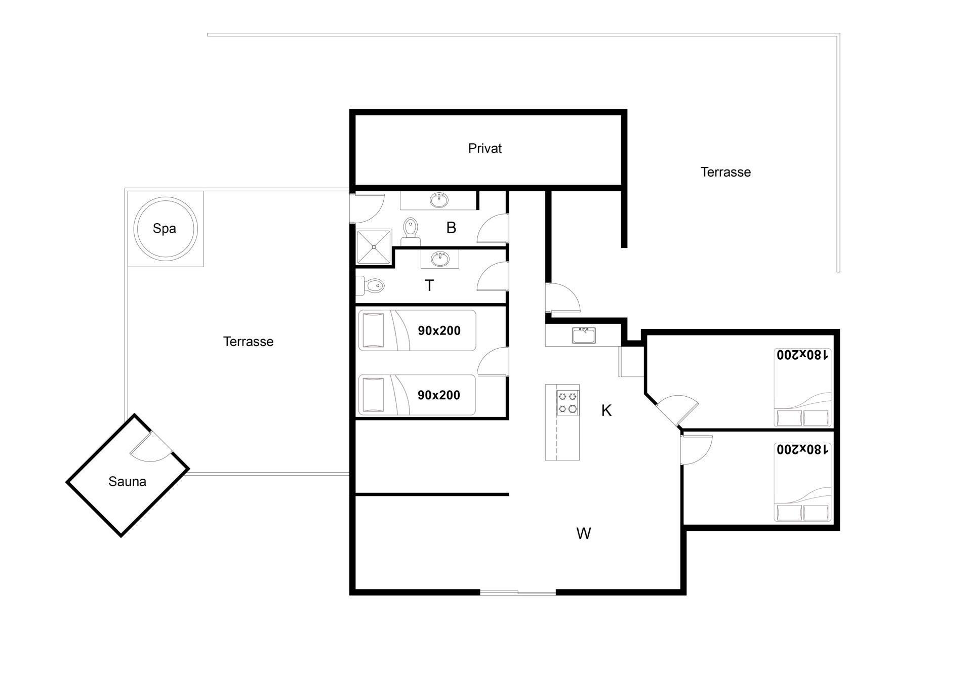 Sengestørrelse: 2 dobbeltsenge 180 x 200 cm + 2 enkeltsenge 90 x 200 cm