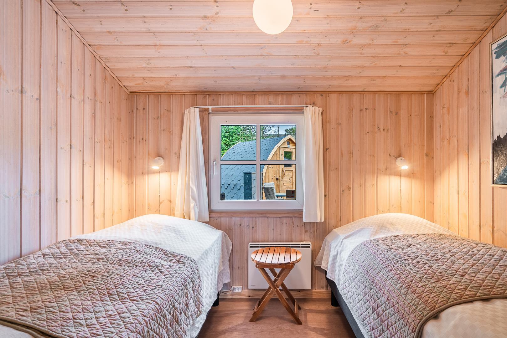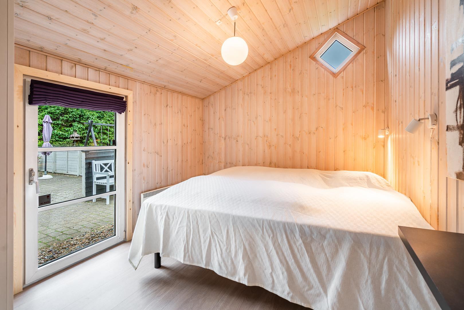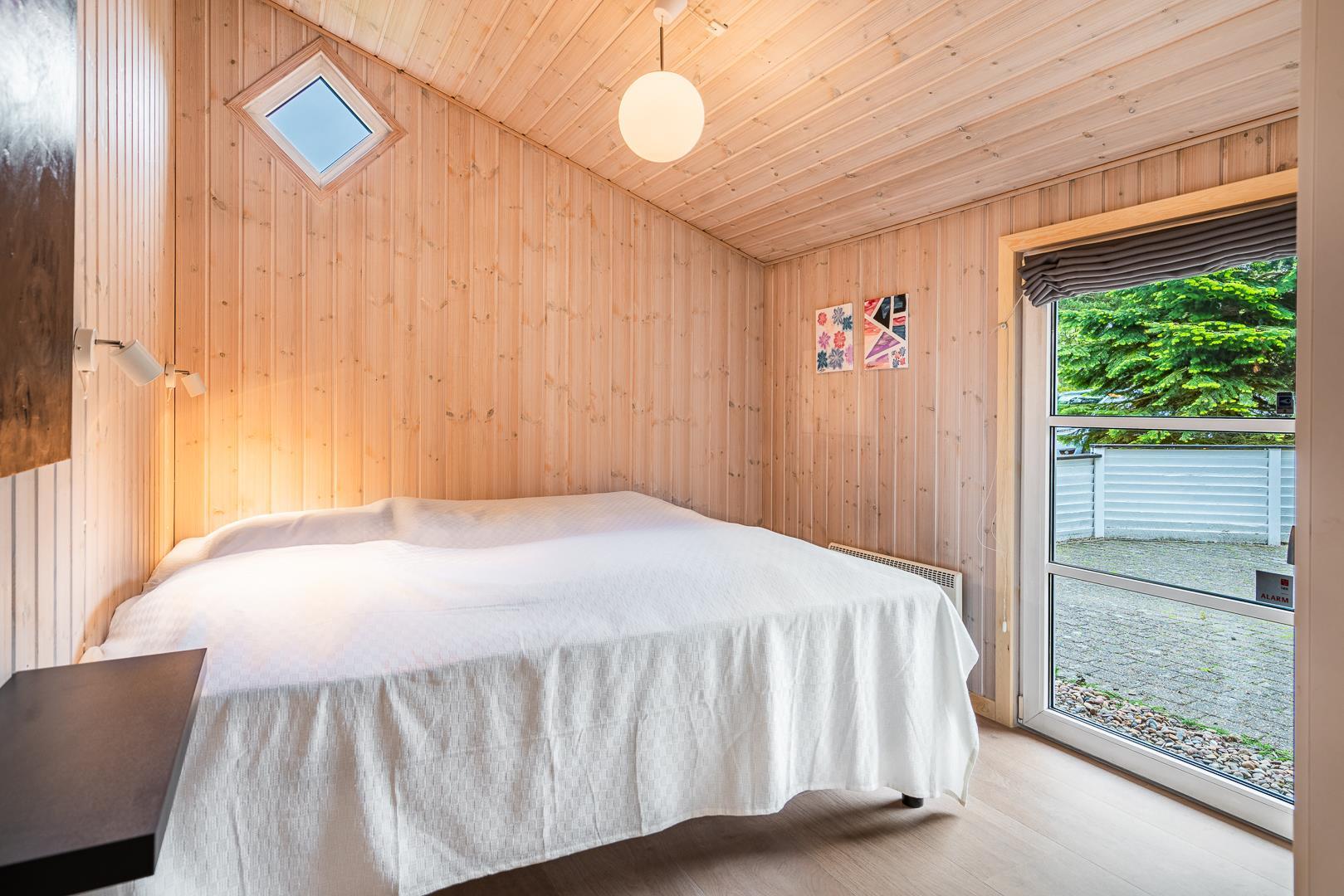 Feriehuset rummer tre velindrettede soveværelser med plads til i alt seks personer. Her er to værelser med dobbeltsenge og et værelse med to enkeltsenge.