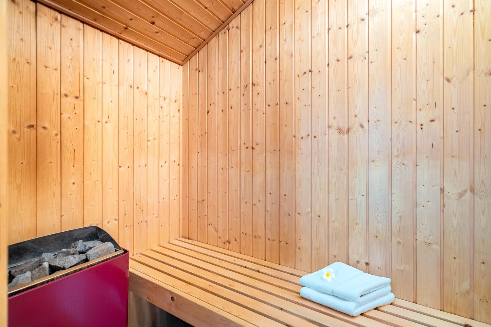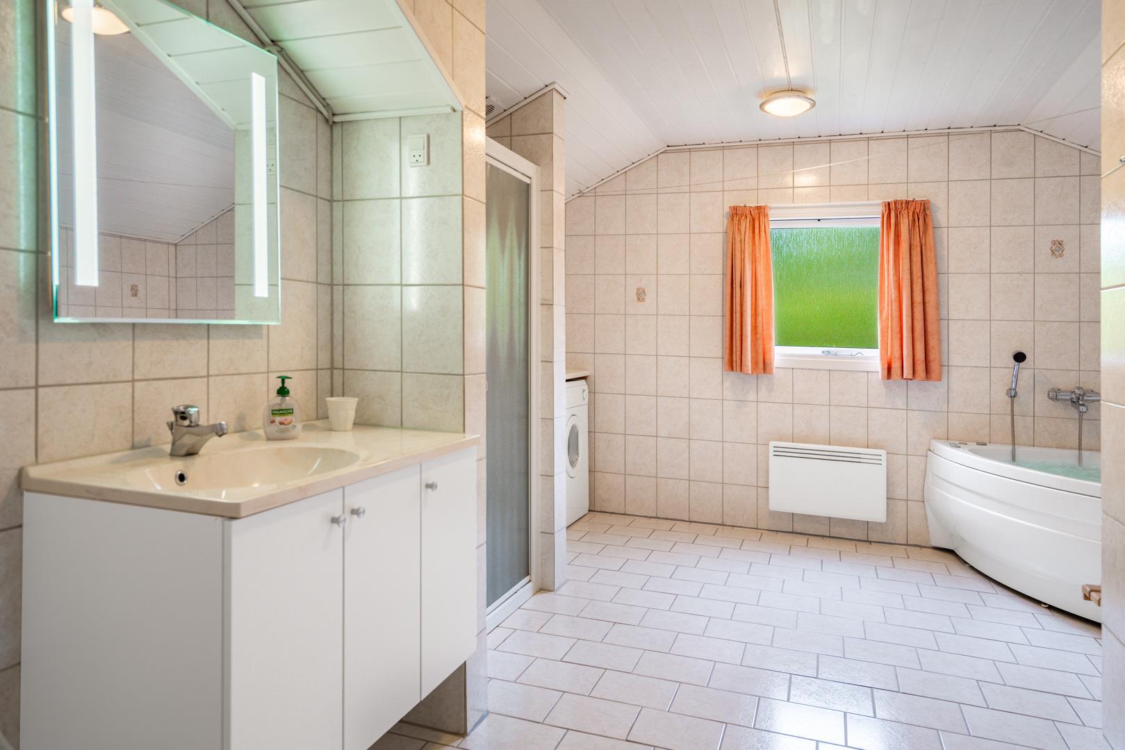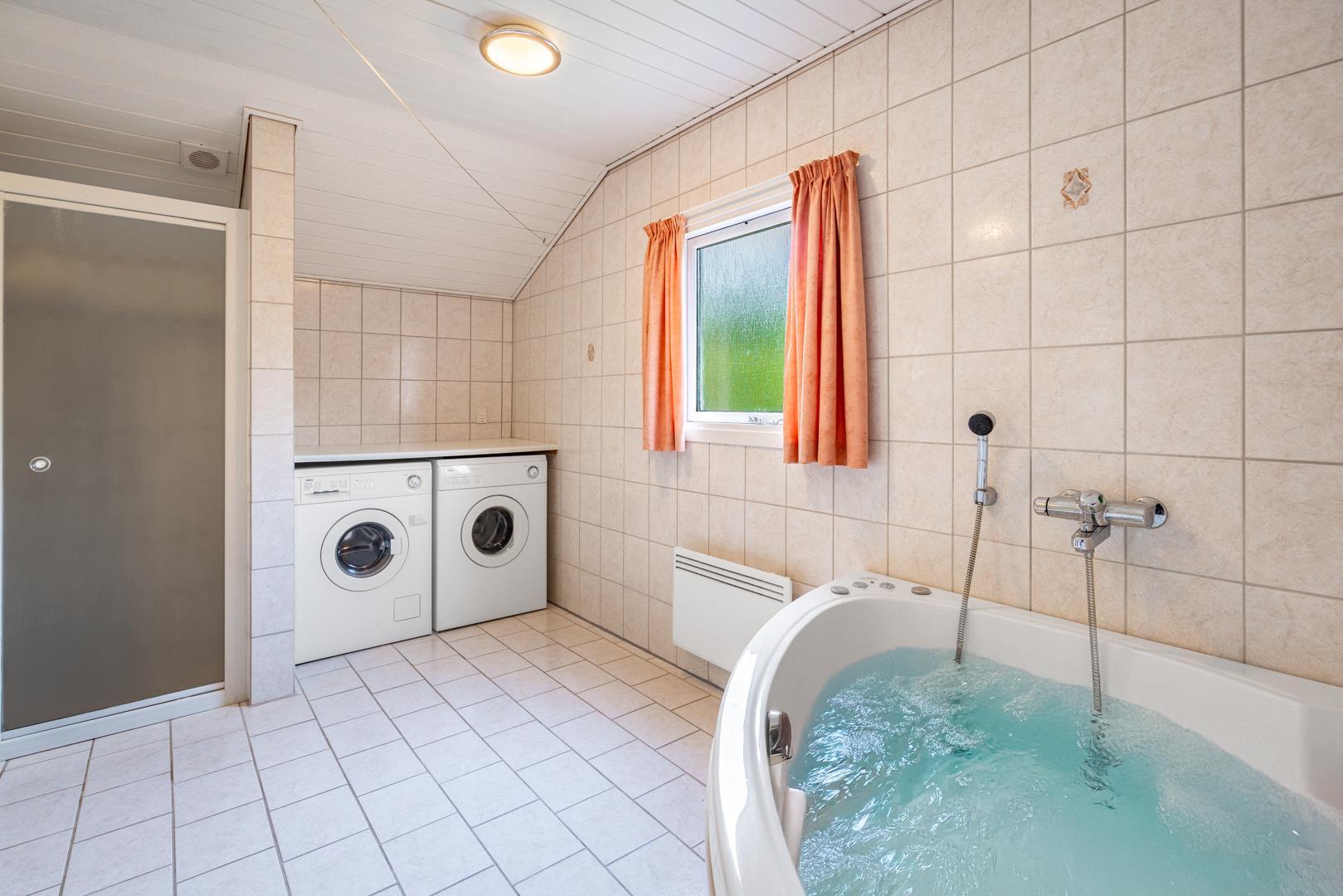 Badeværelset byder på både gulvvarme, bruseniche, 2-personers spabad og adgang til husets sauna – ideelt til ren afslapning. Der er også vaskemaskine og tørretumbler. Køkkenet har alt, hvad du skal bruge: keramisk komfur, opvaskemaskine, mikroovn og god bordplads. Det ligger i åben forbindelse med opholdsstuen.