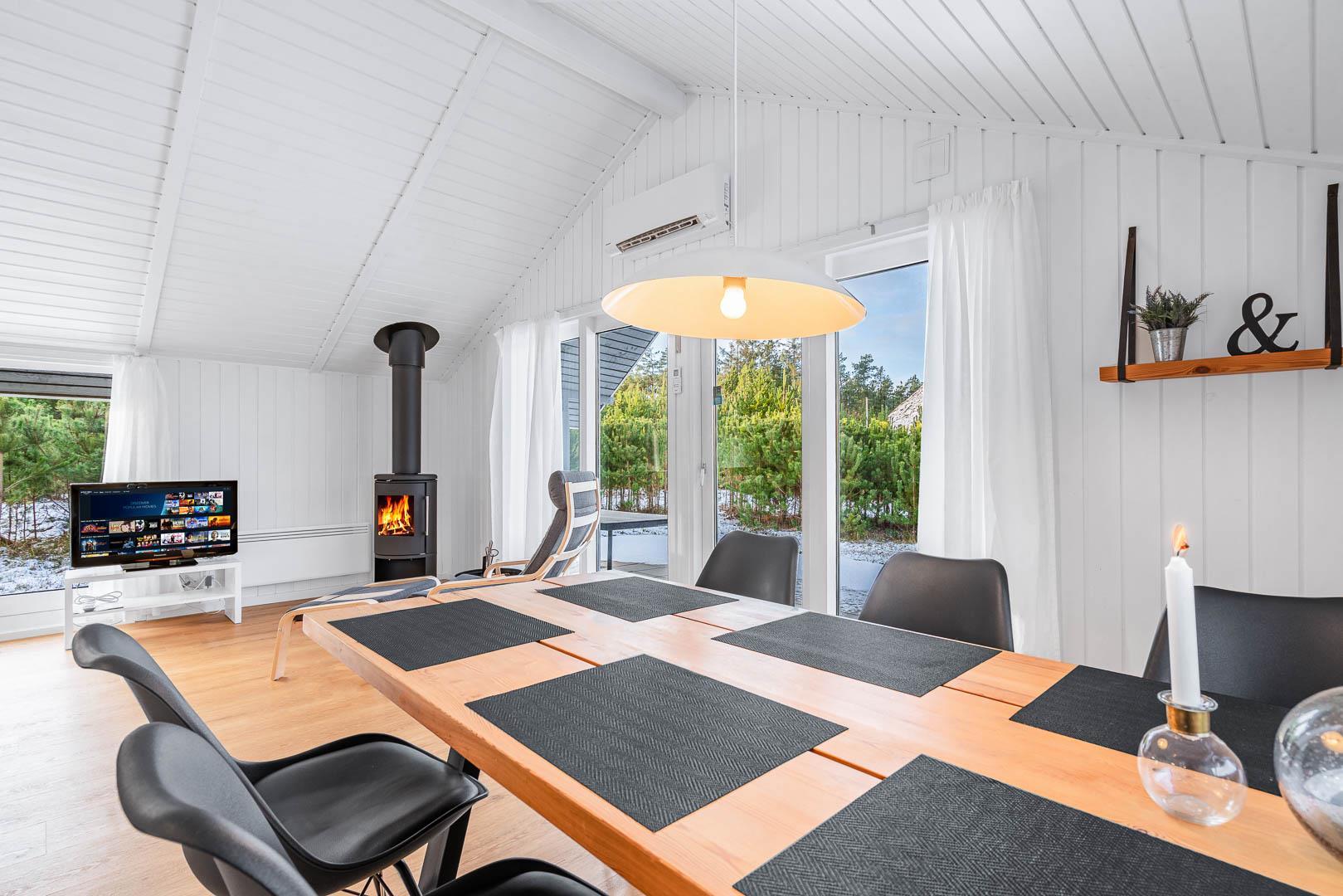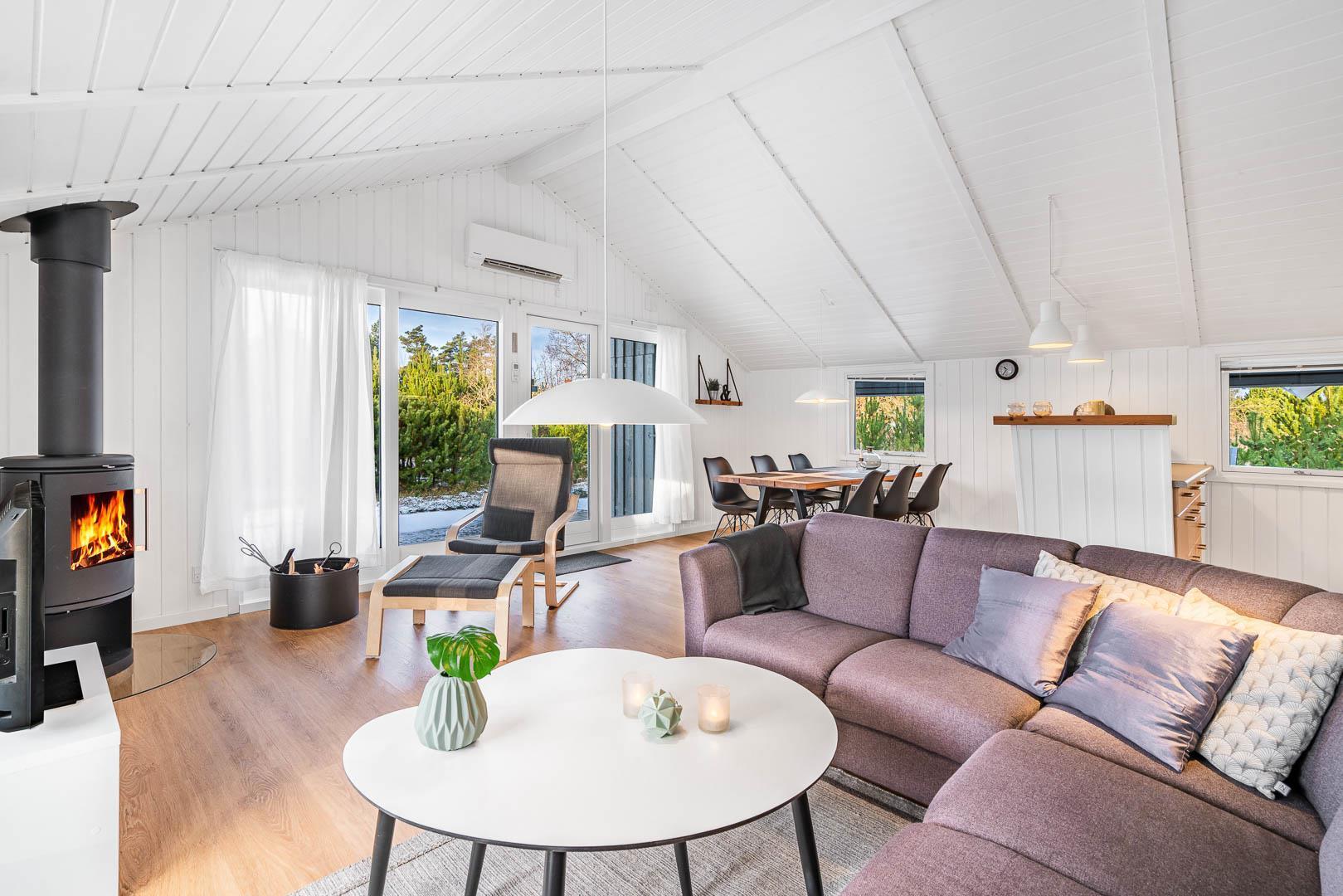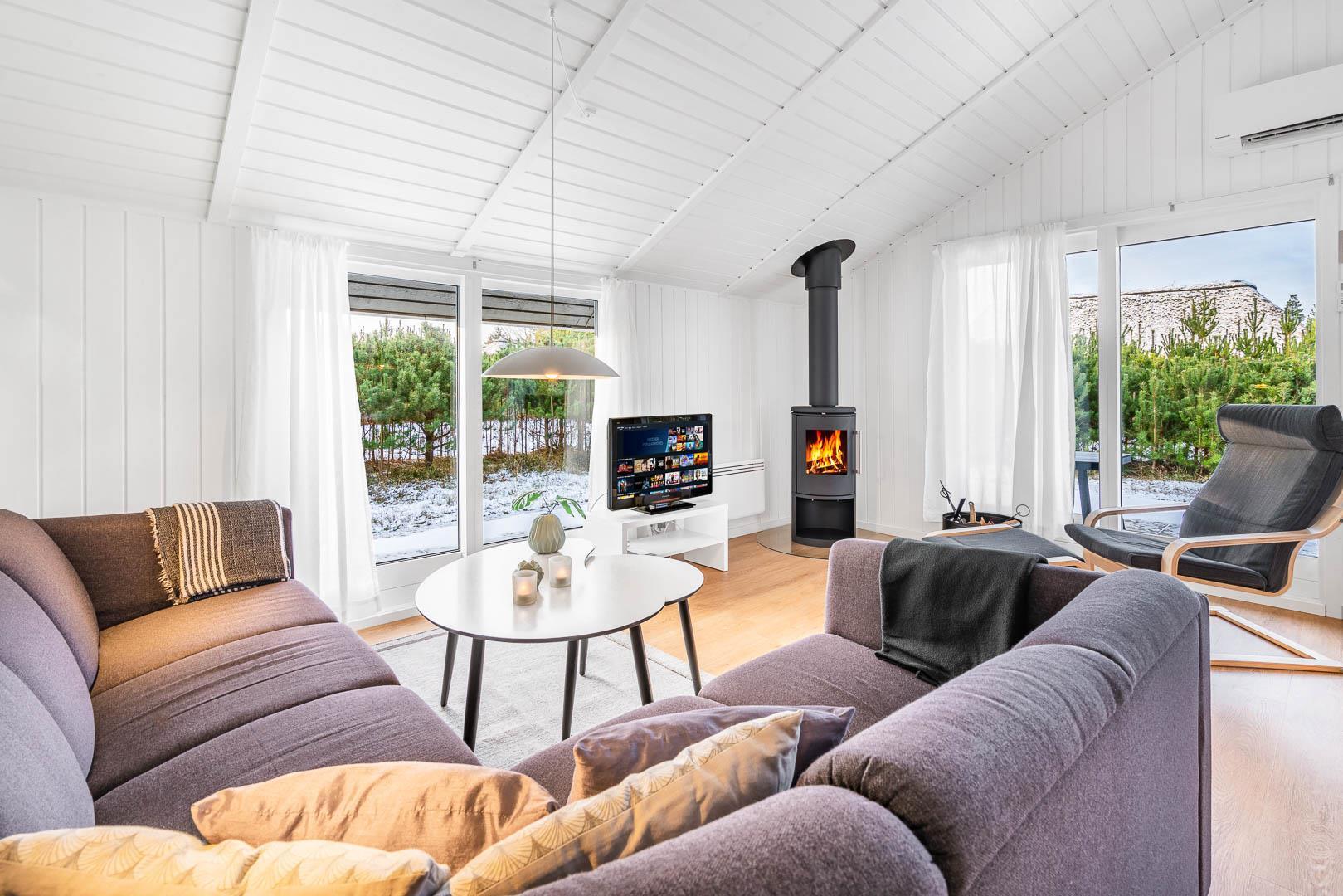 I stuen er der brændeovn, som giver varme og stemning på kølige aftener. Derudover er der kabel-tv og radio med CD-afspiller. Store vinduespartier giver et flot lysindfald og udsigt til de grønne omgivelser. Et sommerhus med både komfort og charme – perfekt til dem, der ønsker fred, natur og hyggelige rammer.