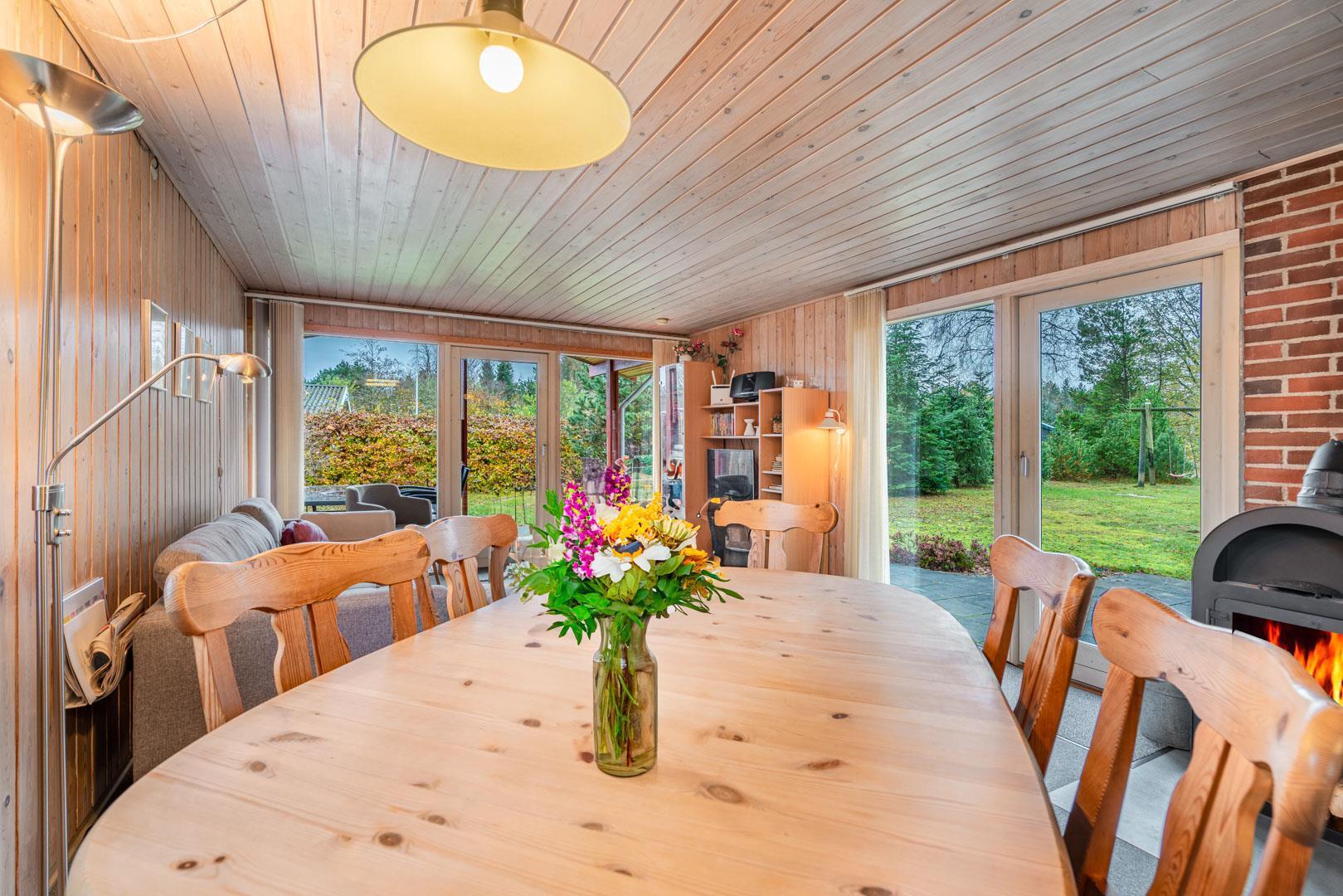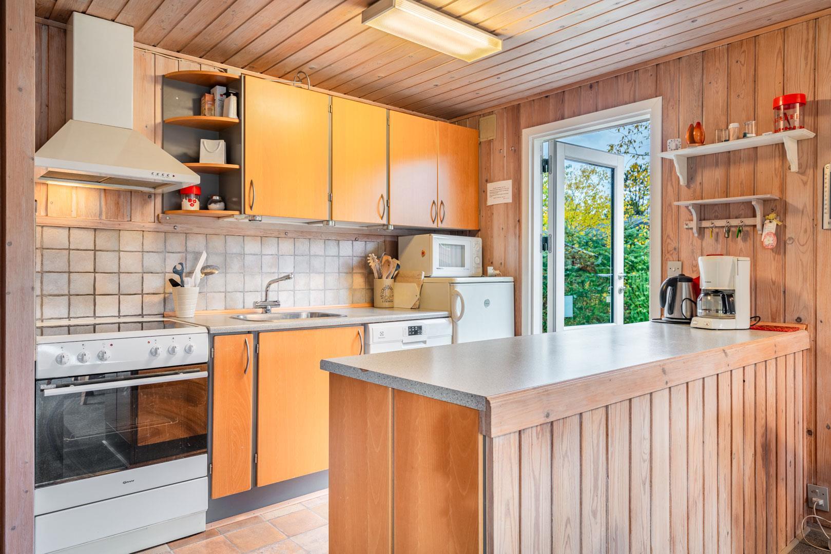 Sommerhuset har et praktisk og åbent køkken/alrum, hvor familien kan samles til madlavning, kortspil og hyggelige stunder. Herfra er der direkte udgang til en dejlig syd/vestvendt terrasse, hvor solen kan nydes dagen lang – perfekt til både afslapning og måltider i det fri.