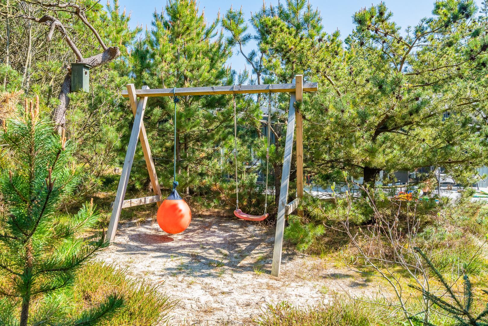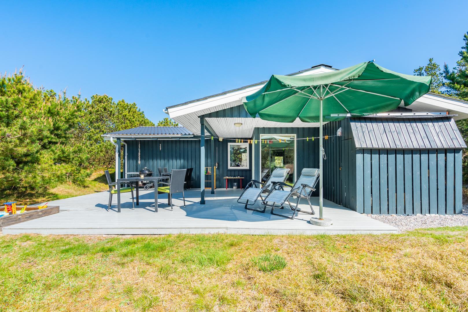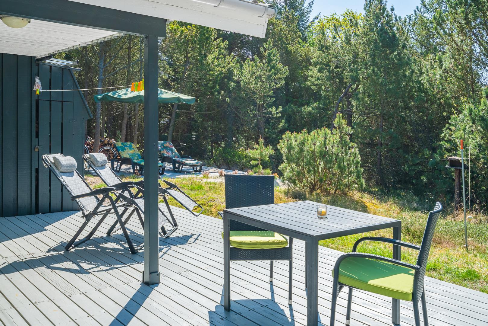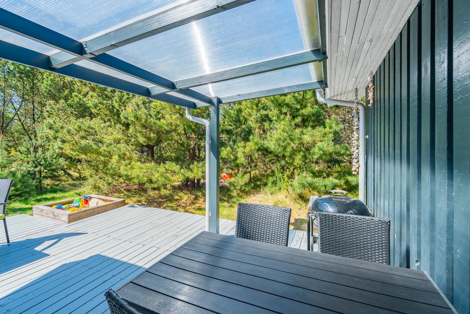 Udenfor finder I en overdækket terrasse, der indbyder til hyggelige stunder uanset vejret – med morgenkaffe i solen eller middag i aftensolen. Børnene kan lege frit på gyngen og i sandkassen, mens de voksne slapper af i haven.