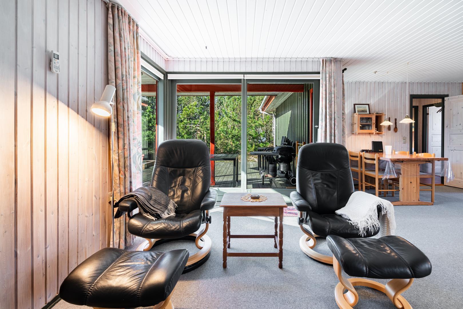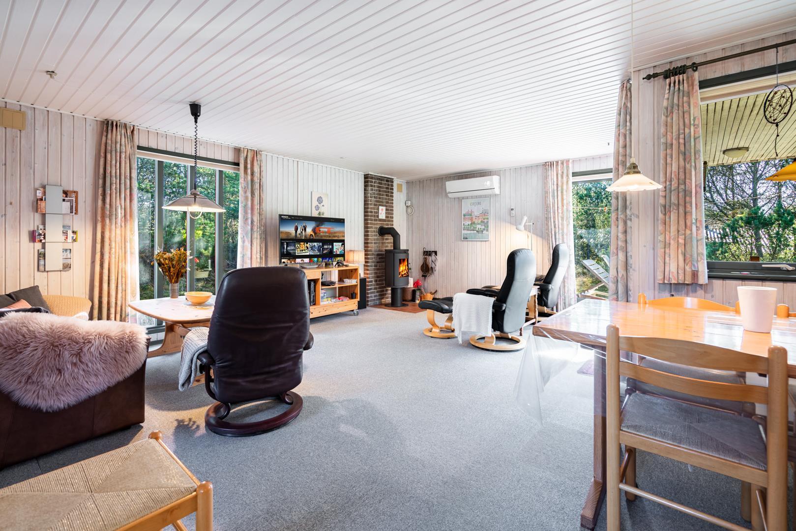 Husets lyse opholdsrum i skandinavisk stil kombinerer hygge med funktionalitet. Her kan I samles omkring den knitrende brændeovn, der sammen med en energivenlig varmepumpe sørger for et behageligt indeklima hele året.
