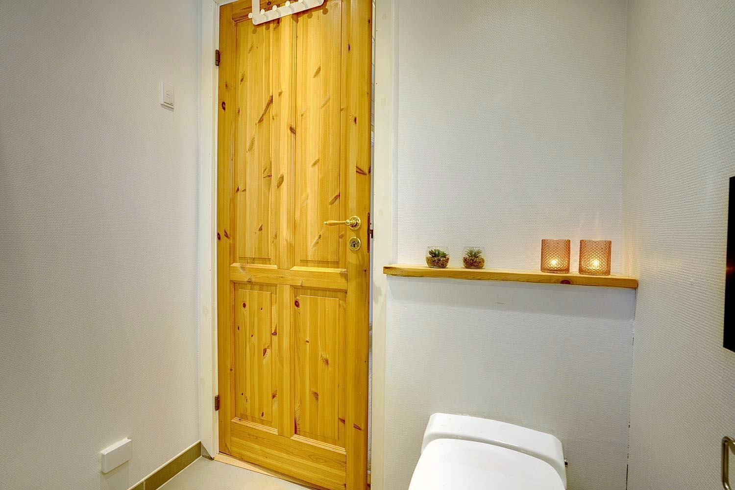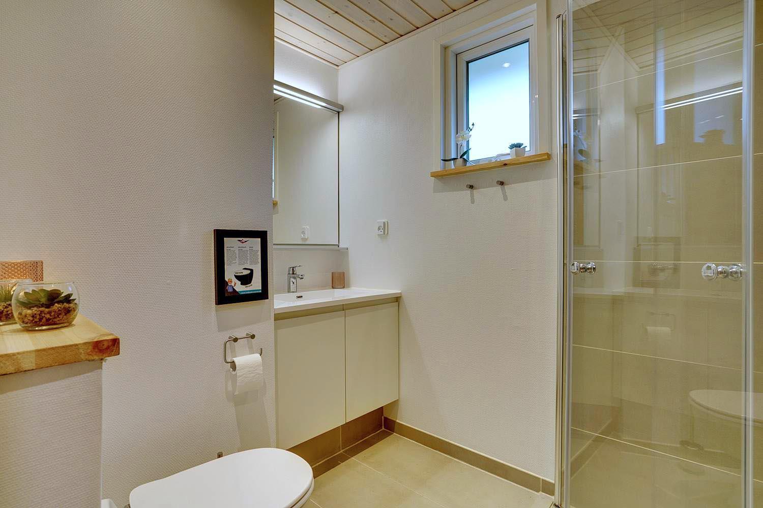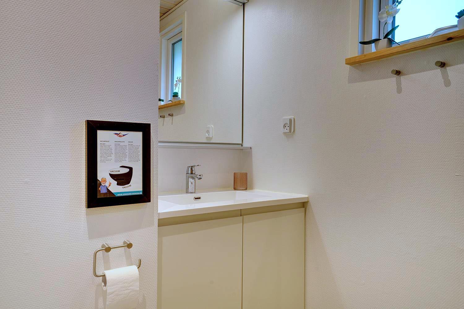 Badeværelset har gulvvarme – lækkert, især hvis I holder ferie uden for sommersæsonen.