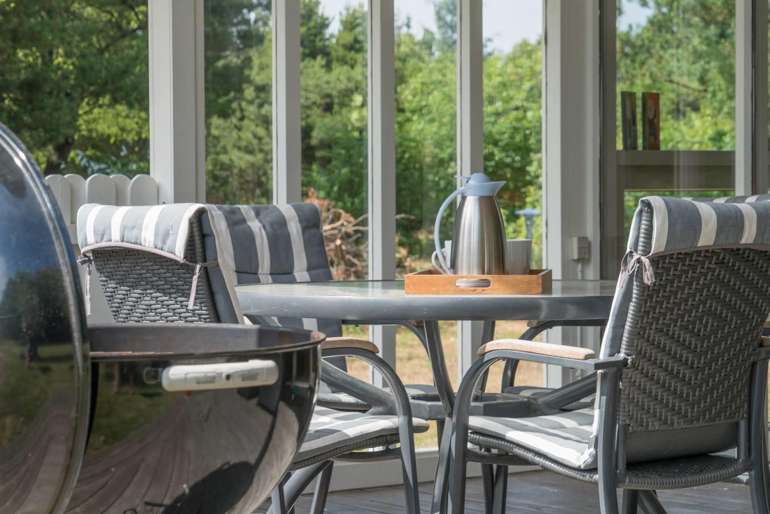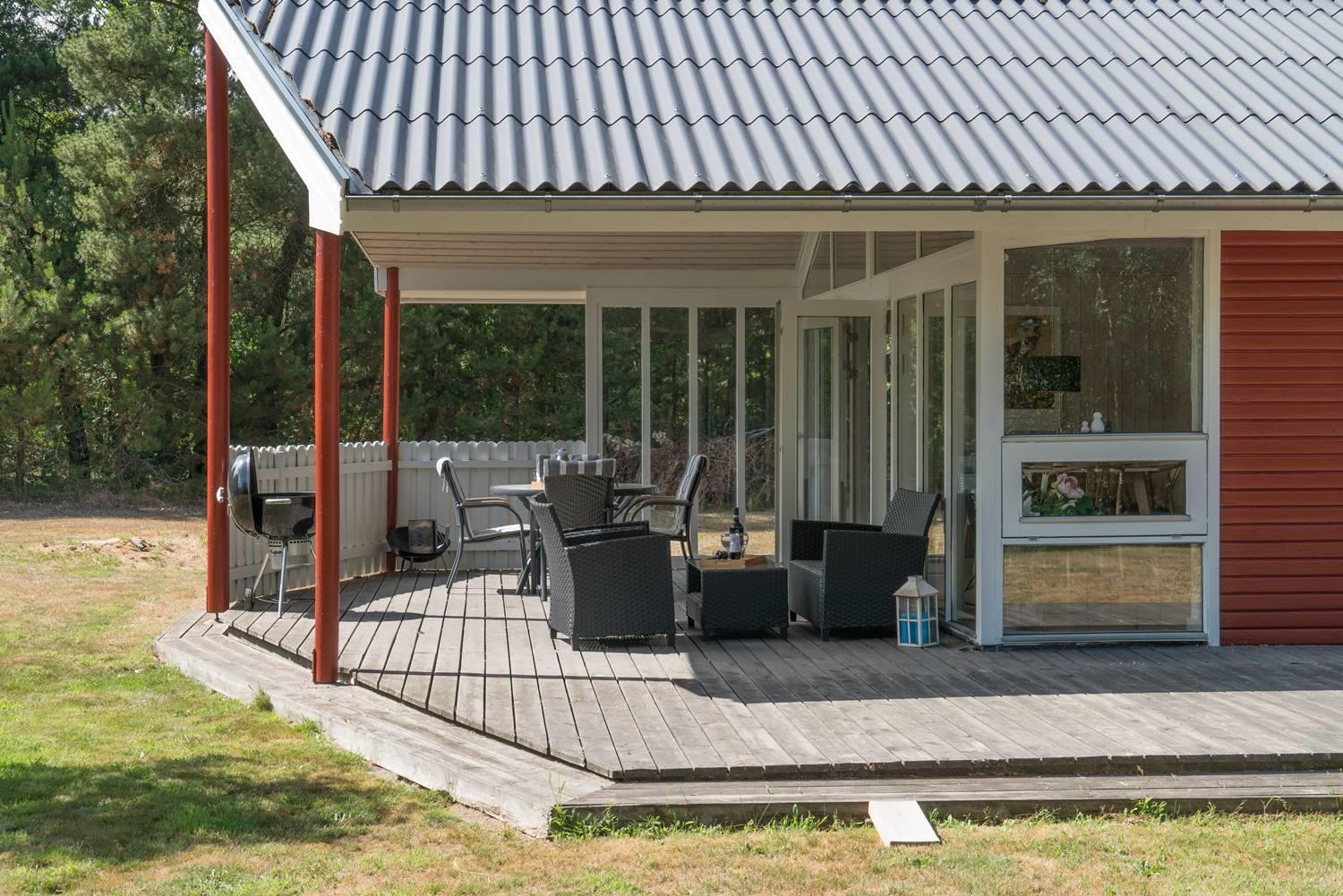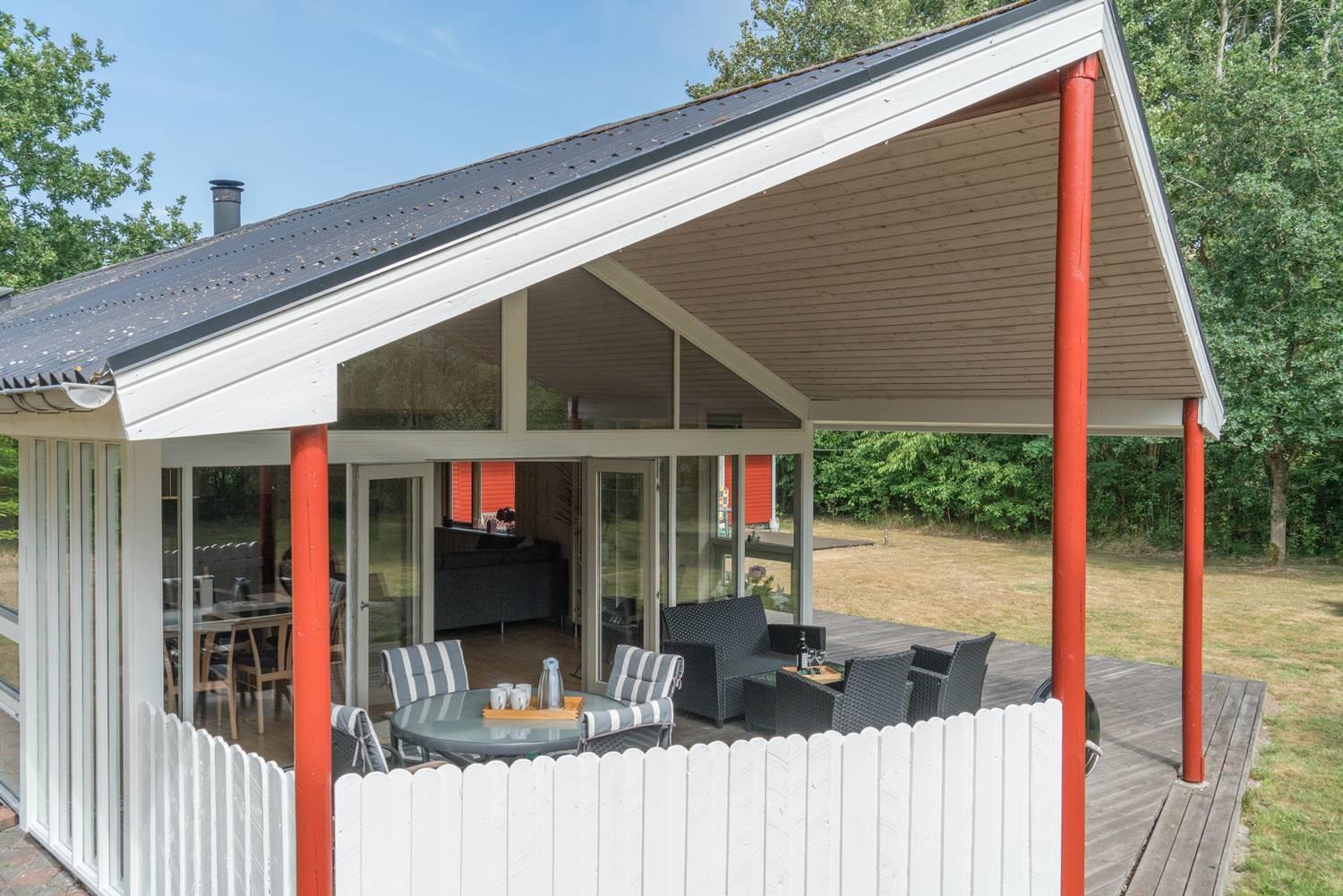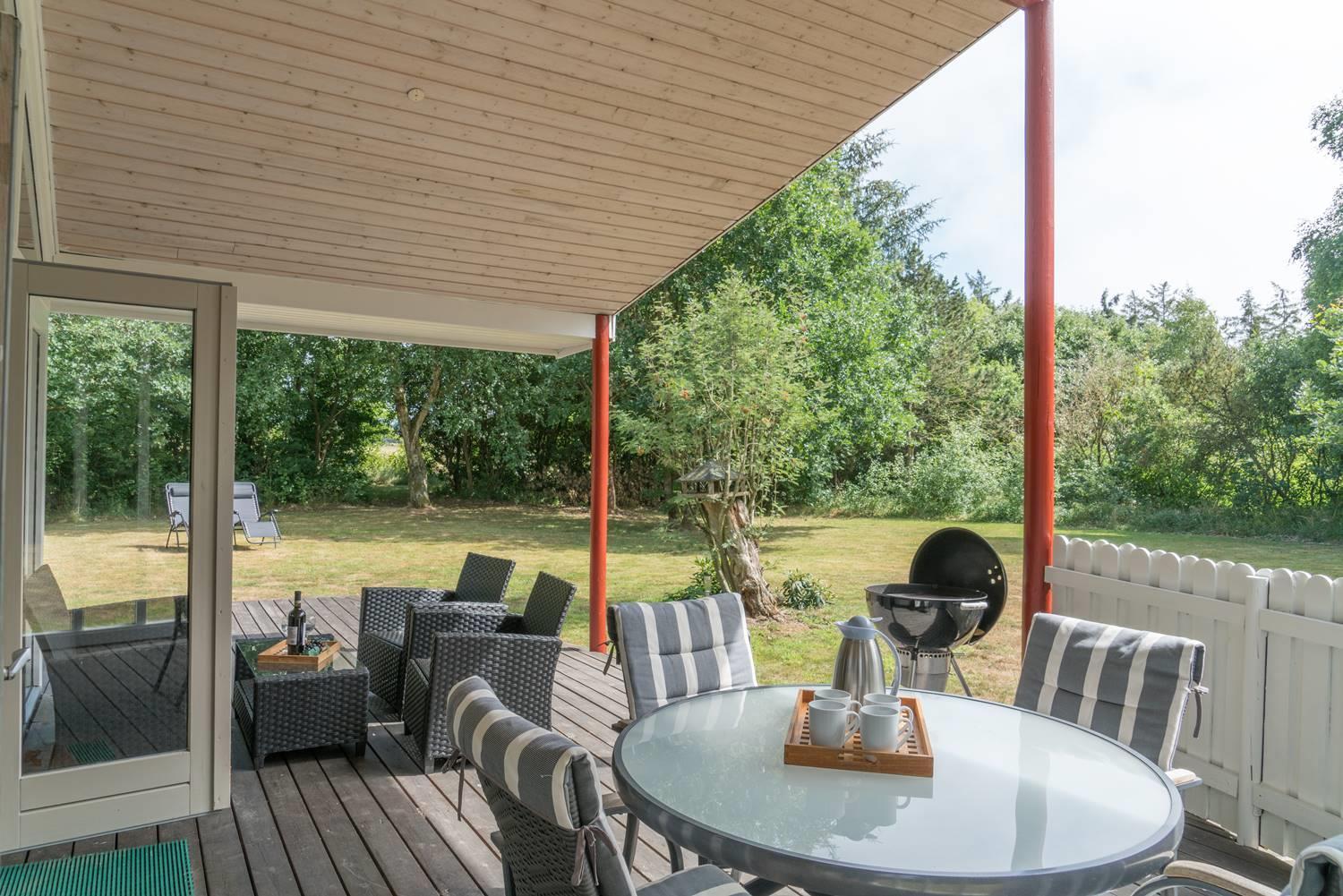 Den overdækkede terrasse inviterer til hyggelige morgenstunder, eftermiddagskaffe i solen og aftener under stjernerne. Et skønt sted at være – uanset årstid.