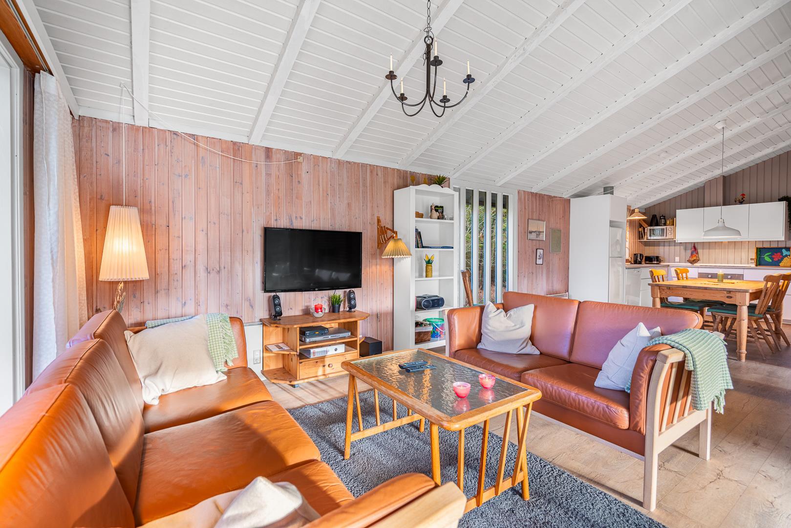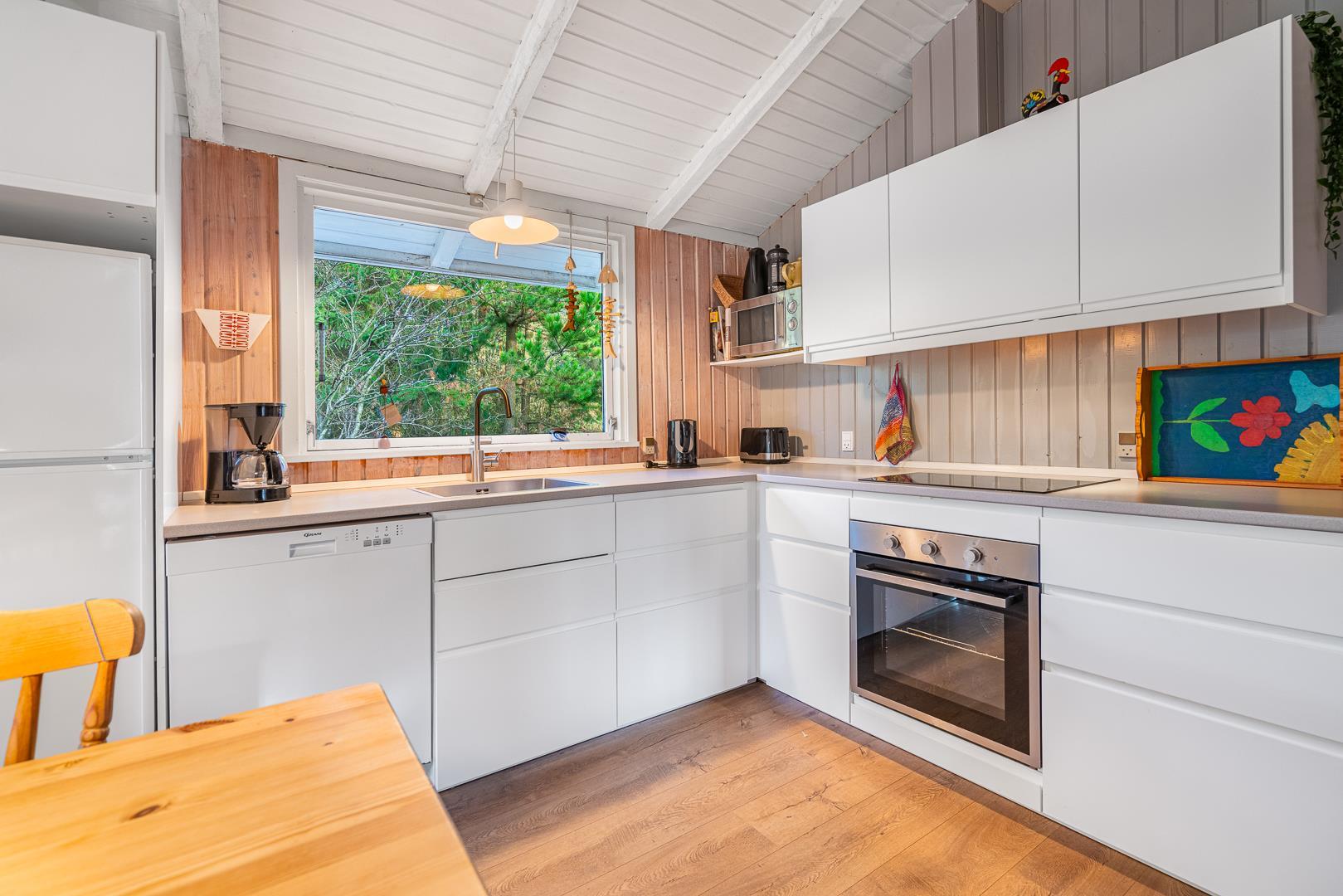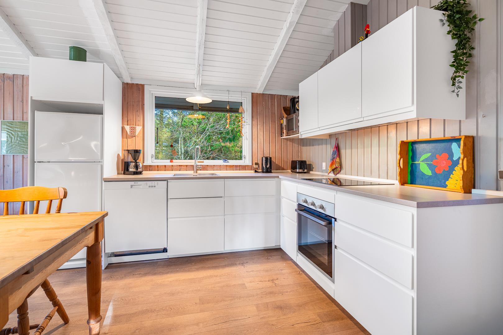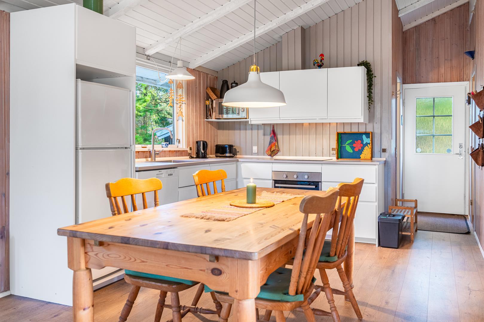 I stuen på Højsvej 37 er der dømt ren hygge med brændeovn og masser af plads til at slappe af efter en tur i klitterne eller ved havet. Den åbne indretning giver en dejlig, afslappet stemning, og i det moderne køkken med opvaskemaskine er det nemt at trylle lidt lækkert frem – og hurtigt rydde op bagefter.