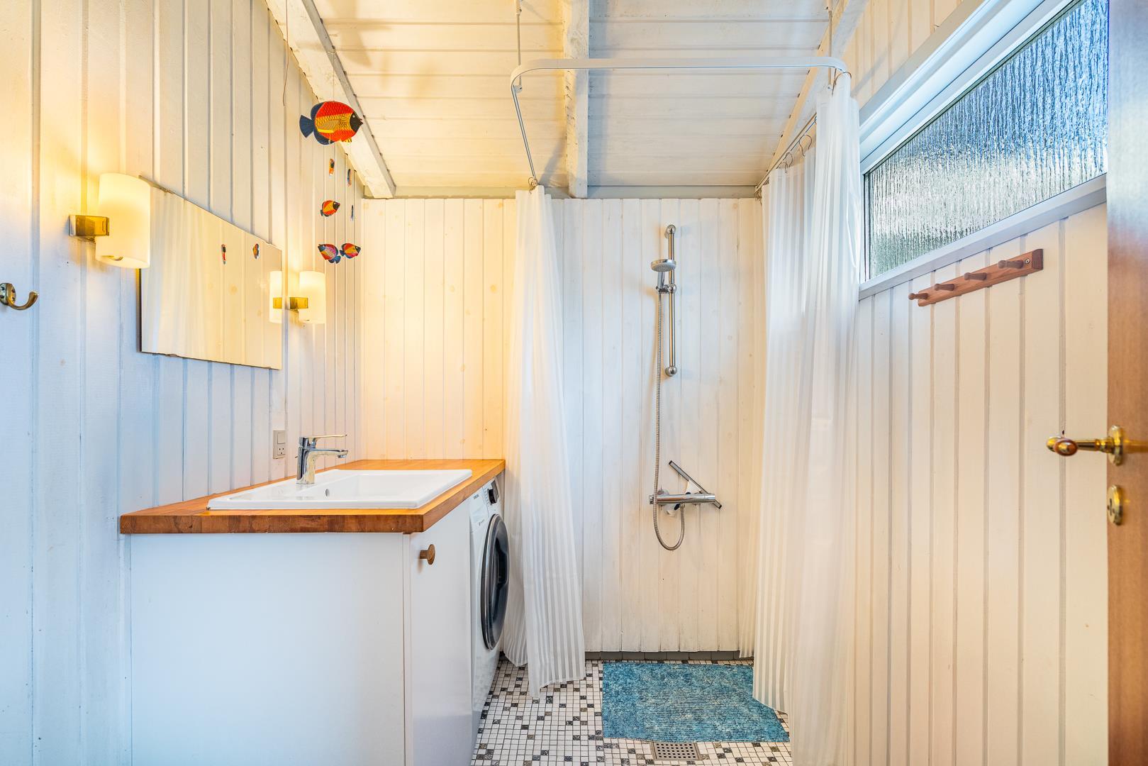 Badeværelset er lyst og funktionelt, og vaskemaskinen gør det nemt at holde styr på tøj og strandhåndklæder, også på en længere ferie.