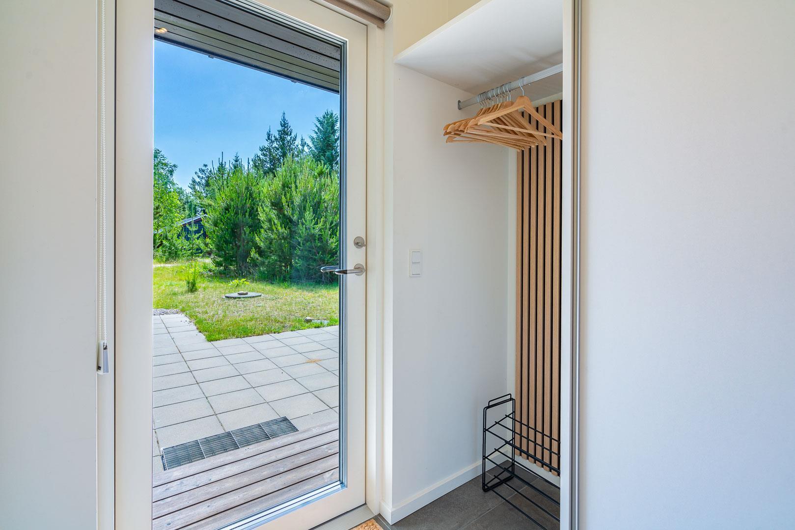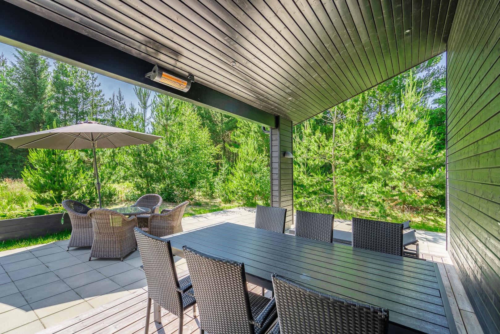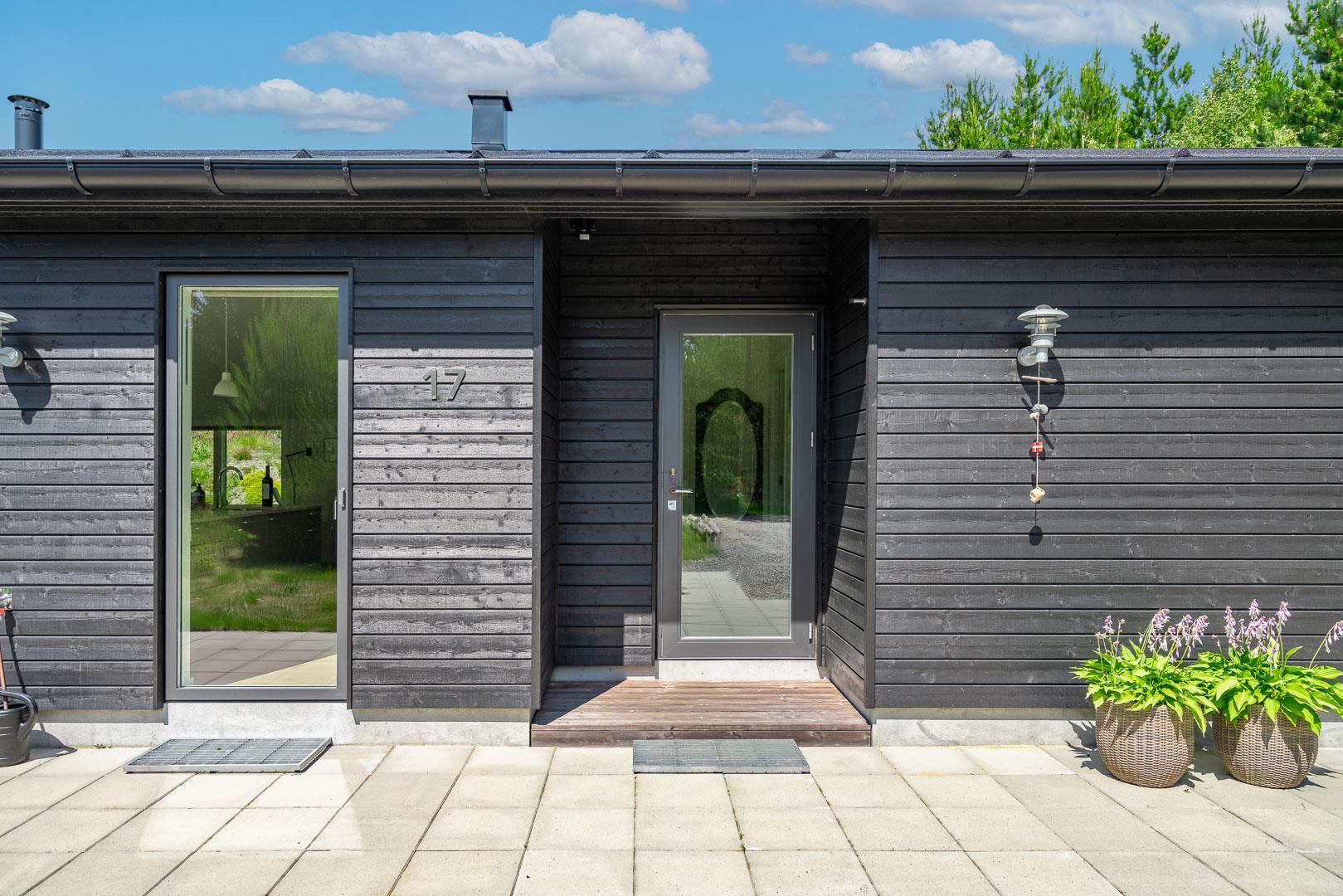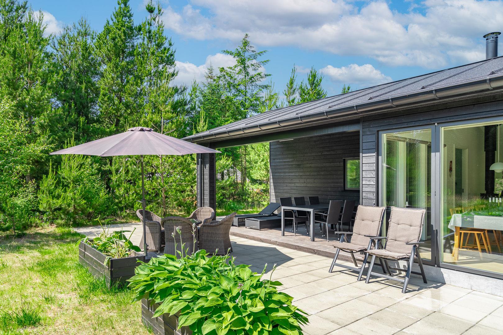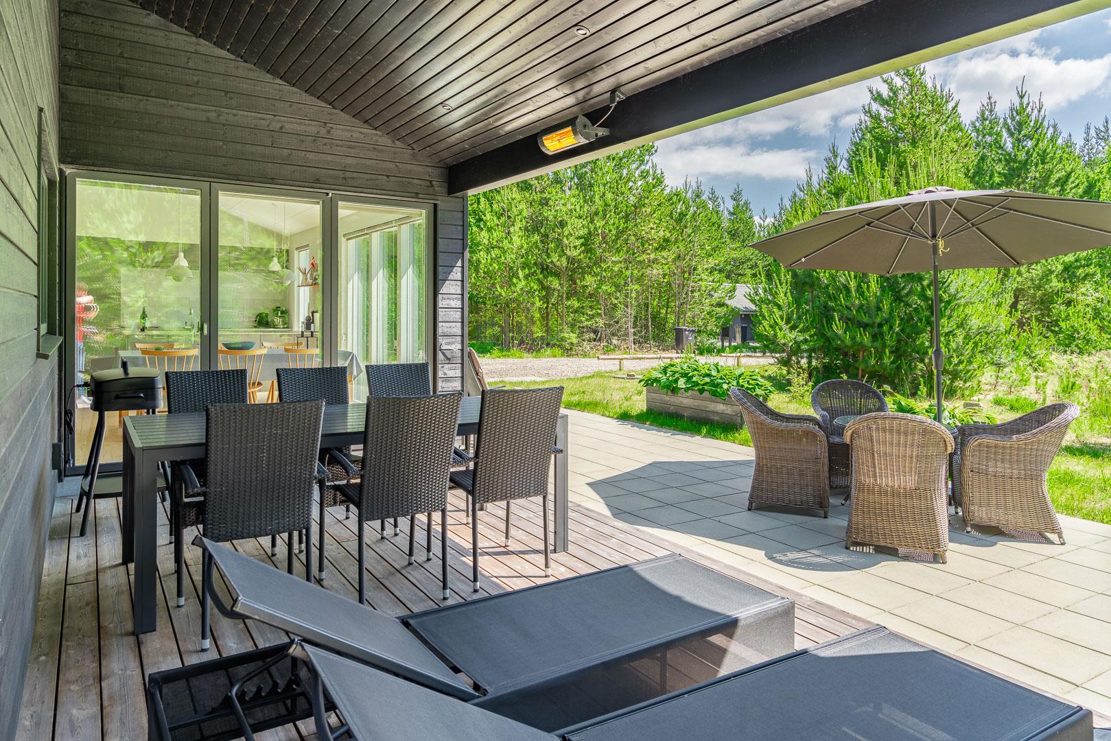 2 smagsfulde badeværelser , det ene med direkte adgang fra det største af soverummene og desuden med håndklædevarmer - gulvvarme overalt i huset. Praktisk entre og overdækket indgang. En dejlig overdækning på terrassen, hvis du skal sidde tørt eller i skygge eller en åben terrasse i solen på en liggestol? Rammerne for ferie hele året rundt er helt sikkert skabt, hvis du vælger at leje Kirkeflod 17 i Houstrup.