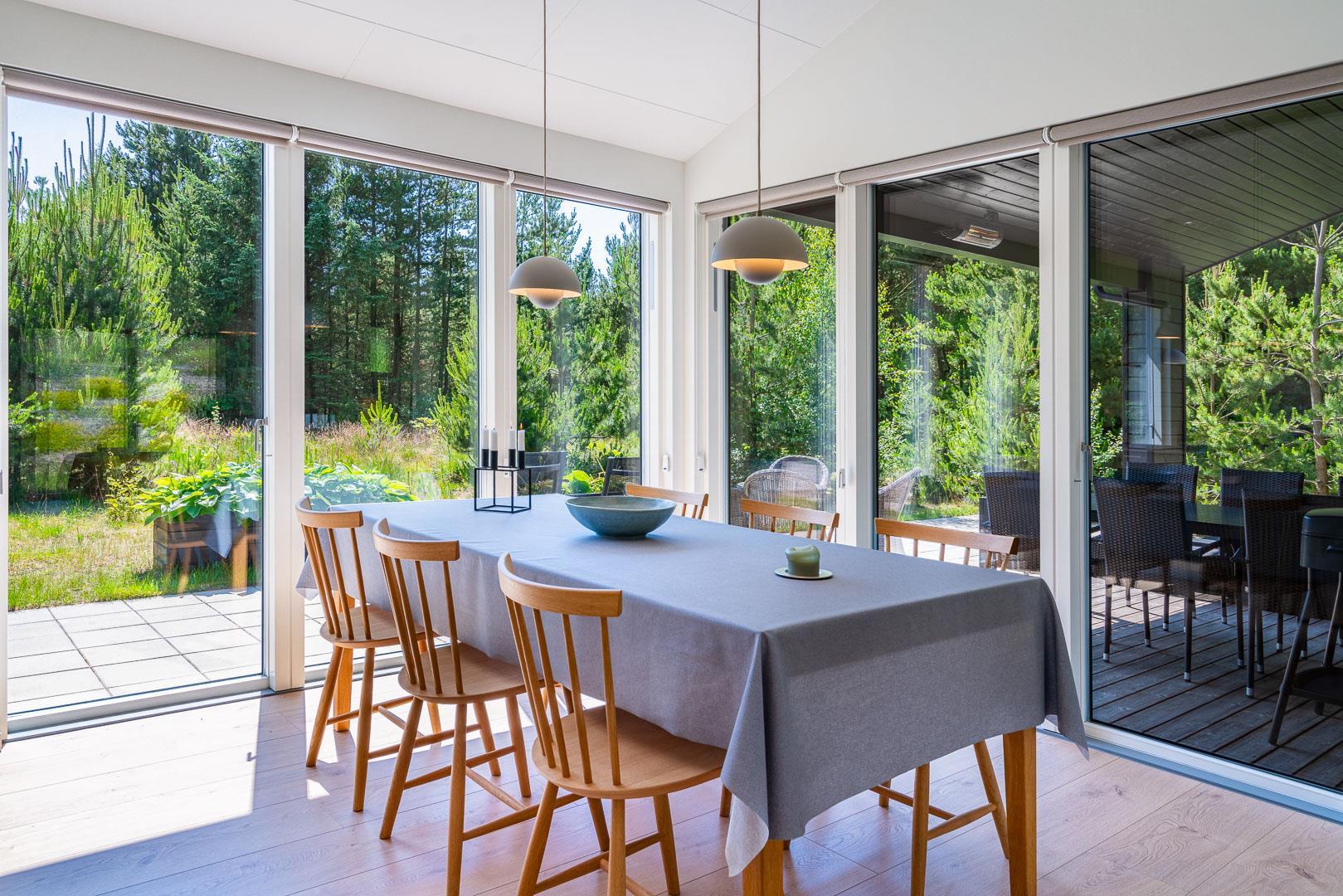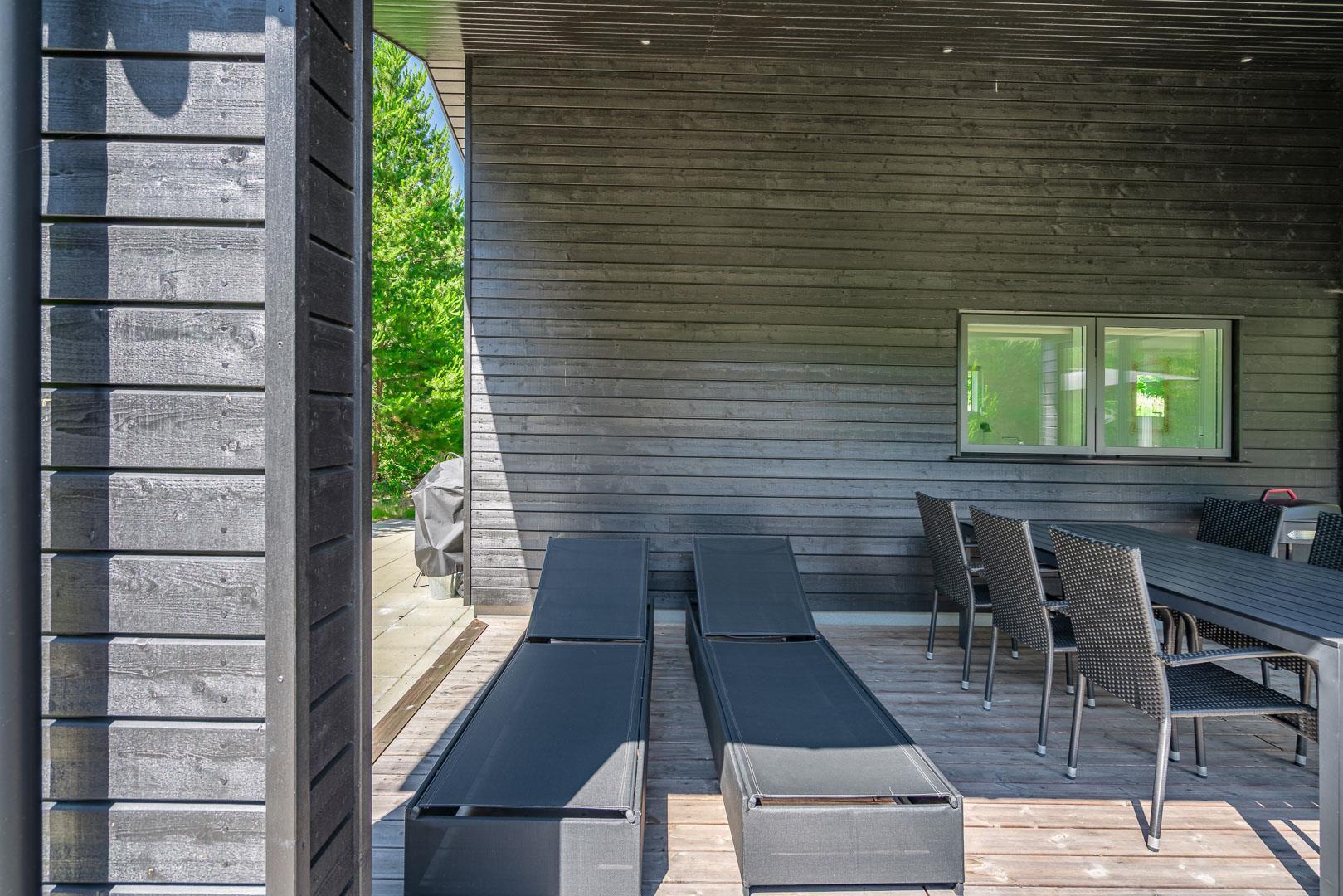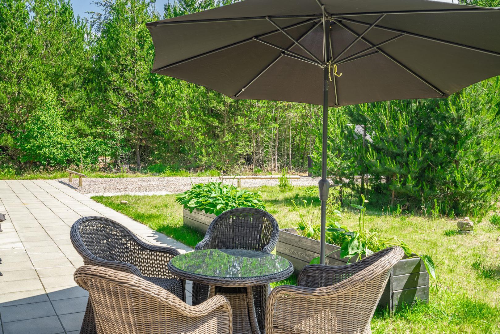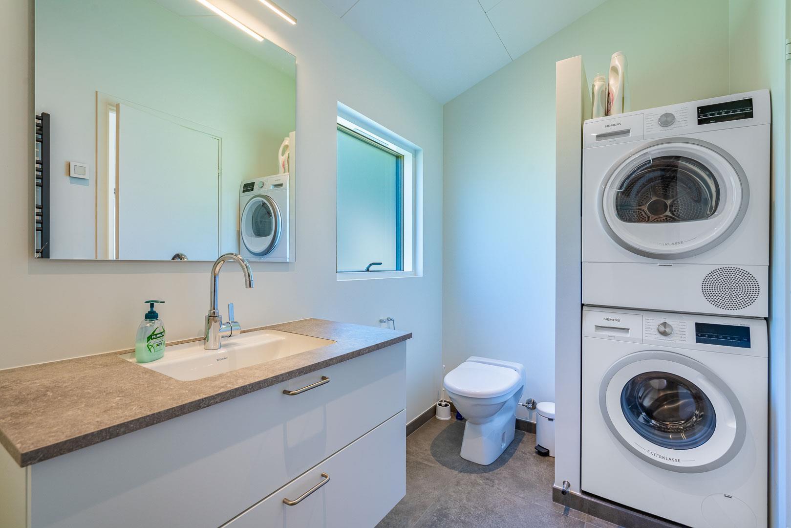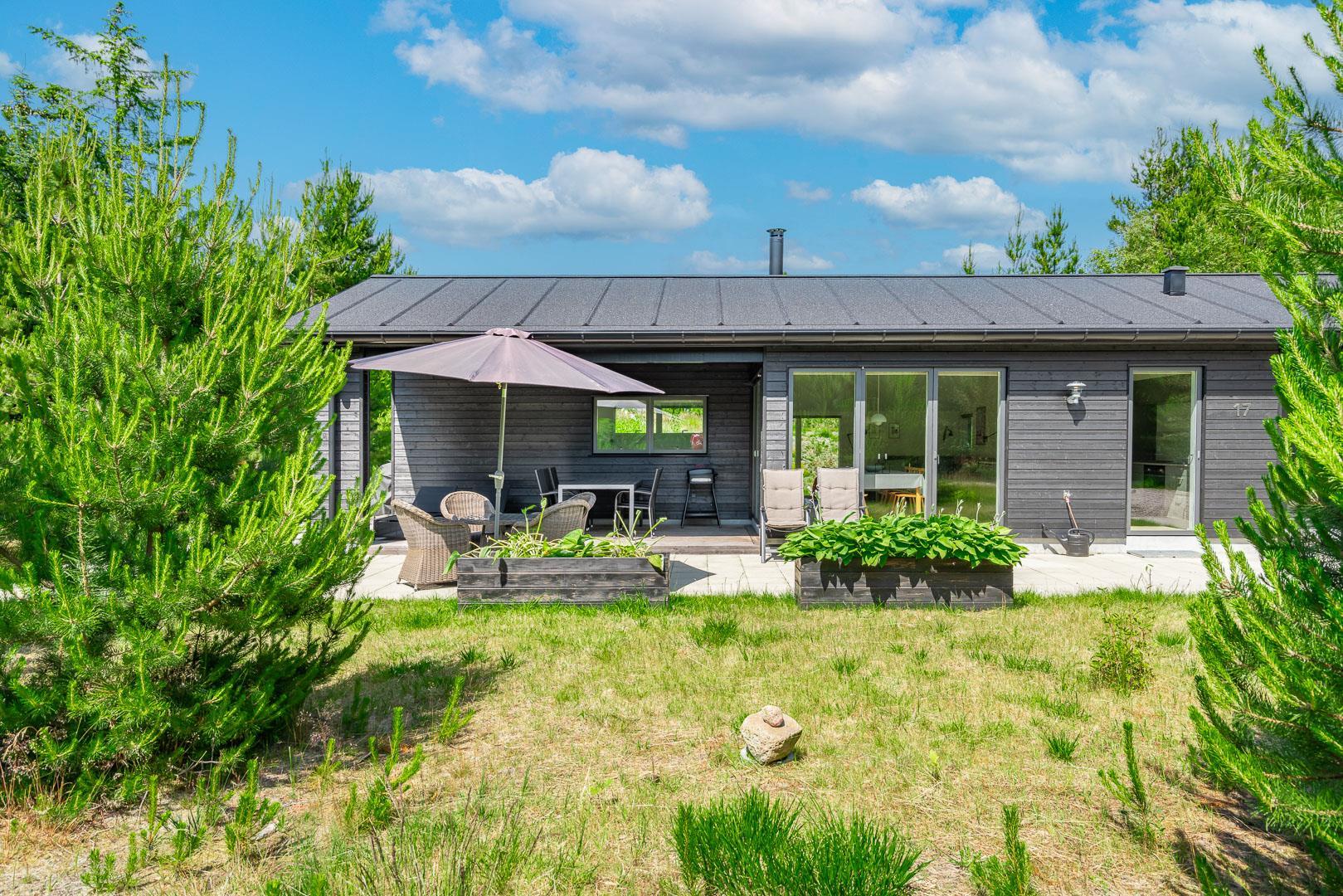 2 smagsfulde badeværelser , det ene med direkte adgang fra det største af soverummene og desuden med håndklædevarmer - gulvvarme overalt i huset. Praktisk entre og overdækket indgang. En dejlig overdækning på terrassen, hvis du skal sidde tørt eller i skygge eller en åben terrasse i solen på en liggestol? Rammerne for ferie hele året rundt er helt sikkert skabt, hvis du vælger at leje Kirkeflod 17 i Houstrup.