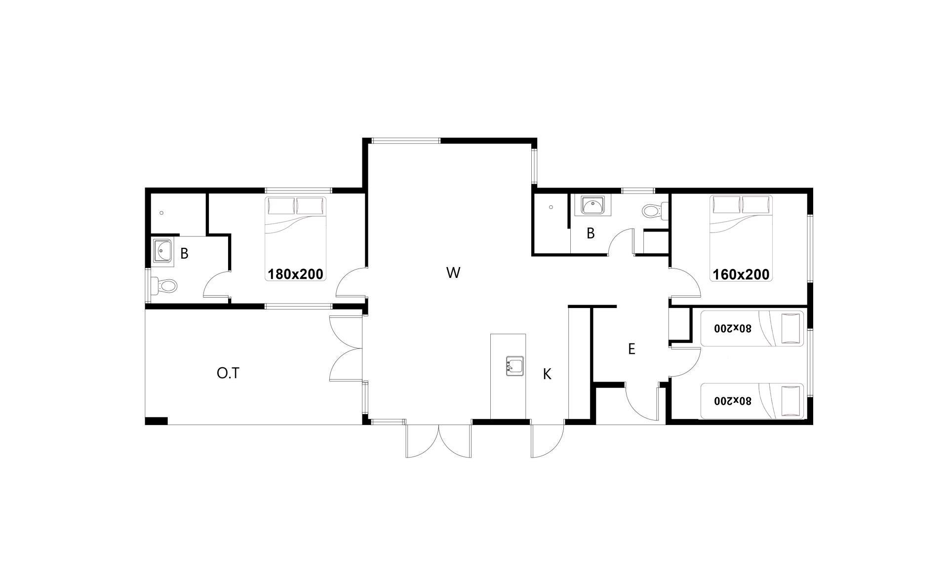 Sengestørrelse: 1 dobbeltseng 180 x 200 cm. 1 dobbeltseng 160 x 200 cm. + 2 enkeltsenge 80 x 200 cm