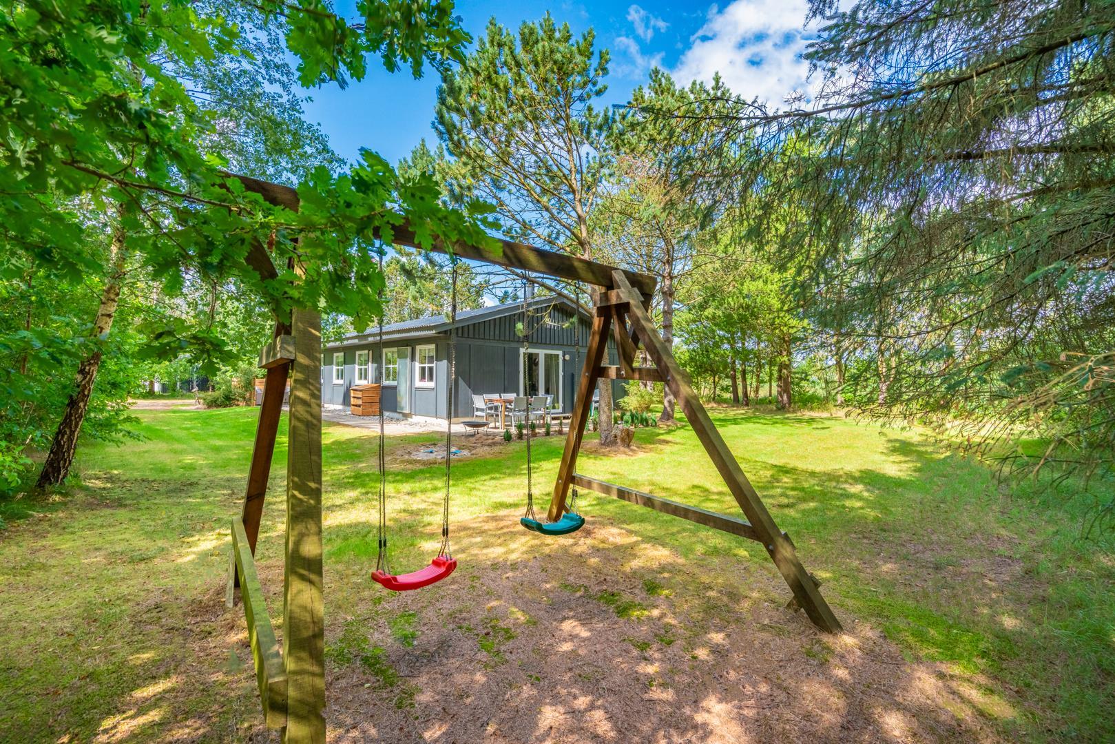 Familier med børn får ekstra glæde af grunden – her er gynge til leg, mens de voksne kan slappe af i havemøblerne.