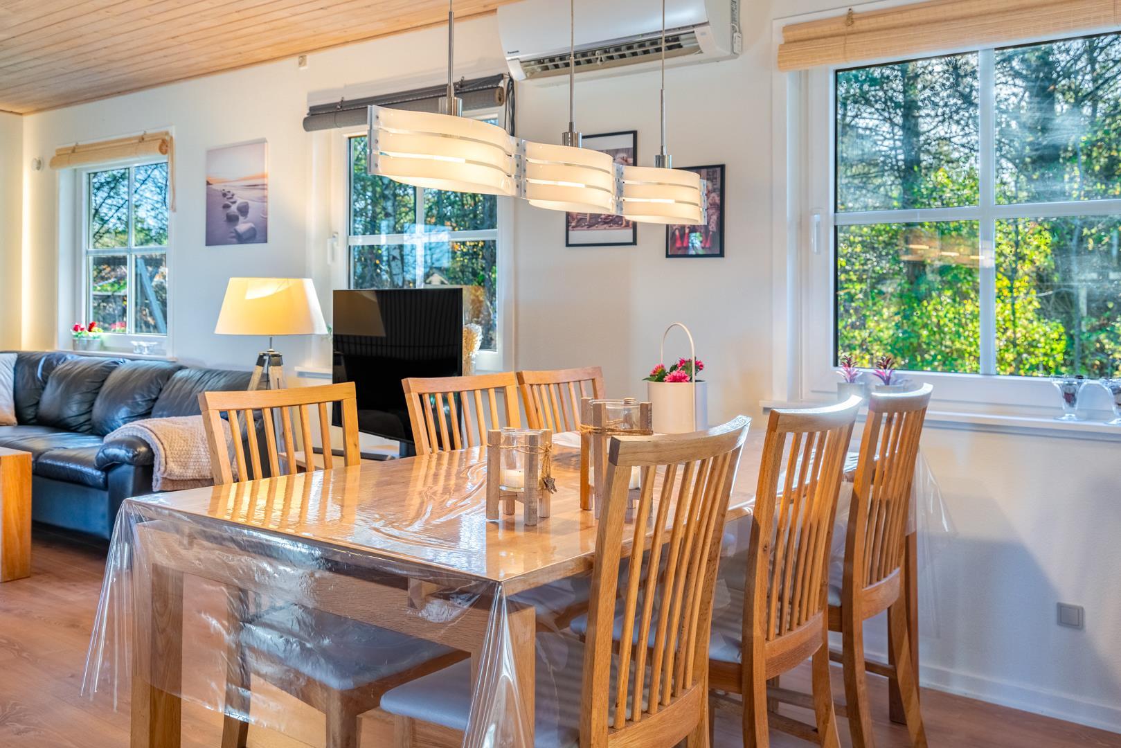 Det åbne køkken-alrum er sommerhusets naturlige samlingspunkt. Her er god plads til fælles måltider, spil, film eller afslapning i sofaen. Brændeovnen sørger for ekstra hygge på kølige dage, hvor vinden rusker i klitterne ved Vesterhavet og en varmepumpe bidrager til et behageligt indeklima året rundt.
