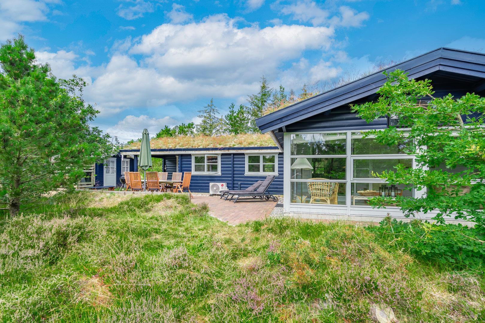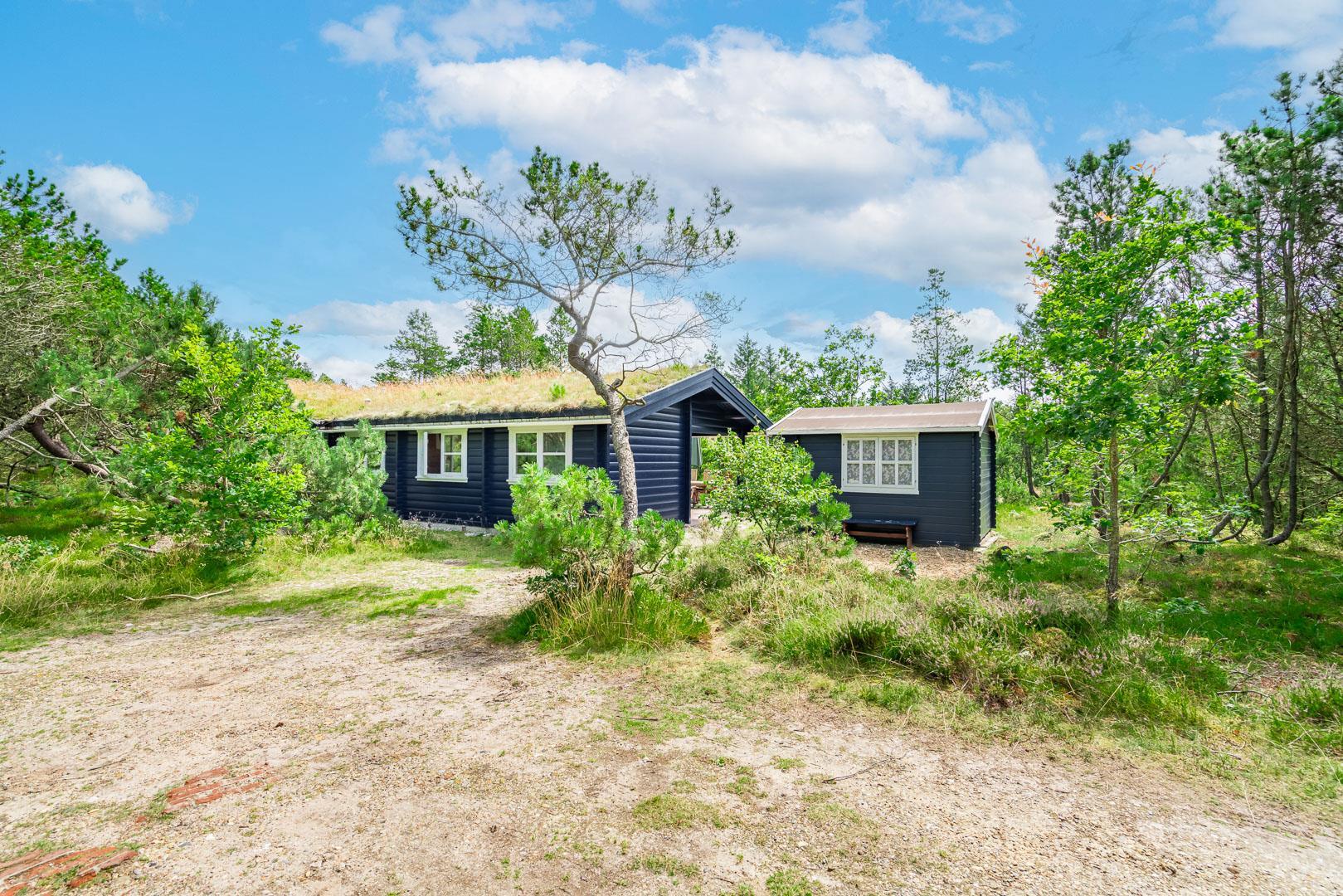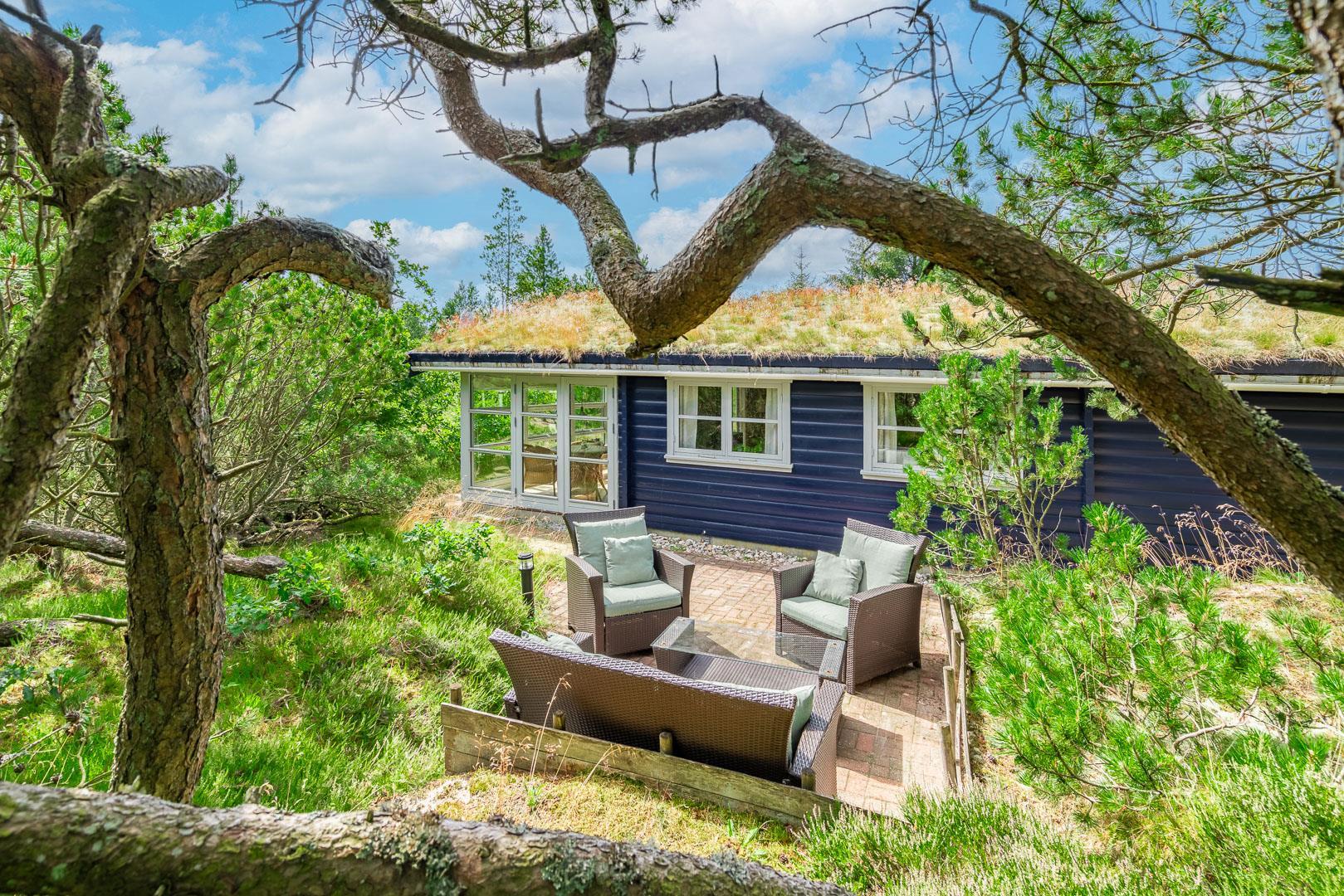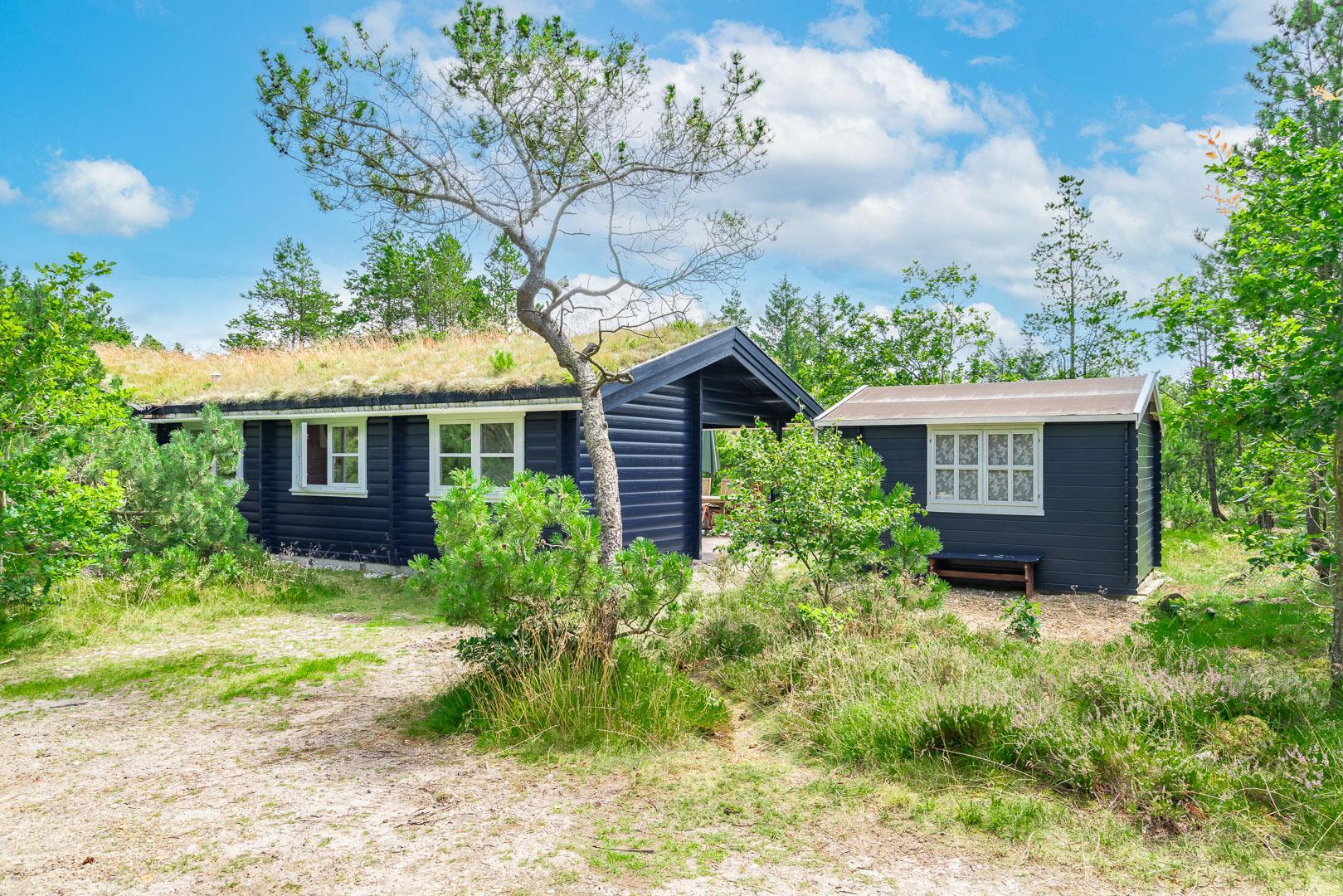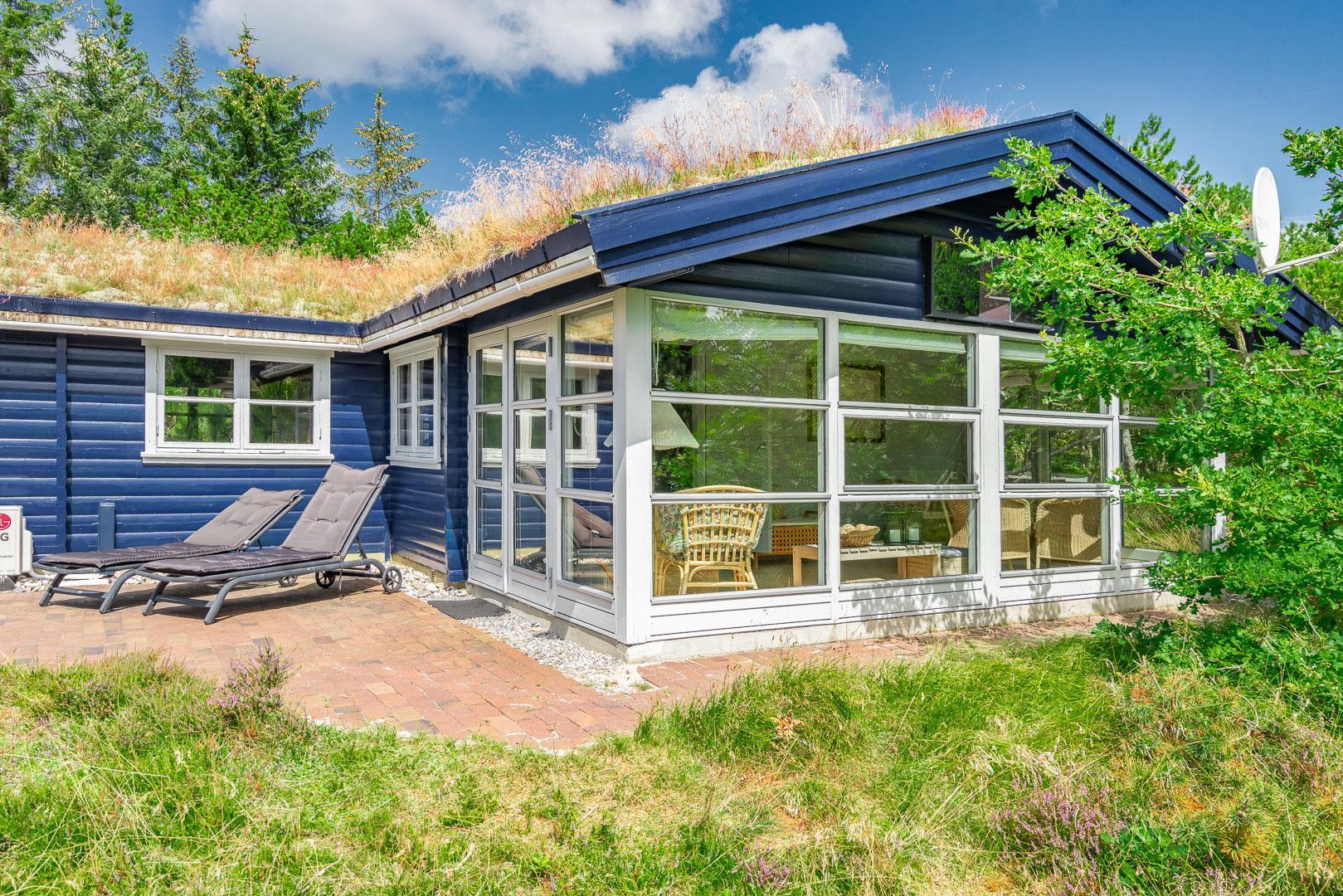 For ende af vej, gemt i naturen, direkte op til plantagen og med sti tæt ved huset, kan I nu nyde jeres ferie på Peder Larsensvej 61. Huset som er et bjælkehus med græs på taget, går i et med den smukke natur. Beplantningen på grunden er varierende og smuk på alle årstider. Med flere terrasser, og hyggekrog med loungesæt, kan I på alle måder opleve huset fra sin bedste side. En udestue med masser af lys og vinduespartier, vil opsluge jer og I vil sandsynligvis bruge meget tid her. En hyggelig stue med højt til loftet, synlige bjælker, komfortable møbler. Dejligt landkøkken med opvaskemaskine, fryser og mikroovn samt en spisekrog. På badeværelset befinder sig også vaskemaskine. 3 gode værelser.