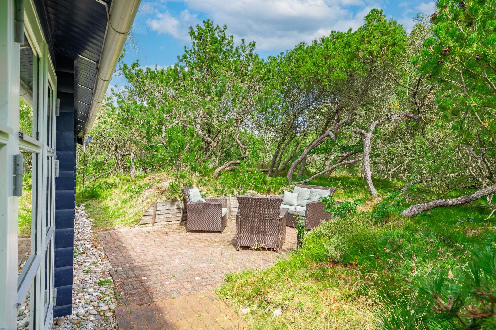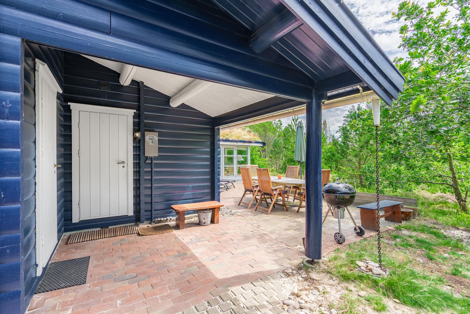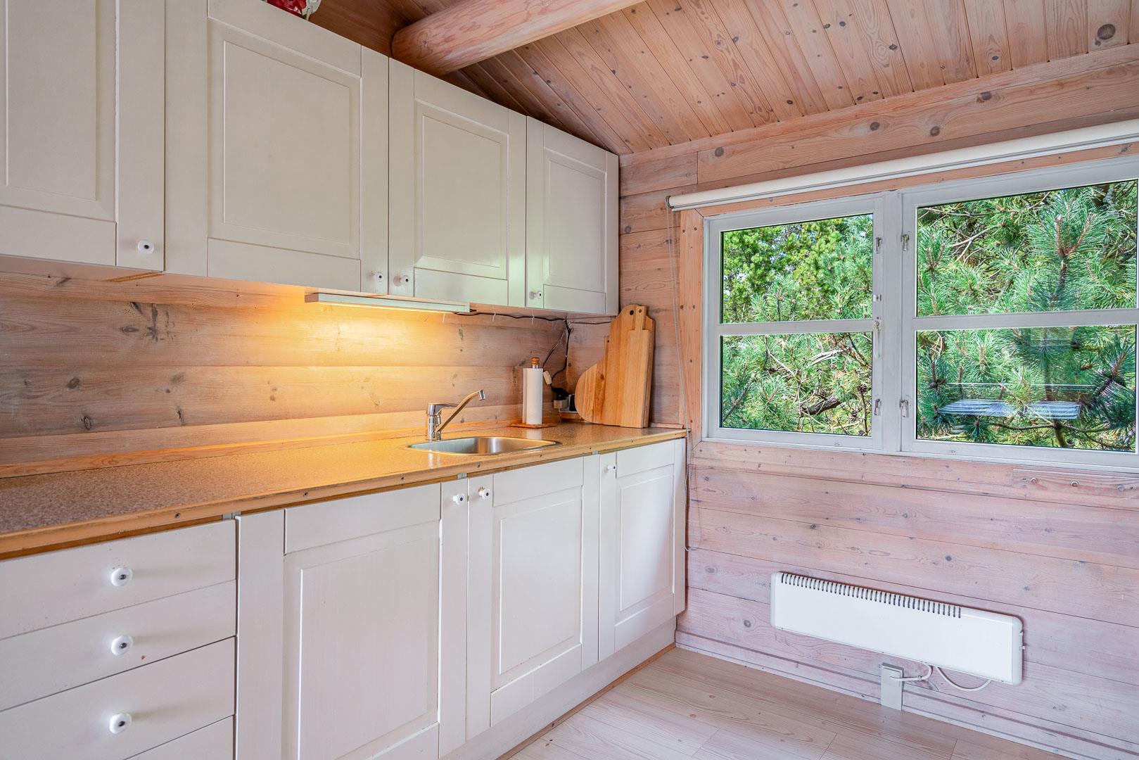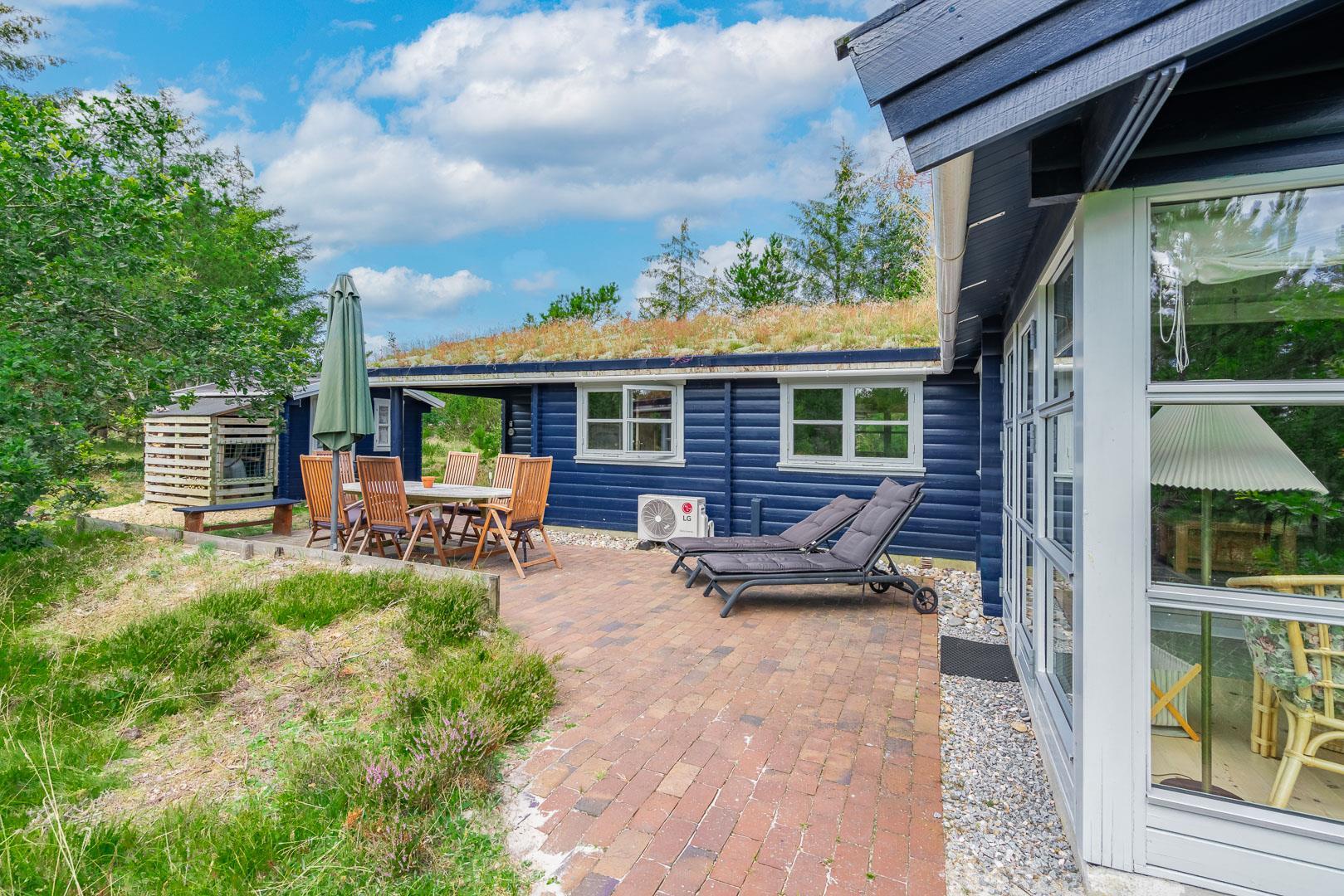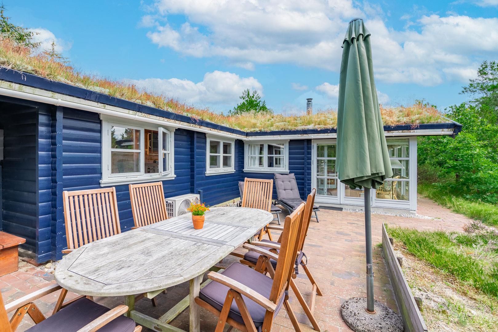 For ende af vej, gemt i naturen, direkte op til plantagen og med sti tæt ved huset, kan I nu nyde jeres ferie på Peder Larsensvej 61. Huset som er et bjælkehus med græs på taget, går i et med den smukke natur. Beplantningen på grunden er varierende og smuk på alle årstider. Med flere terrasser, og hyggekrog med loungesæt, kan I på alle måder opleve huset fra sin bedste side. En udestue med masser af lys og vinduespartier, vil opsluge jer og I vil sandsynligvis bruge meget tid her. En hyggelig stue med højt til loftet, synlige bjælker, komfortable møbler. Dejligt landkøkken med opvaskemaskine, fryser og mikroovn samt en spisekrog. På badeværelset befinder sig også vaskemaskine. 3 gode værelser.