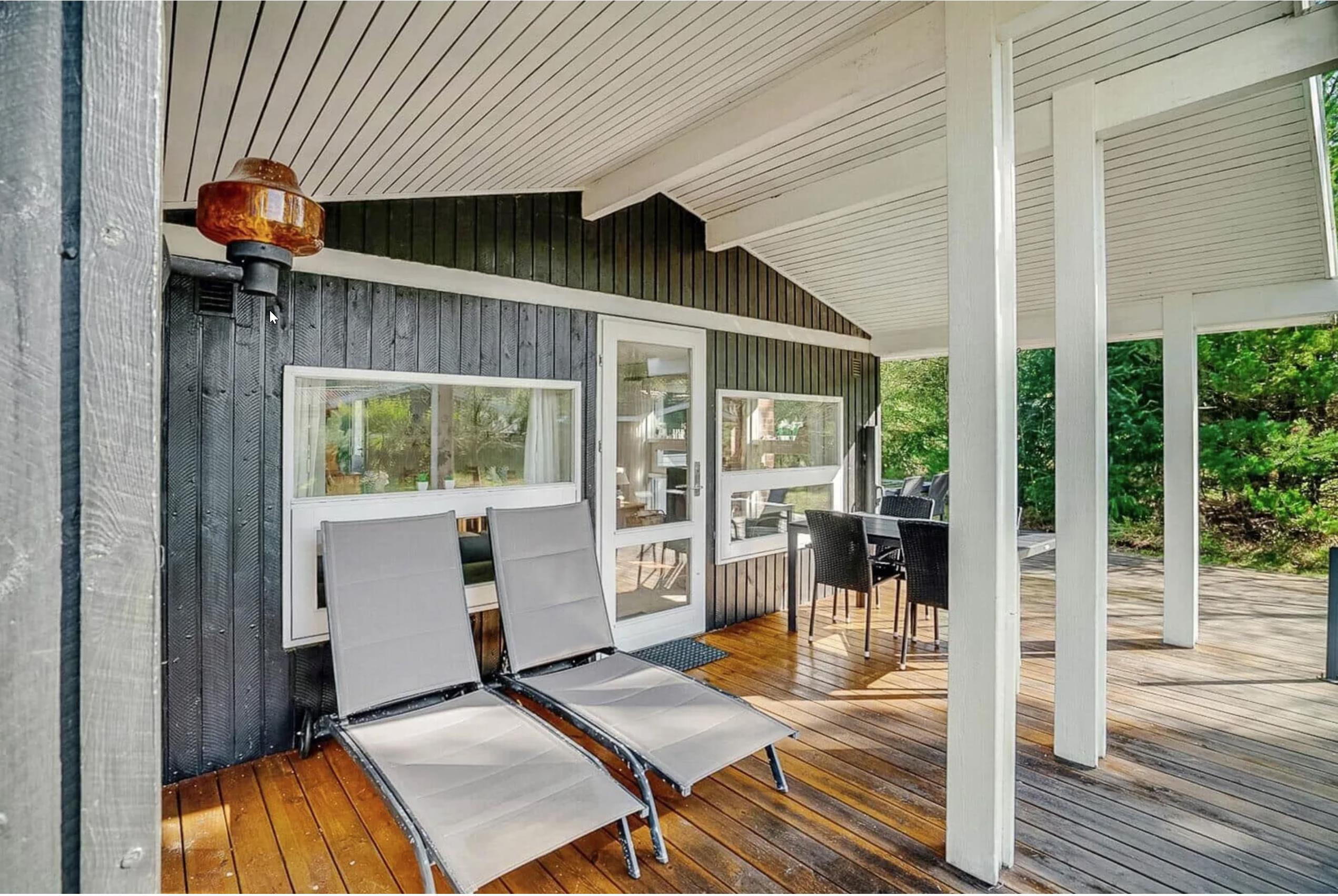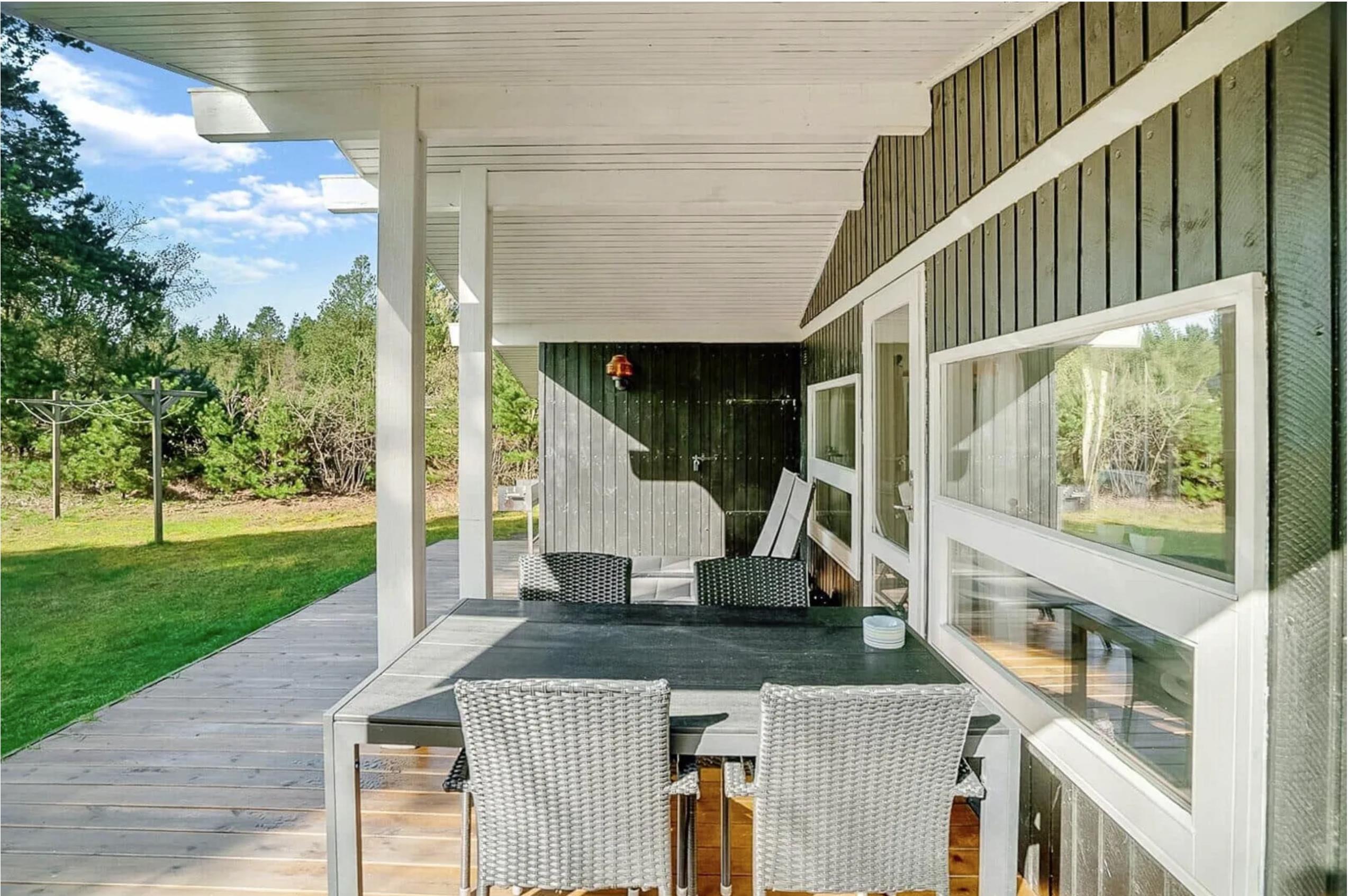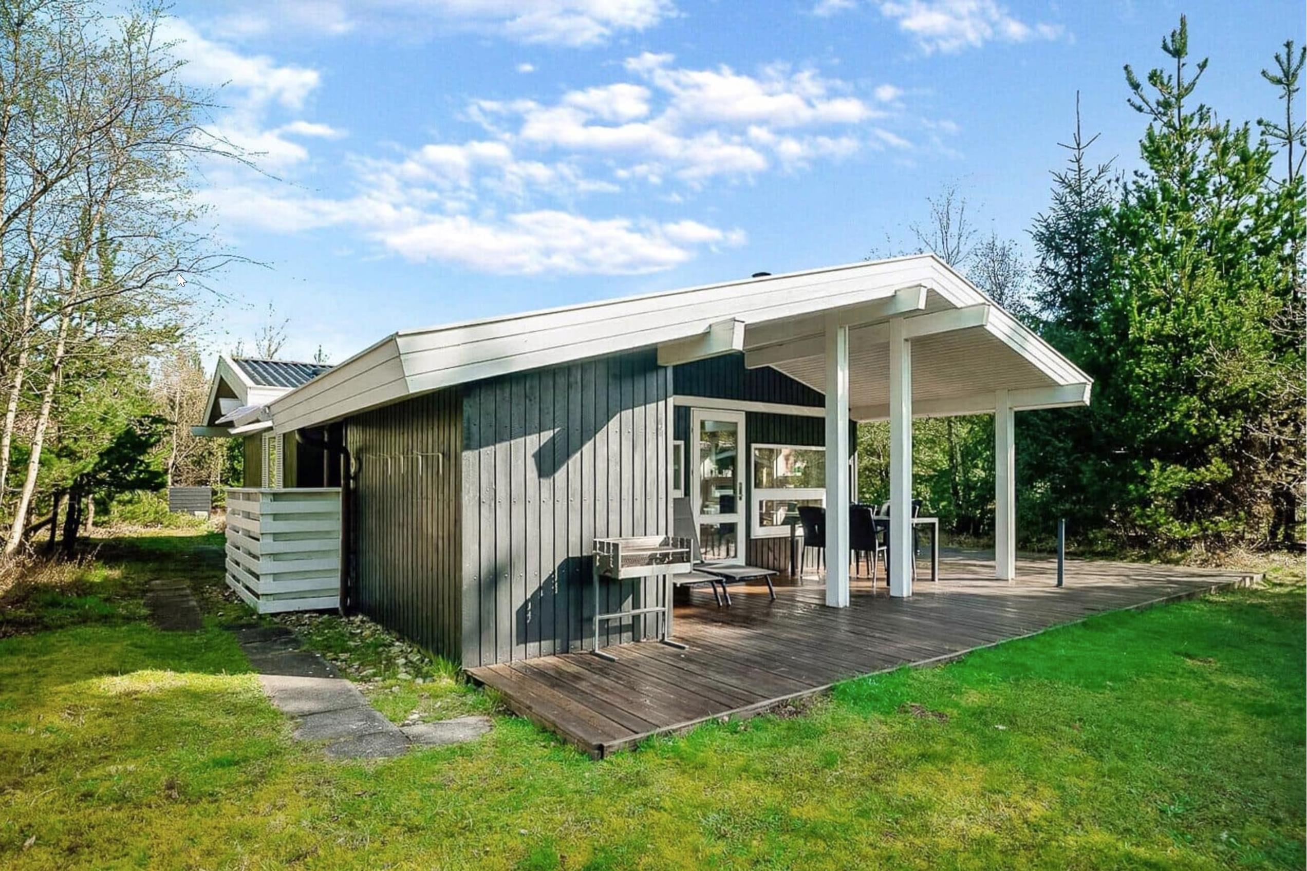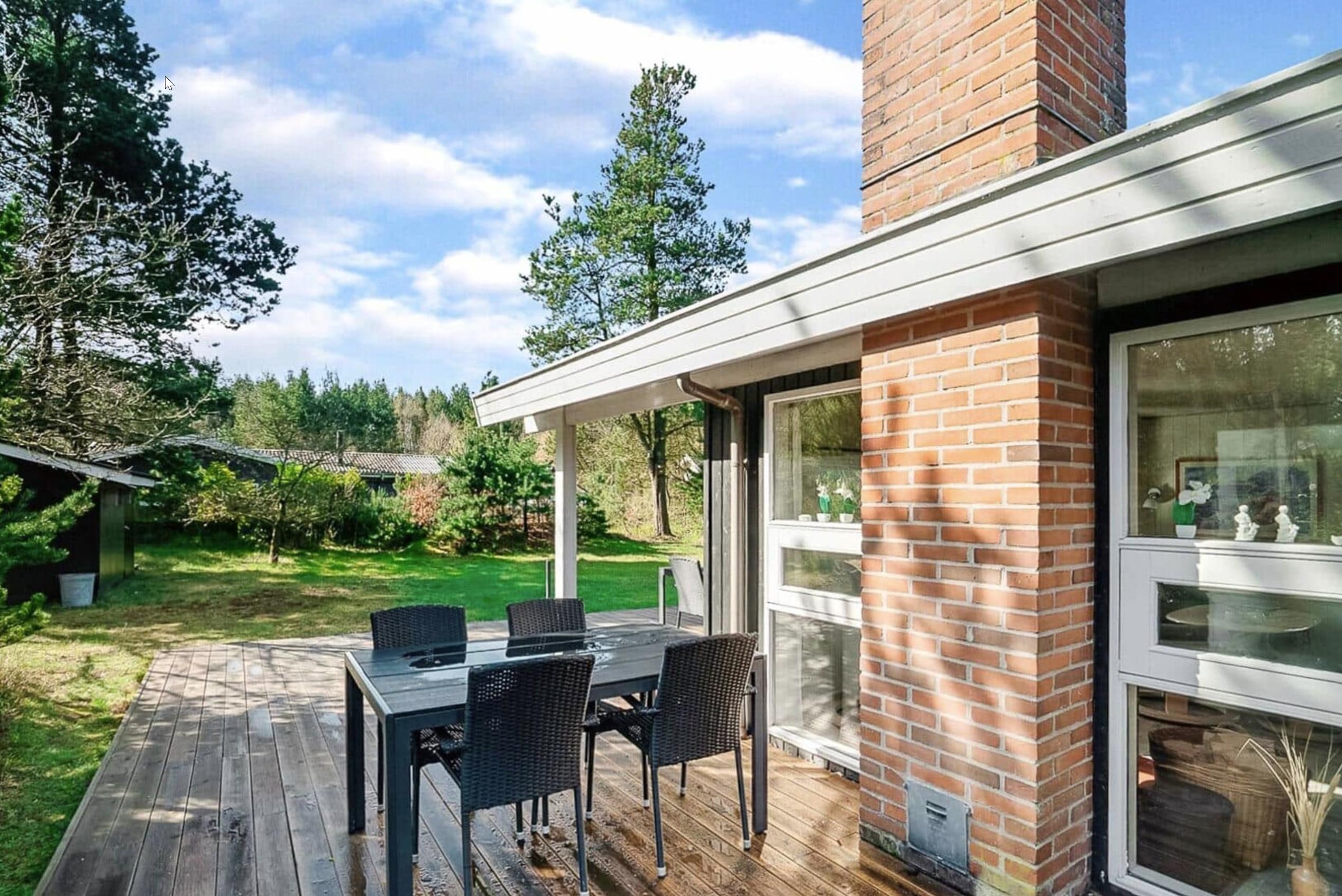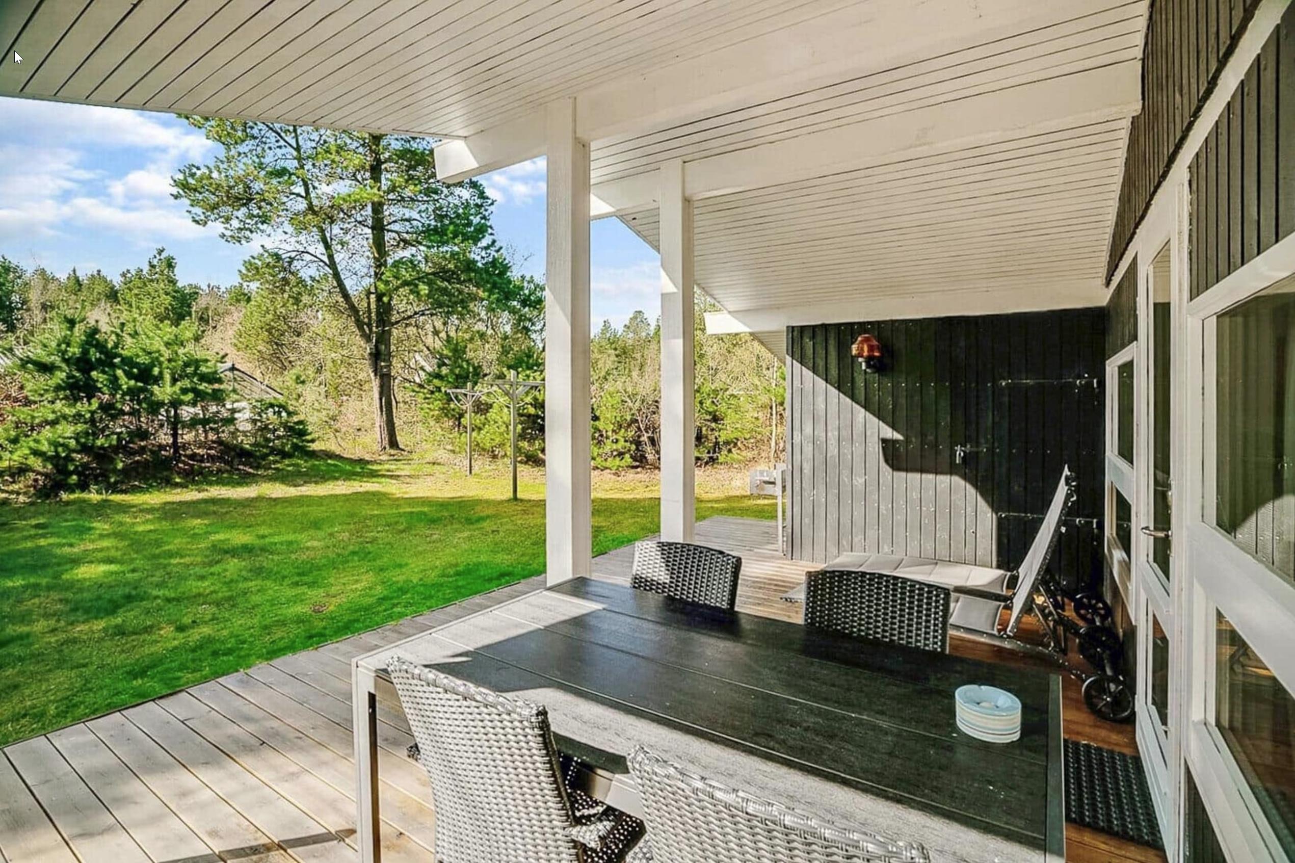 Udendørs finder I en dejlig naturgrund omgivet af træer, hvor I kan nyde roen og lydene fra naturen. Den store, delvist overdækkede terrasse er perfekt til morgenmad i solen, grillmiddage eller stille aftener under åben himmel.
