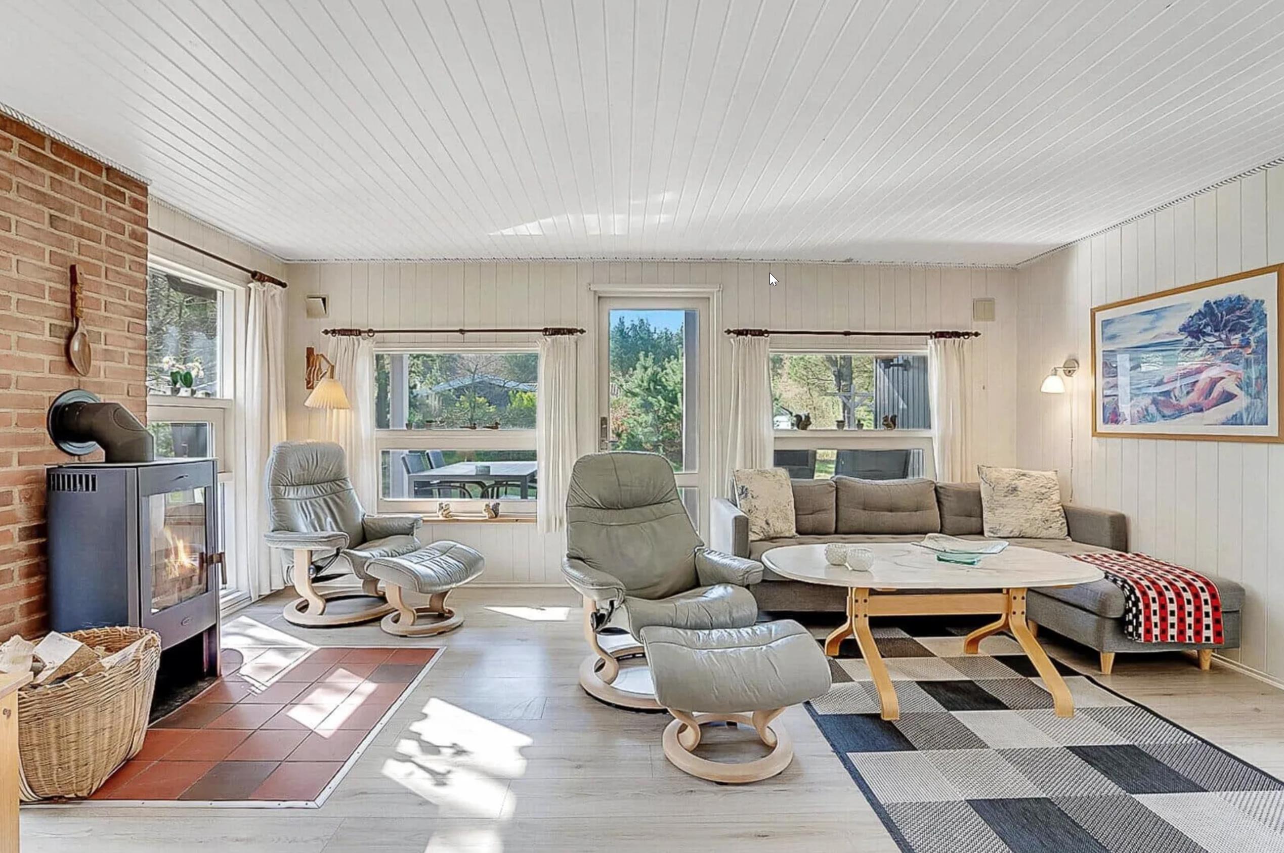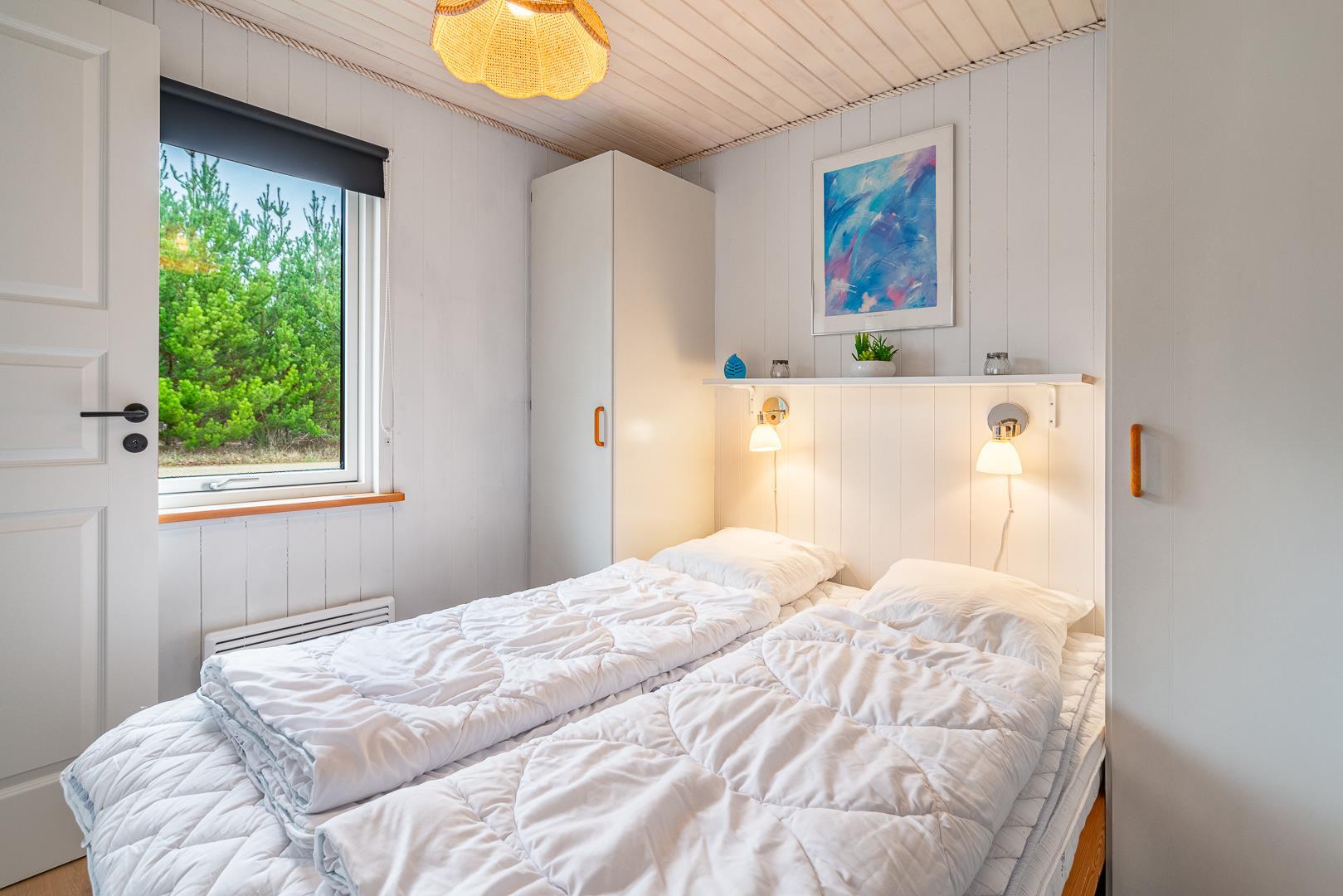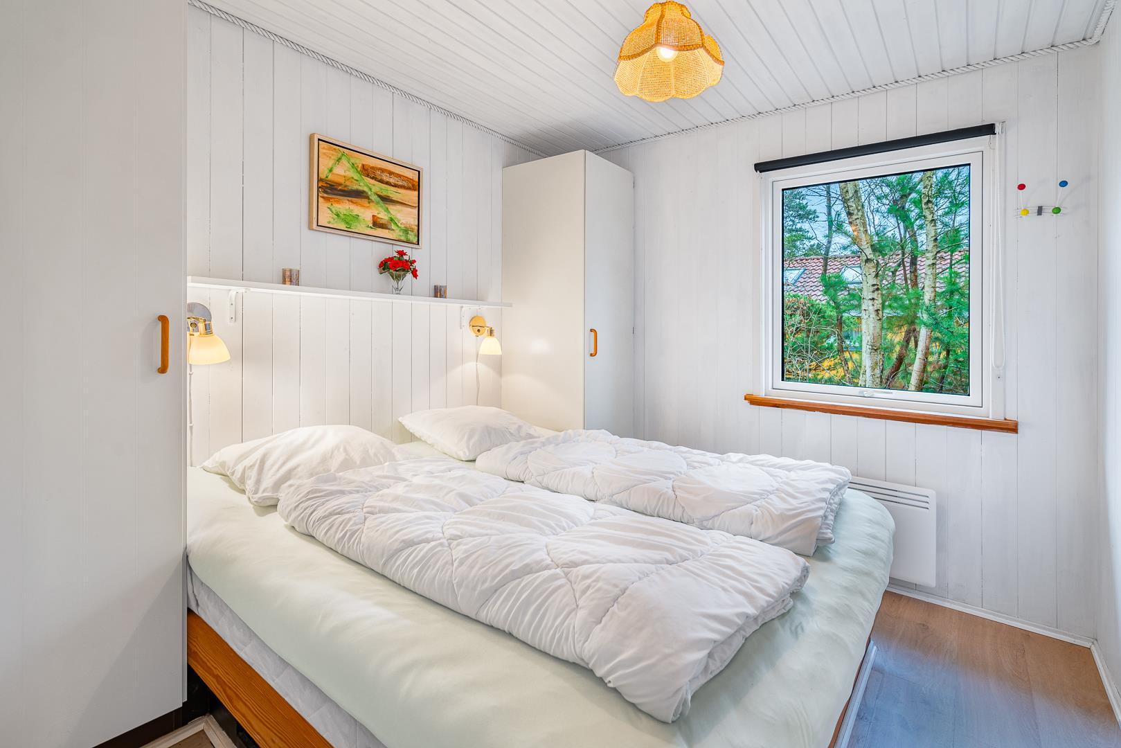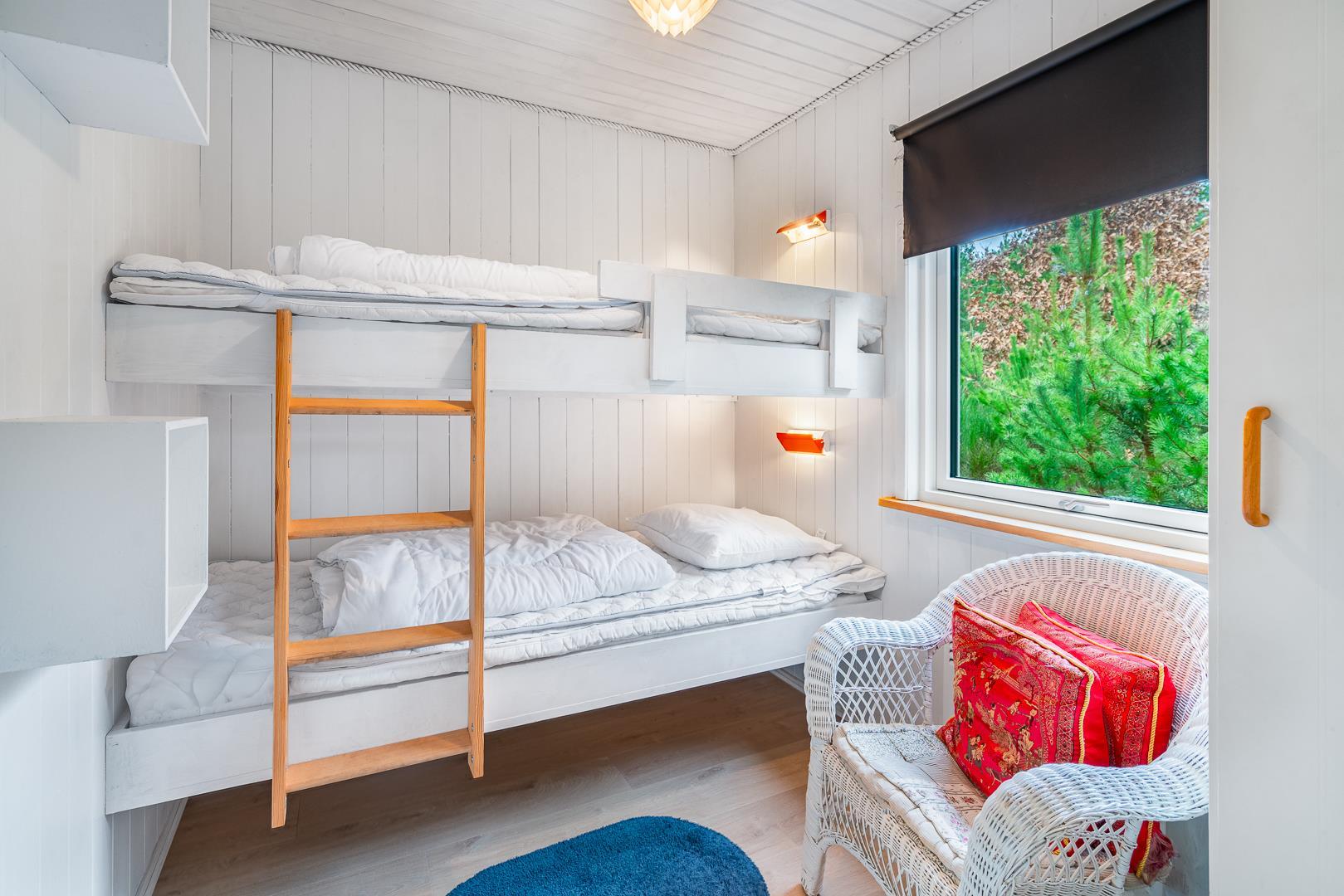 Sommerhuset har tre soveværelser: to med dobbeltsenge og ét med køjeseng – perfekt til børn. Indretningen gør sommerhuset ideelt for familier med børn eller to par, der holder ferie sammen.