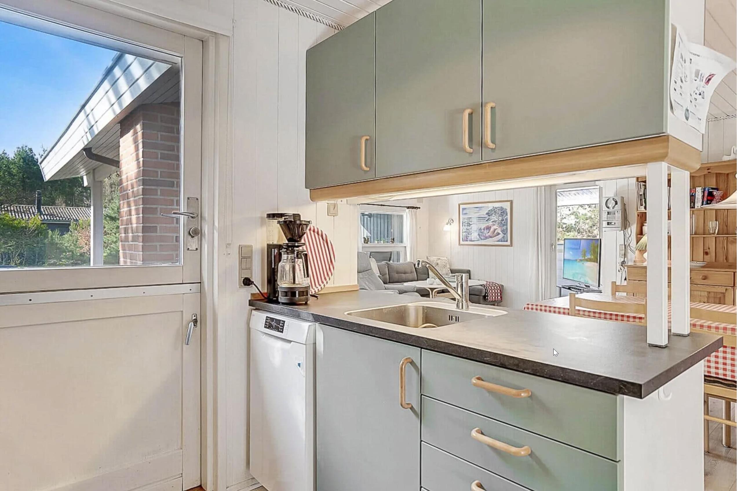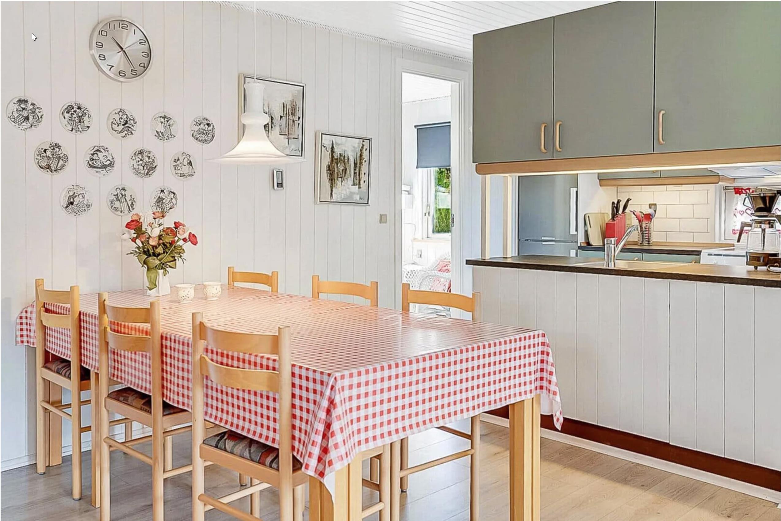 Køkkenet er veludstyret med alt, hvad I behøver til madlavningen – herunder opvaskemaskine. Ved spisebordet kan I samle familien til hyggelige måltider, brætspil eller lange samtaler over et glas vin.