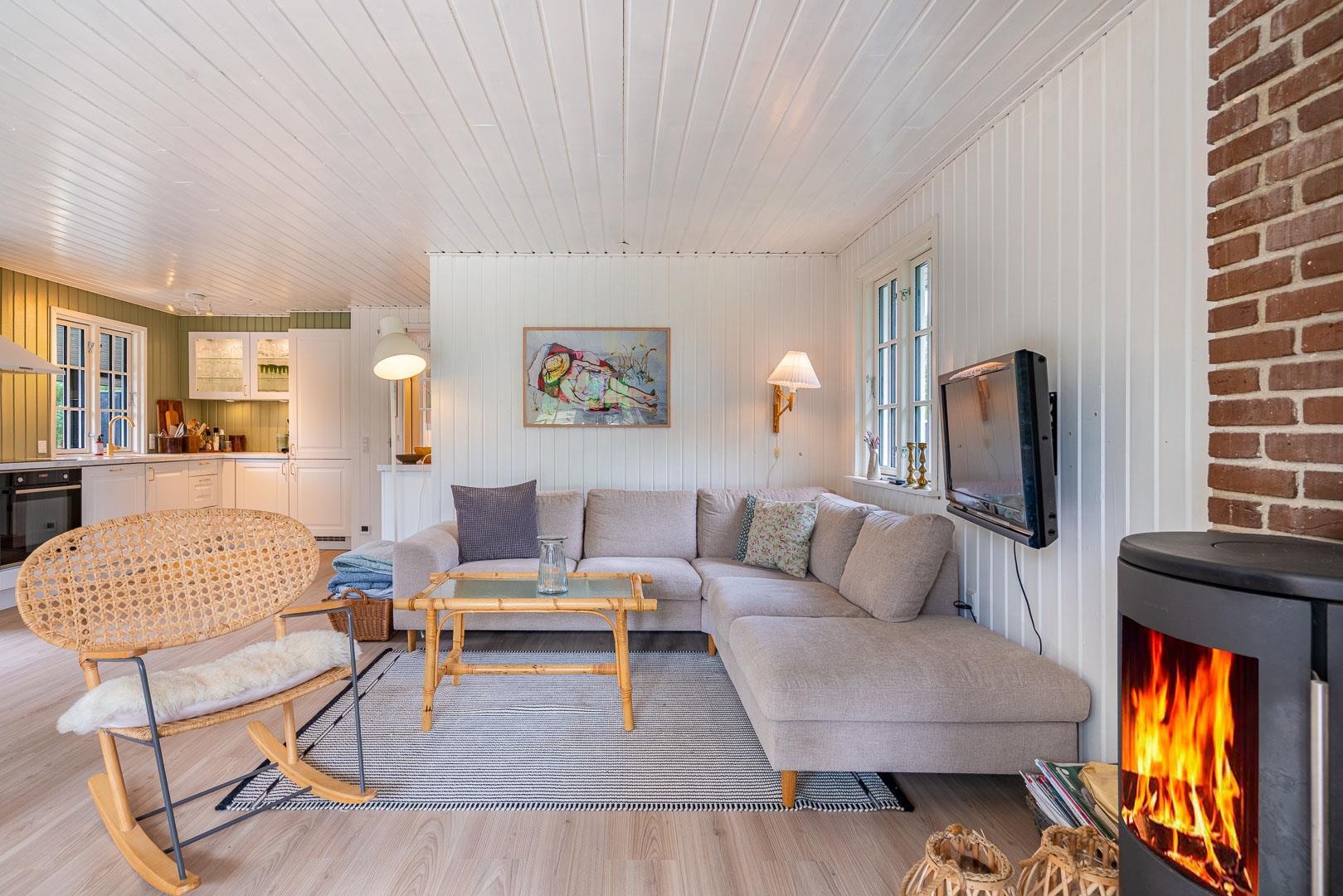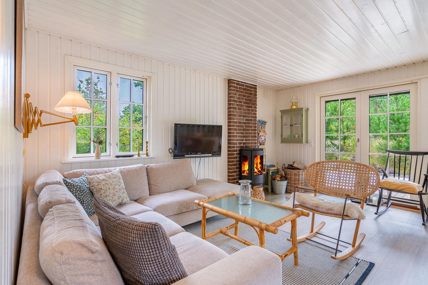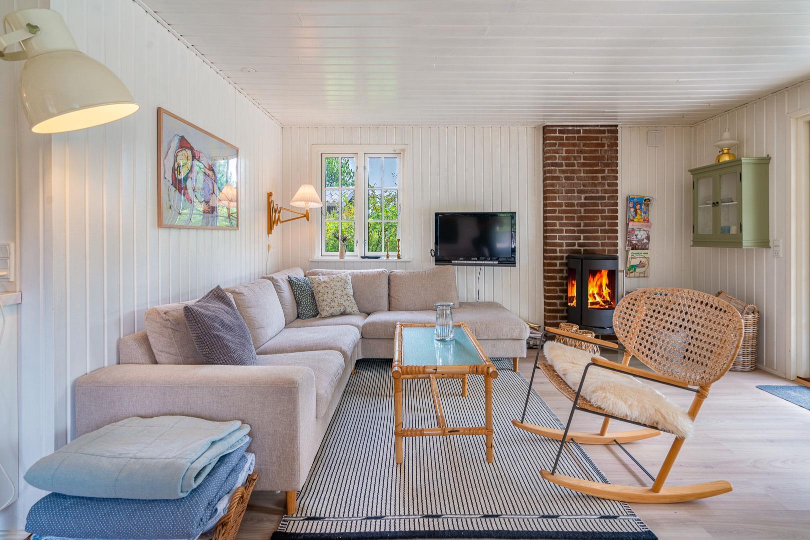 Sommerhuset blev renoveret i 2020 og byder på en dejlig, åben planløsning, hvor køkken, spisestue og opholdsstue smelter sammen til ét stort og lyst fællesrum. Her kan hele familien samles om madlavning, gode samtaler og brætspil, mens brændeovnen spreder varme og hyggestemning. Det veludstyrede køkken rummer bl.a. opvaskemaskine, så I kan bruge tiden på det vigtigste: nærvær og samvær.