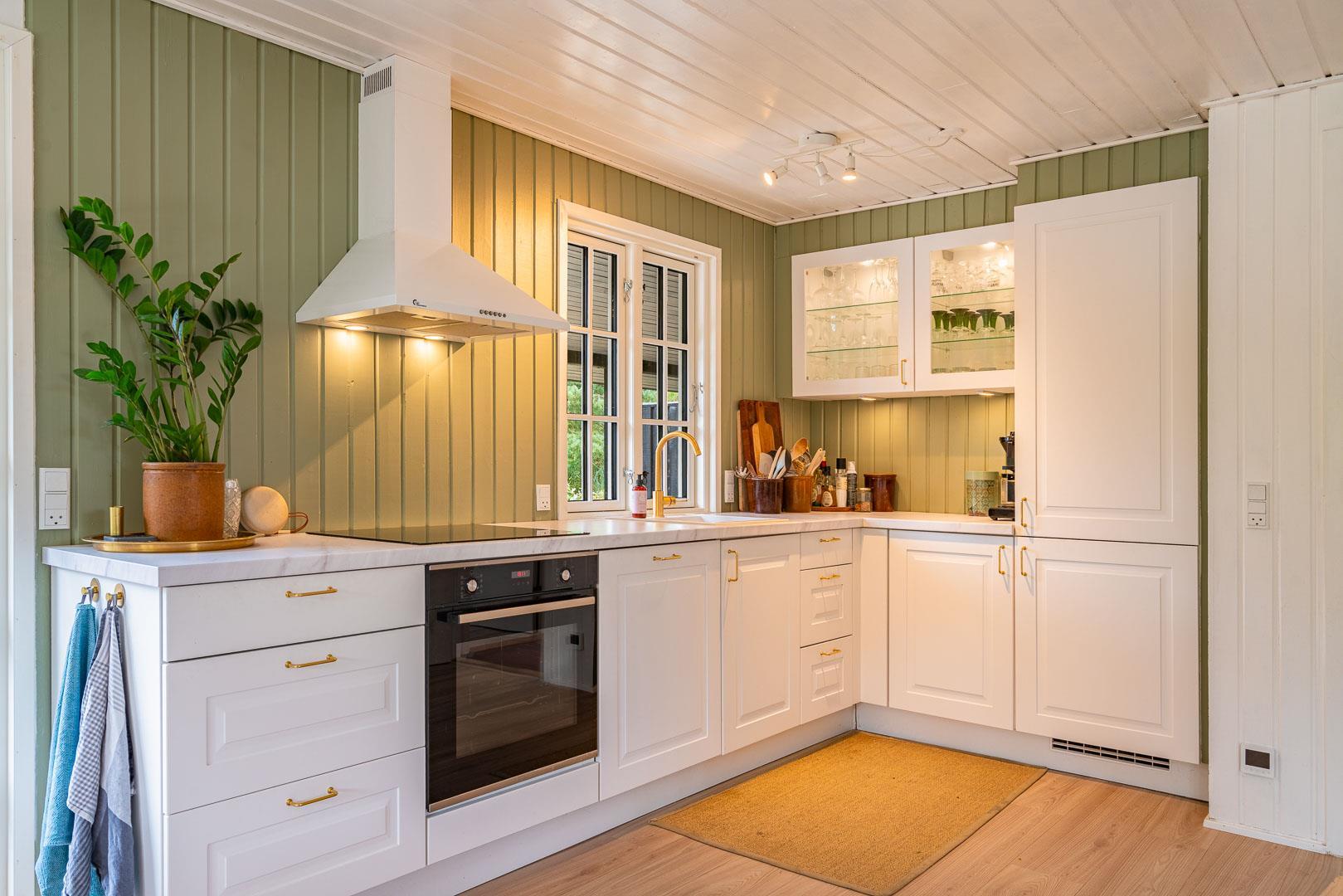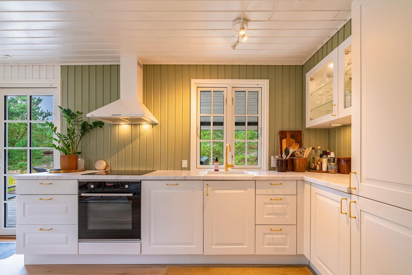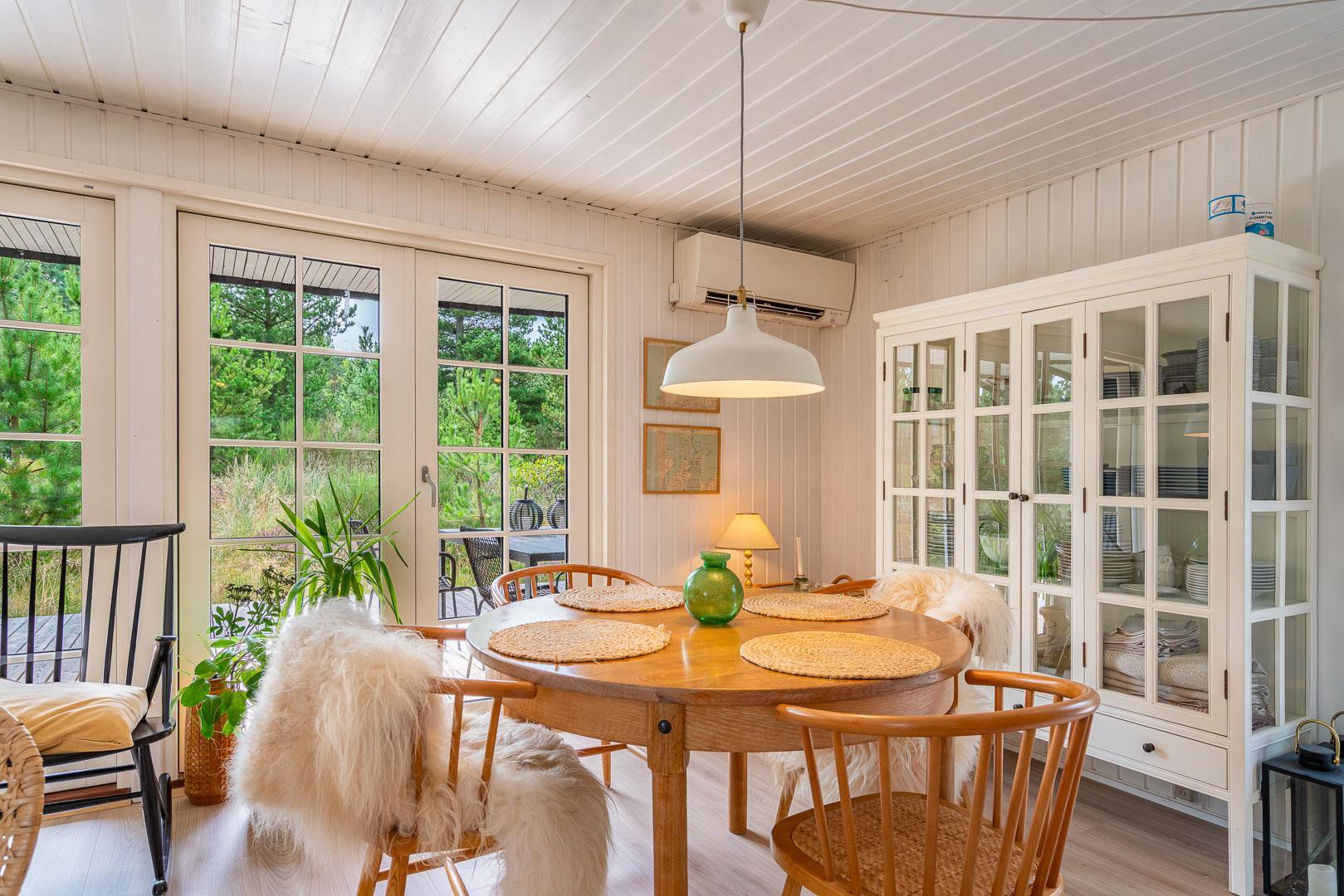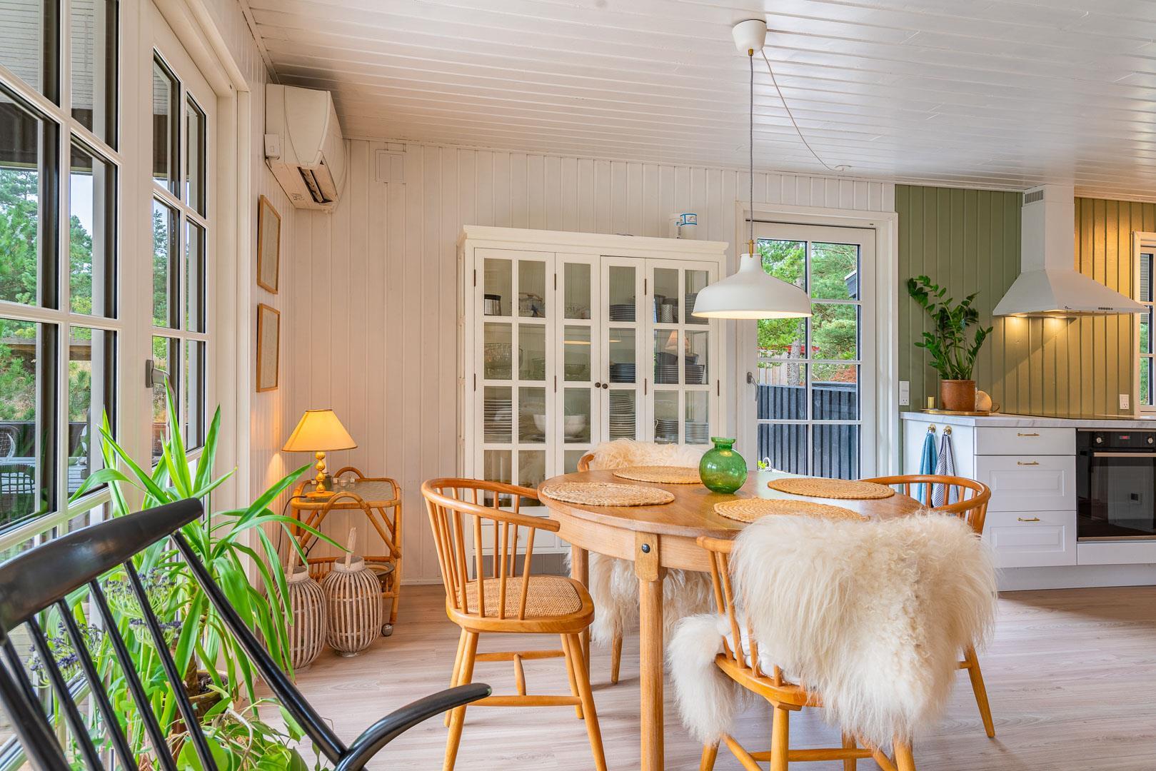 Sommerhuset blev renoveret i 2020 og byder på en dejlig, åben planløsning, hvor køkken, spisestue og opholdsstue smelter sammen til ét stort og lyst fællesrum. Her kan hele familien samles om madlavning, gode samtaler og brætspil, mens brændeovnen spreder varme og hyggestemning. Det veludstyrede køkken rummer bl.a. opvaskemaskine, så I kan bruge tiden på det vigtigste: nærvær og samvær.