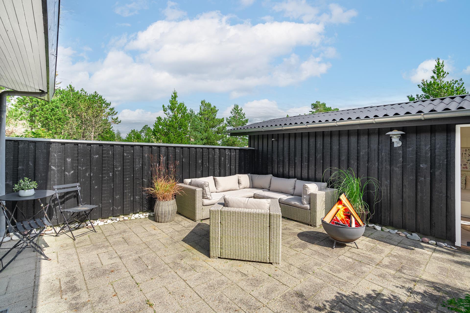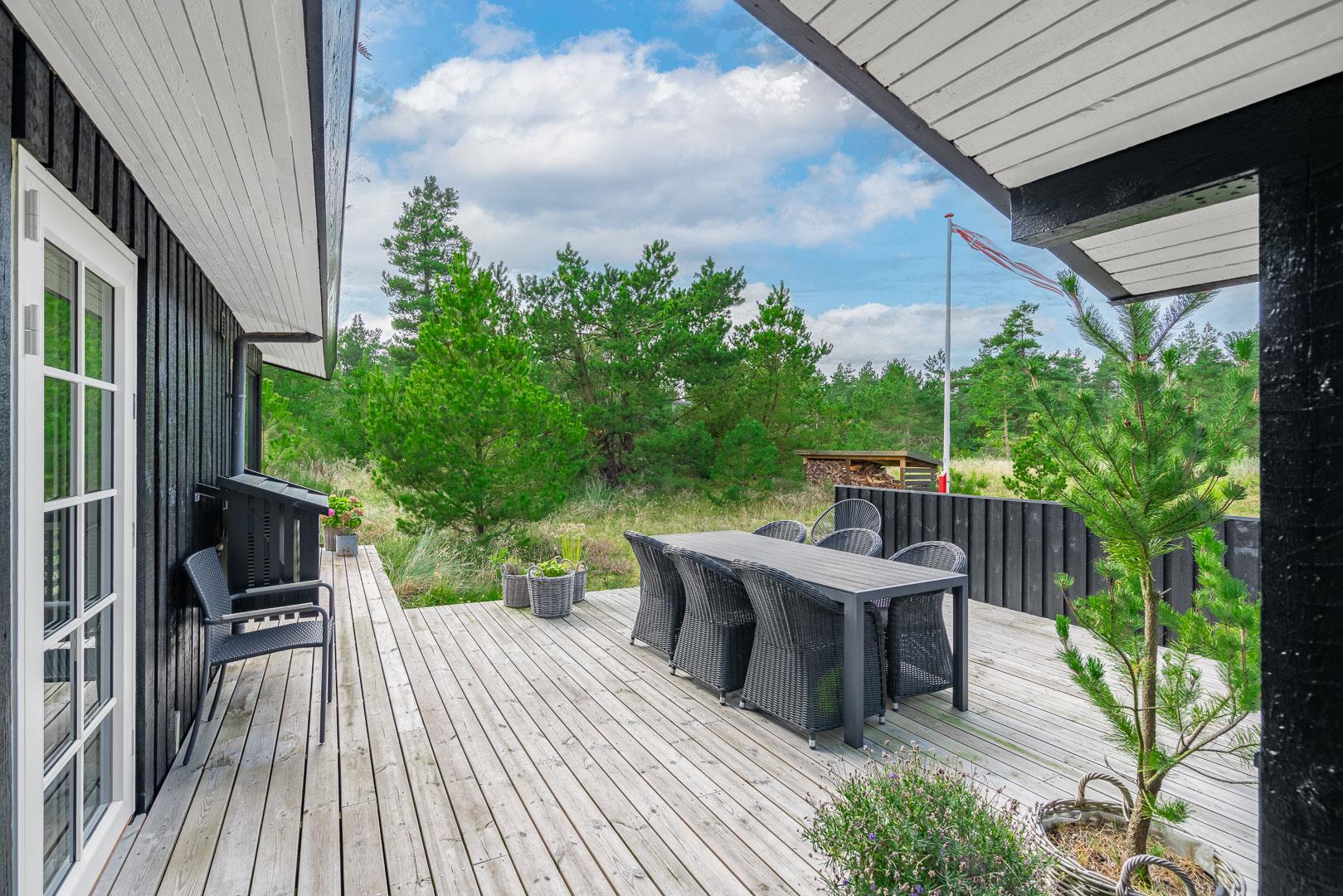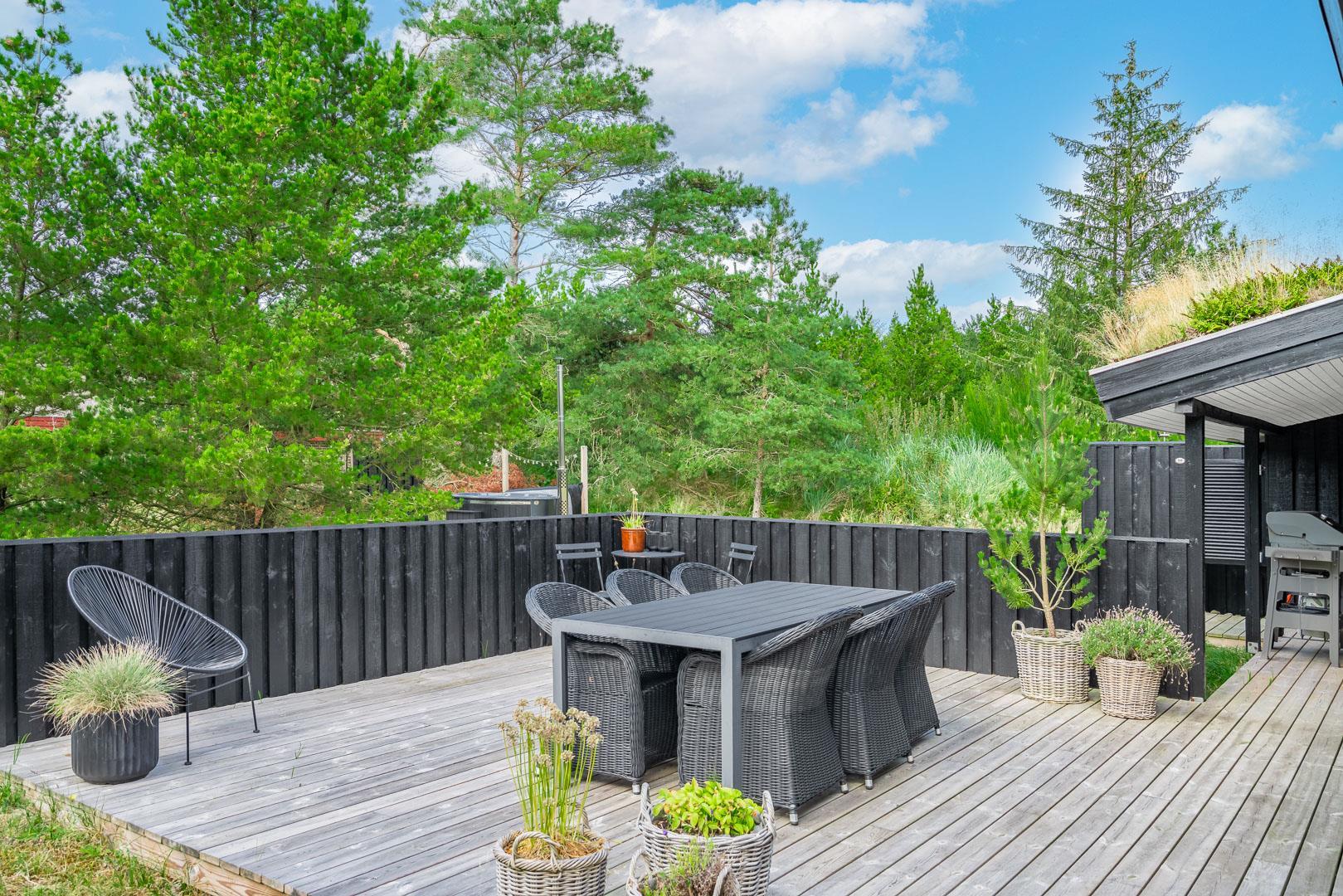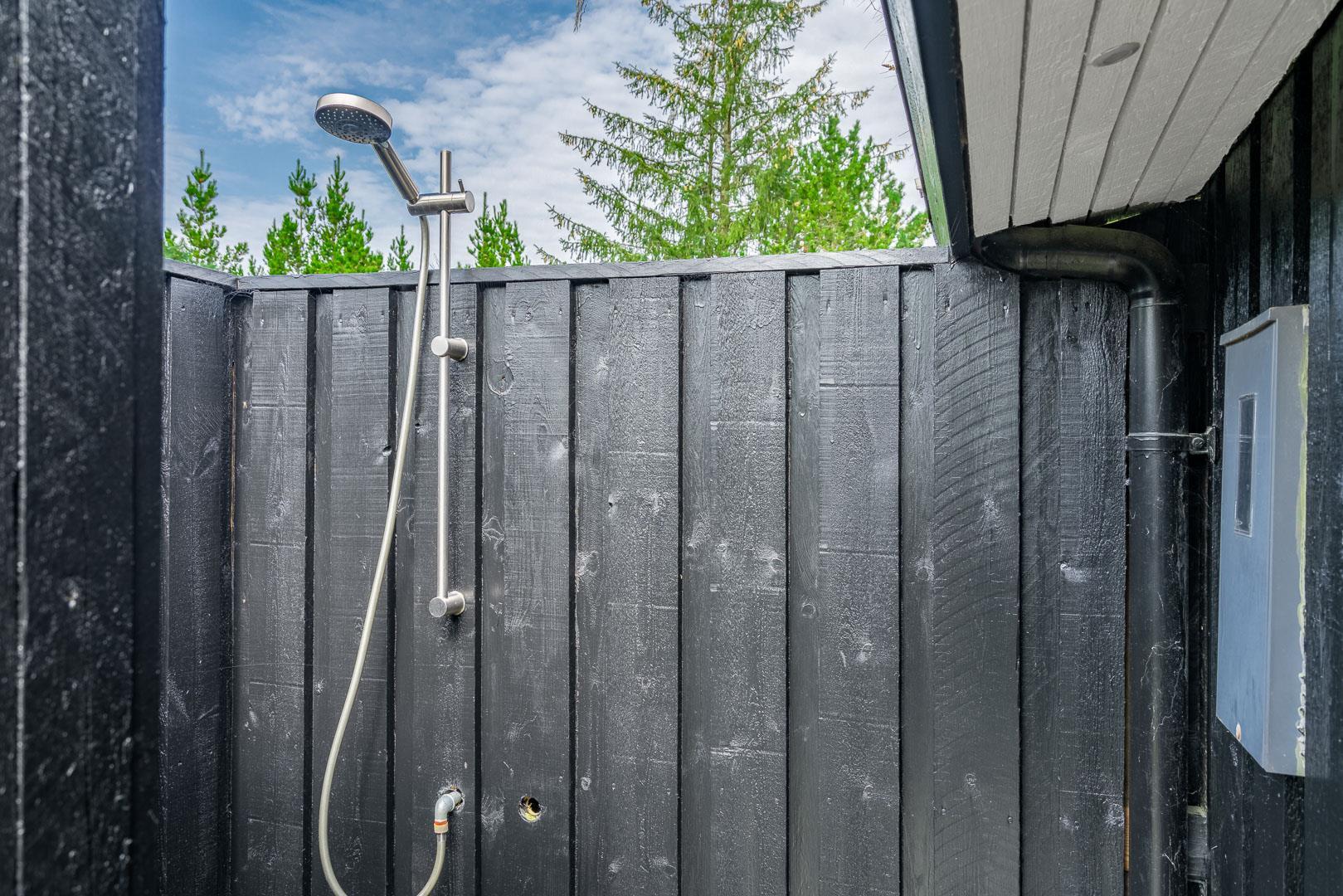 Den 1.200 m² store naturgrund er omkranset af træer og byder på masser af privatliv og plads til både leg og afslapning. På den solrige, rummelige terrasse kan I nyde dagens måltider, tænde op i grillen og lade feriemaden blive til under åben himmel. Efter en dag i naturen eller ved stranden kan I tage et forfriskende bad i den udendørs bruser og virkelig mærke ferien.